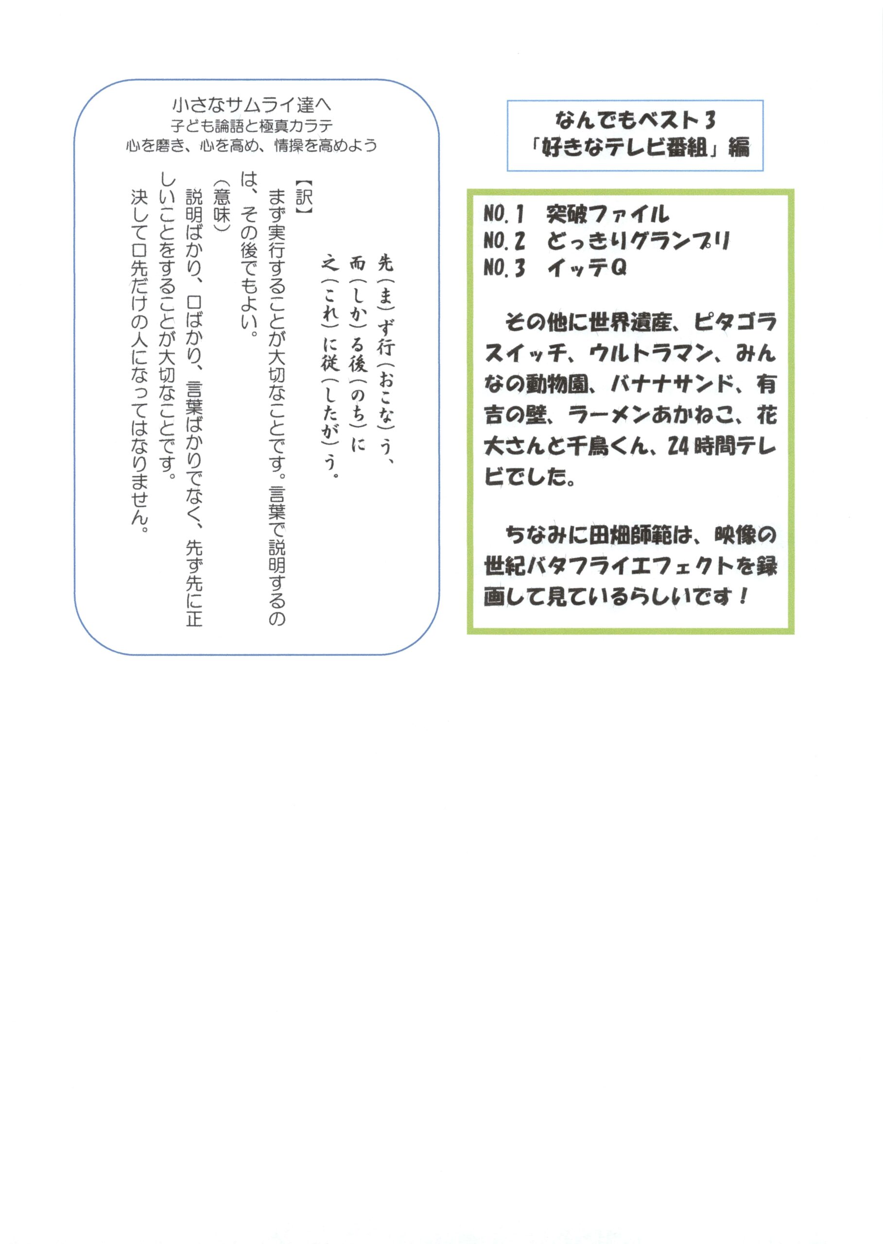 What's New 月刊小さなサムライ達へ「子ども論語と極真カラテ」 2024年8月号、アンケート「なん... 2024年8月16日 tabatadojo https://kyokushin-tabatadojo.com/wp/wp-content/uploads/2020/01/logo_main01.png 田畑道場