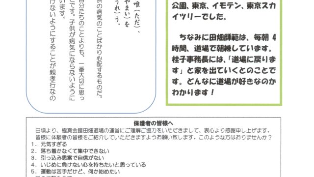 月刊小さなサムライ達へ 月刊小さなサムライ達へ「子ども論語と極真カラテ」 2025年3月号、アンケート「なん... 2025年3月18日 tabatadojo https://kyokushin-tabatadojo.com/wp/wp-content/uploads/2020/01/logo_main01.png 田畑道場