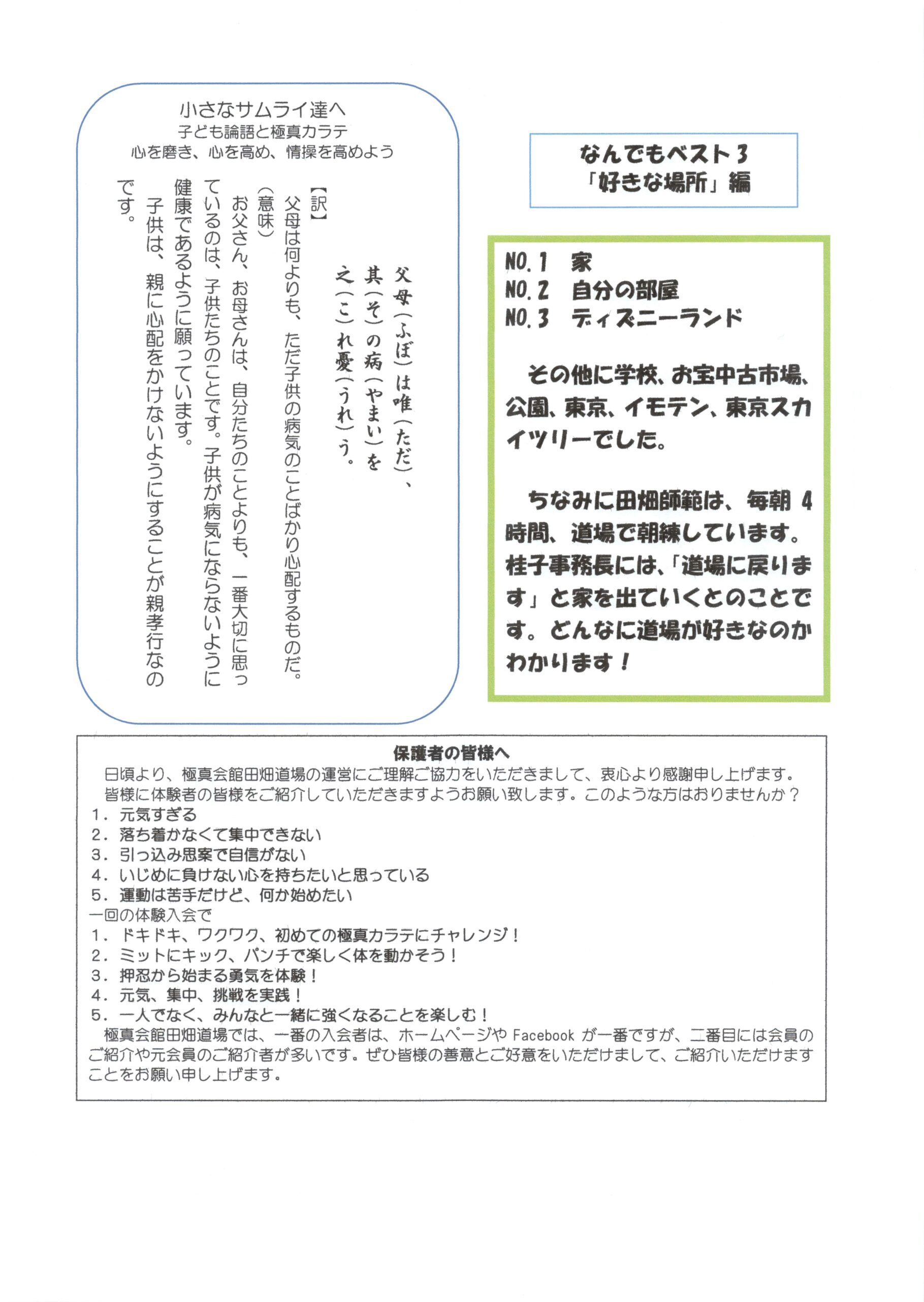 What's New 月刊小さなサムライ達へ「子ども論語と極真カラテ」 2022年2月号、アンケート「なん... 2022年2月5日 tabatadojo https://kyokushin-tabatadojo.com/wp/wp-content/uploads/2020/01/logo_main01.png 田畑道場