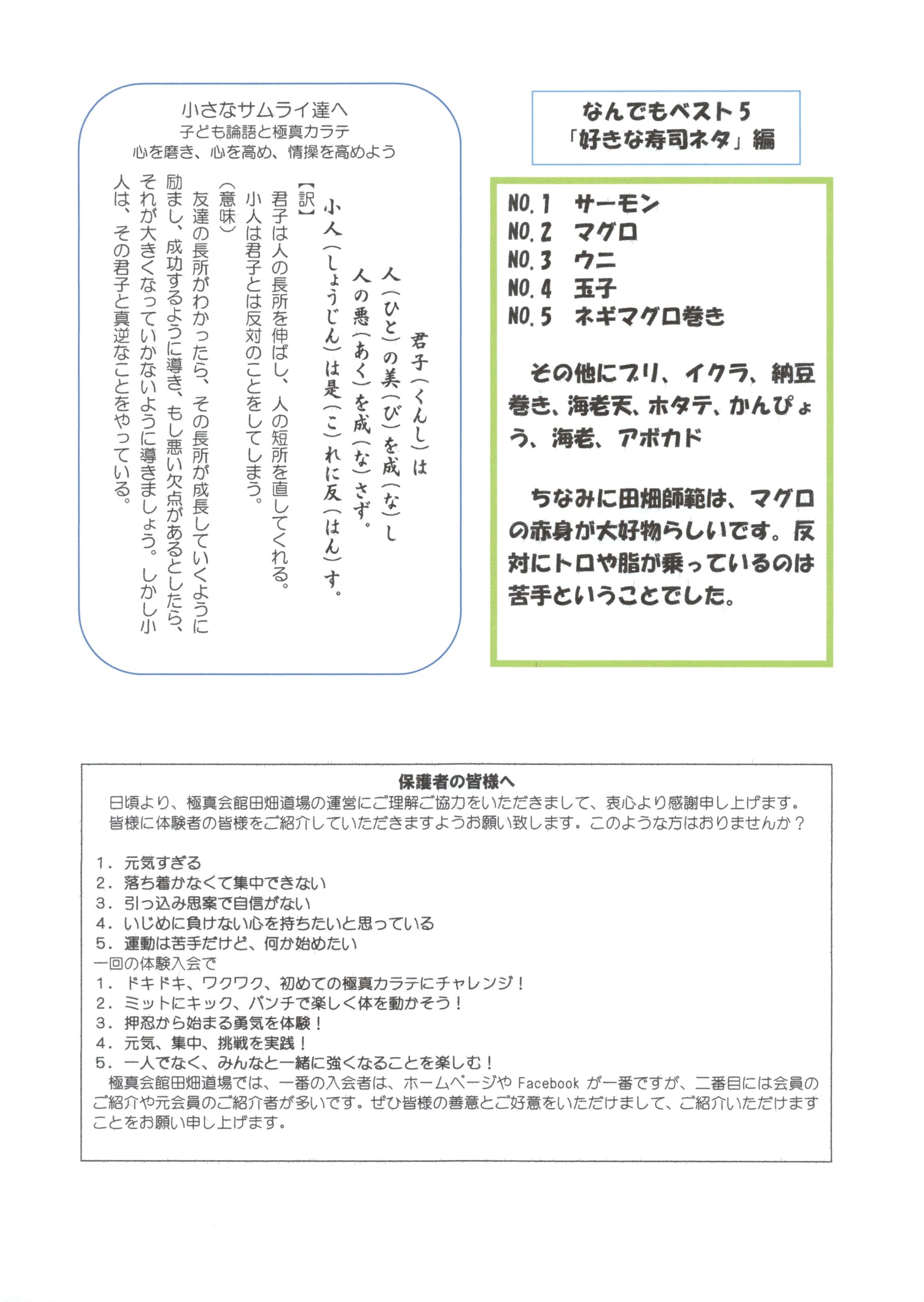 月刊小さなサムライ達へ 月刊小さなサムライ達へ「子ども論語と極真カラテ」 2024年4月号、アンケート「なん... 2024年4月15日 tabatadojo https://kyokushin-tabatadojo.com/wp/wp-content/uploads/2020/01/logo_main01.png 田畑道場