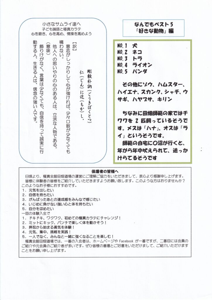 月刊小さなサムライ達へ 月刊小さなサムライ達へ「子ども論語と極真カラテ」 2025年3月号、アンケート「なん... 2025年3月18日 tabatadojo https://kyokushin-tabatadojo.com/wp/wp-content/uploads/2020/01/logo_main01.png 田畑道場