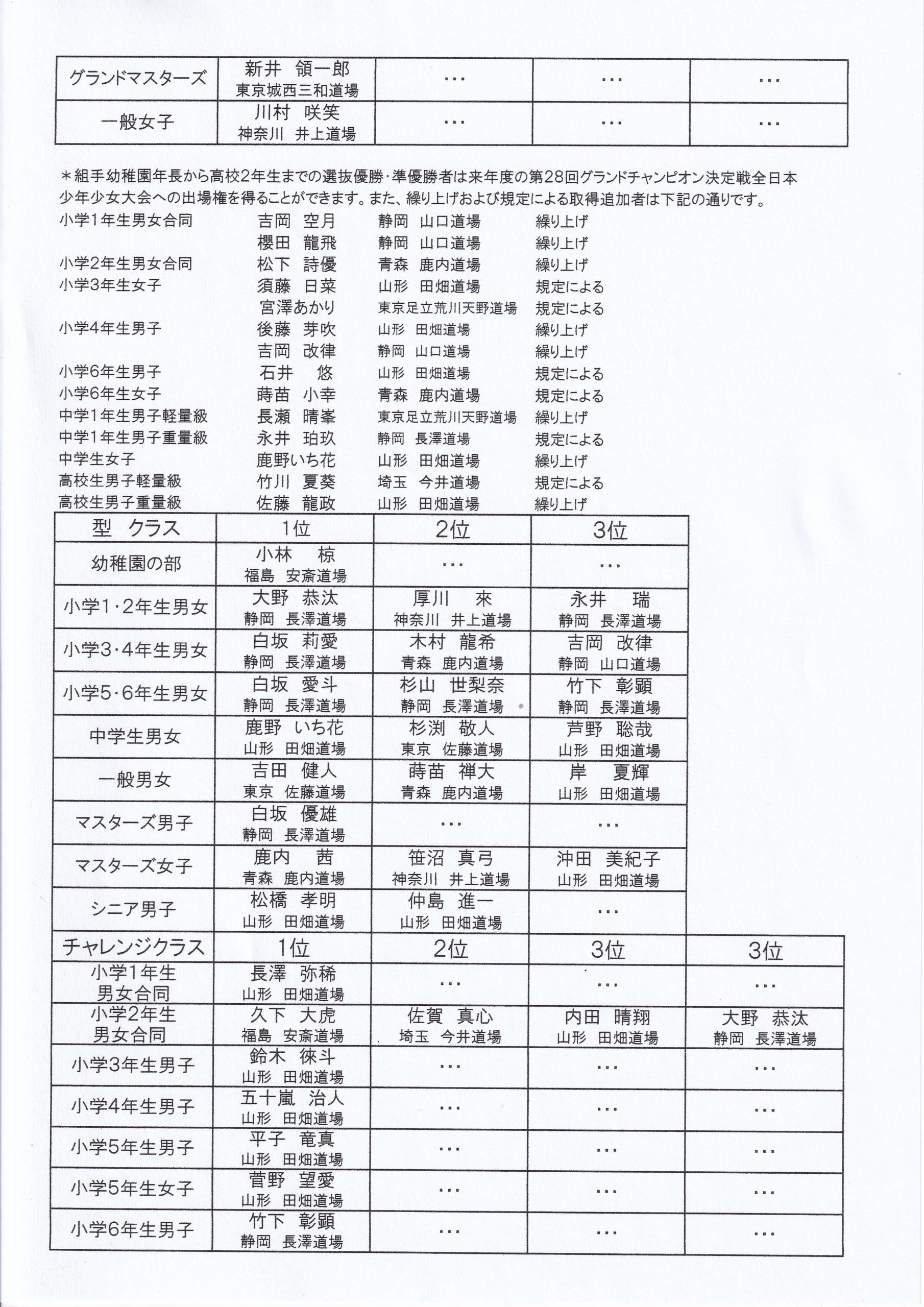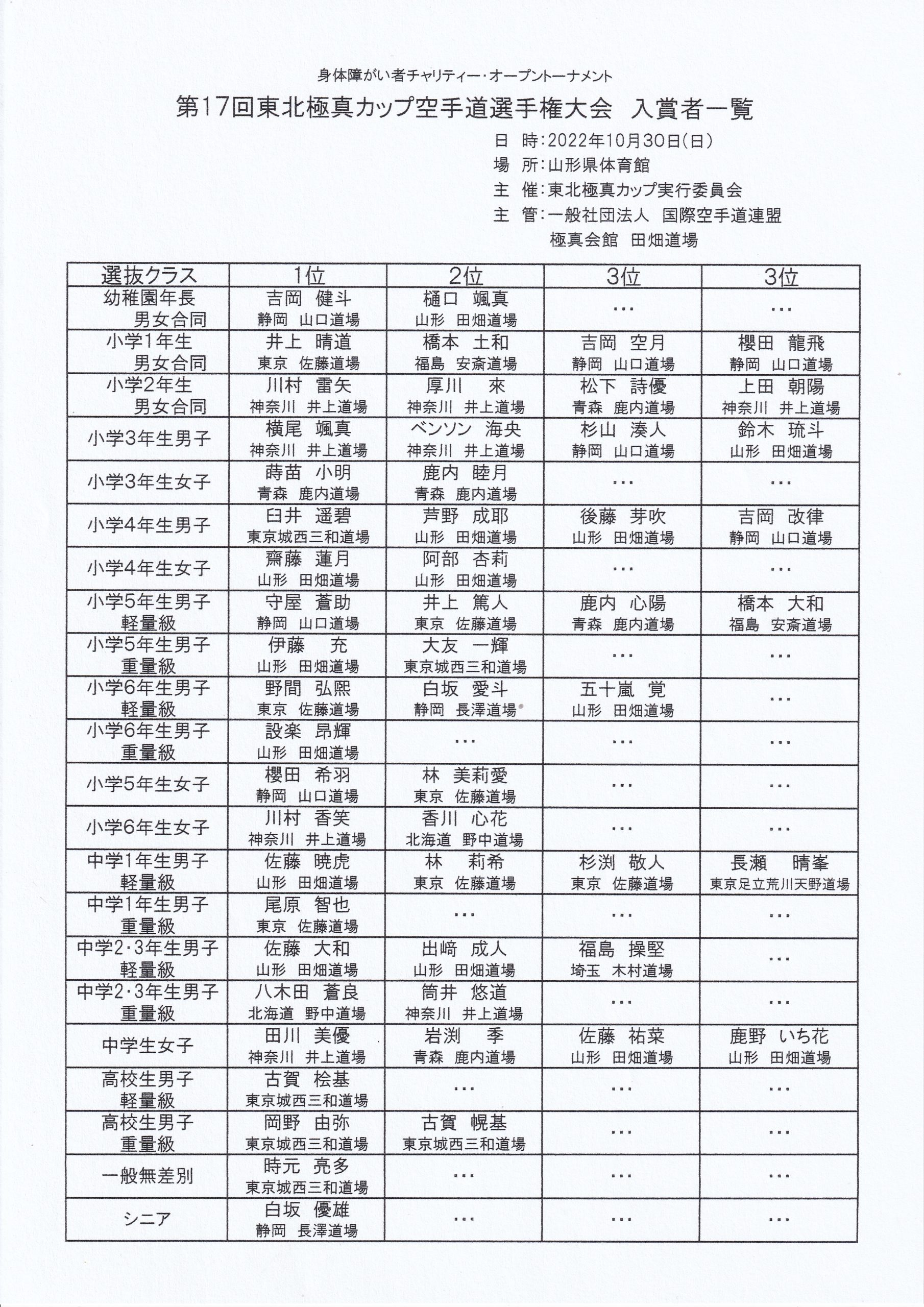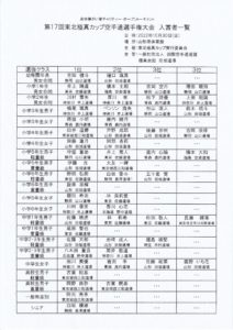 大会結果報告 第17回東北極真カップ空手道選手権大会結果 tabatadojo 2022年11月6日 繰り上がりのグラチャン権利獲得者について、現在、関西総本部に確認中です。追加があり次第、追記させていただきます。 画像をクリックすると拡大します。 グラチャン出場権繰り上げ取得追加者 小学5年生男子軽量級 橋本大和(福島 安斎道場)