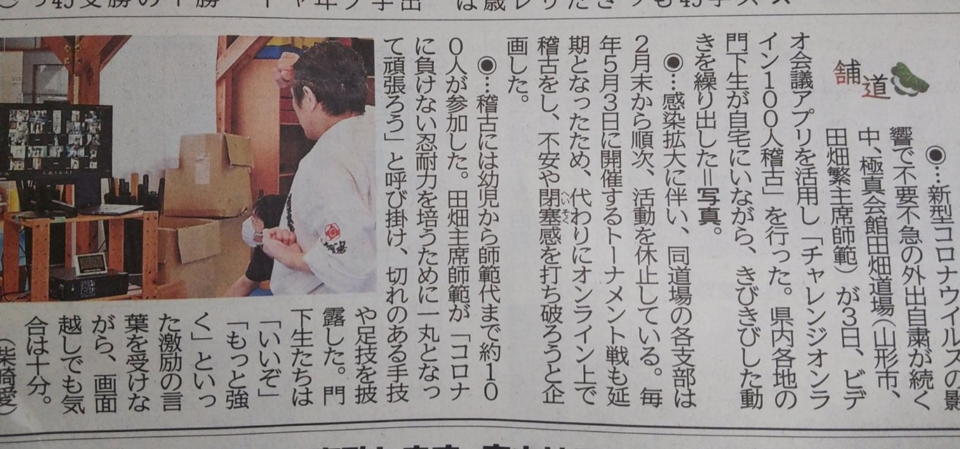 What's New 山形新聞にチャレンジオンライン100人稽古の記事が掲載されました! tabatadojo 2020年5月7日 5月4日(月)の山形新聞に「チャレンジオンライン100人稽古」の記事が掲載されました。ぜひ、ご覧ください!