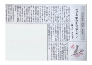 What's New 山形新聞に奥山情香さん(中山)の「少年少女の声」が掲載されました! tabatadojo 2020年4月25日 2020年4月24日の山形新聞に中山教室の奥山情香さんの「少年少女の声」が掲載されました。ぜひ、ご覧ください!