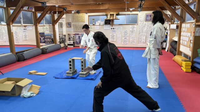 板を正拳と手刀で試割りをします。今回の稽古の集大成です。