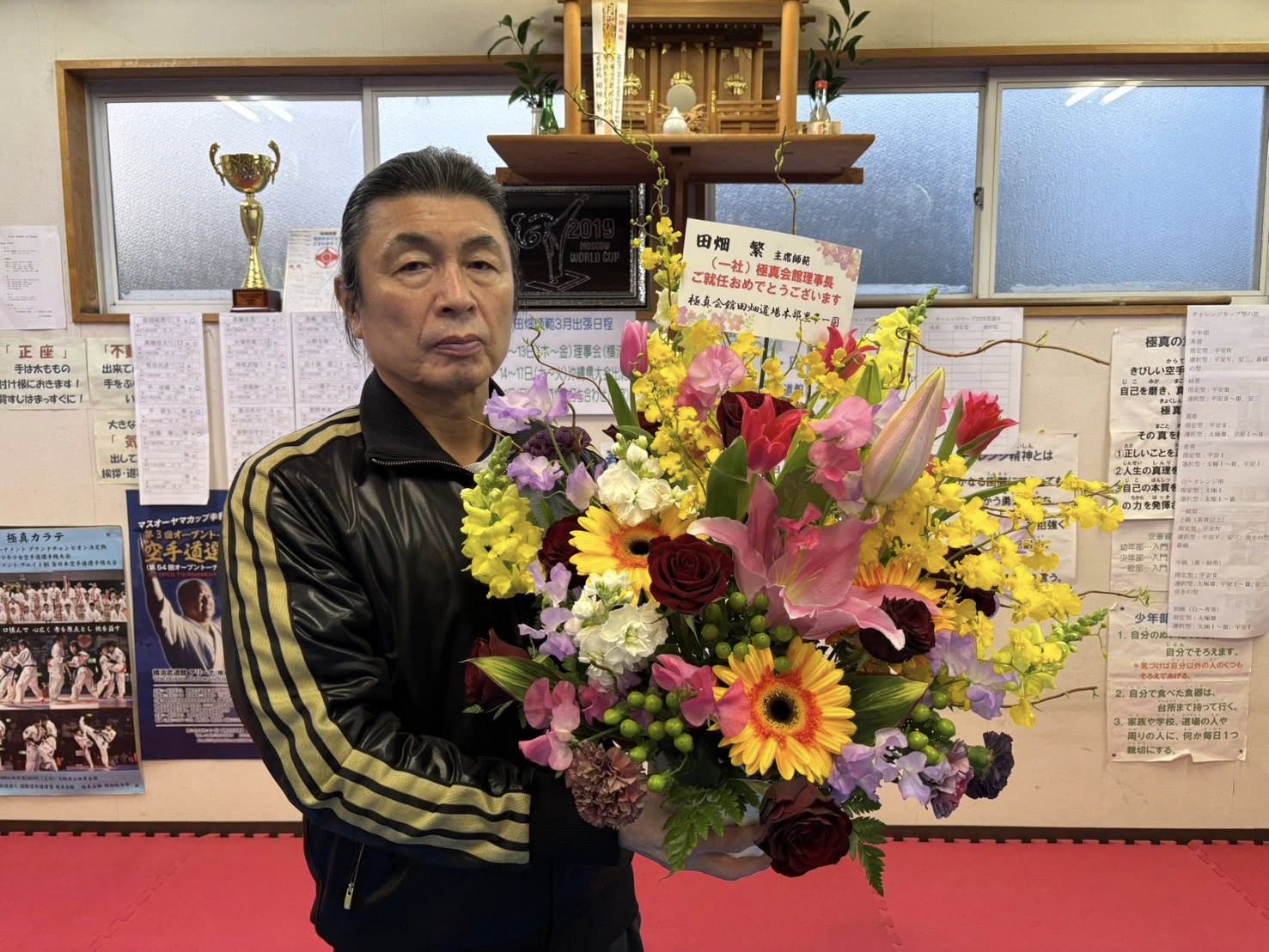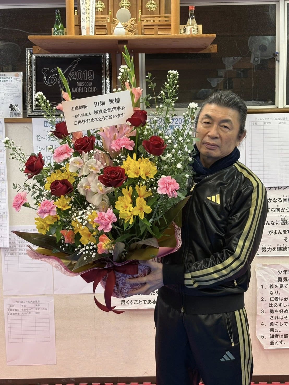 What's New 田畑繁主席師範、理事長再任! tabatadojo 2026年3月26日 田畑主席師範が 3月横浜で開催された一般法人国際空手道連盟 理事会にて合計7期目の理事長に選出されました 本部保護者会 本部黒帯会から美しく立派なお祝いの花束が贈られました 極真カラテの益々の普及発展 組織拡大 そして 今年の全日本大会 来年の世界大会 特に第1回世界型大会に向けて本格的に舵を取りました!