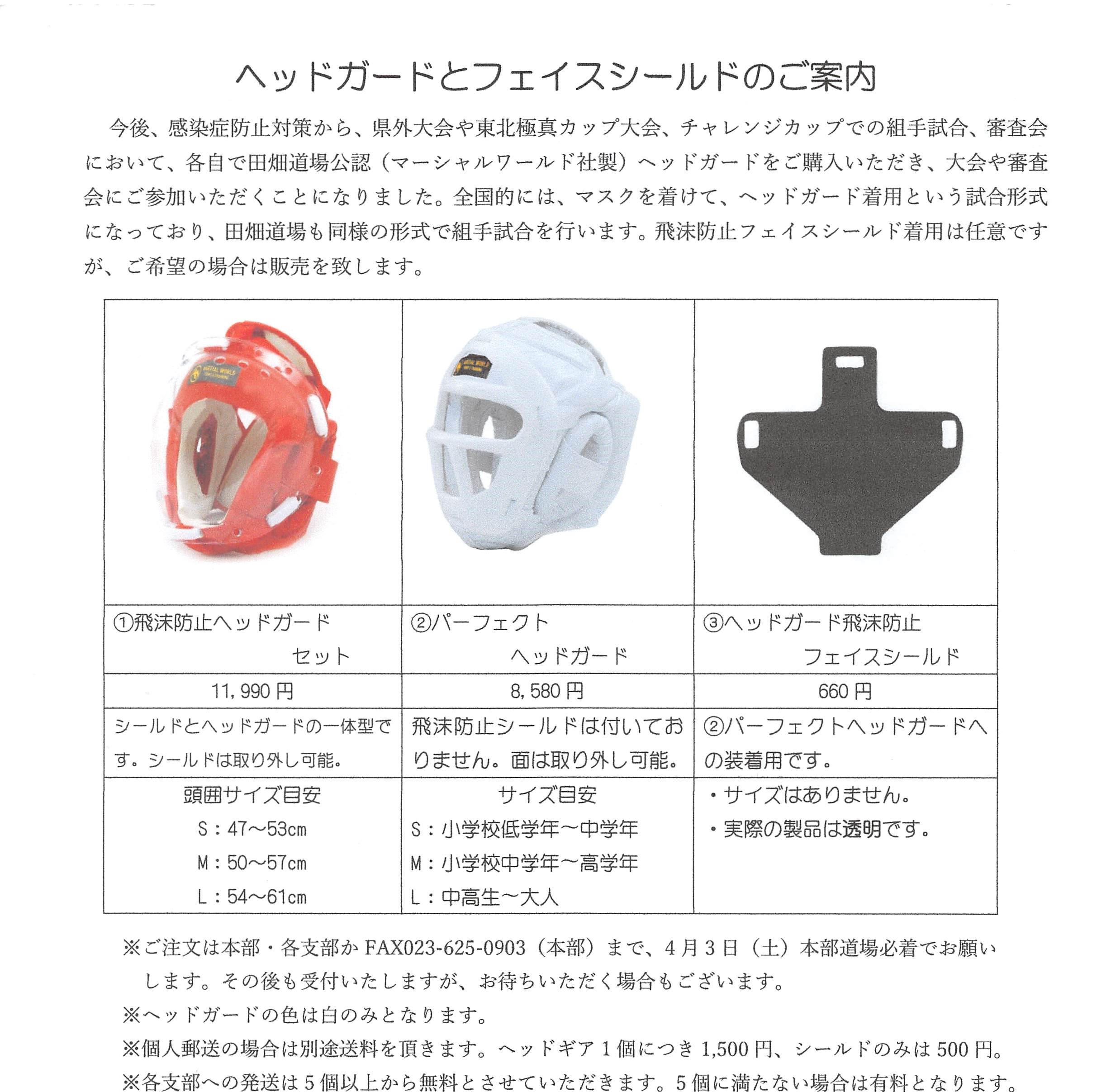 What's New 田畑道場公認ヘッドガード販売予約受付中! tabatadojo 2021年3月31日 感染防止対策から、大会での組手試合や審査会において、各自で公認ヘッドガードをご購入いただき、ご参加いただくことになりました。詳しくは、ご案内をご参照下さい。