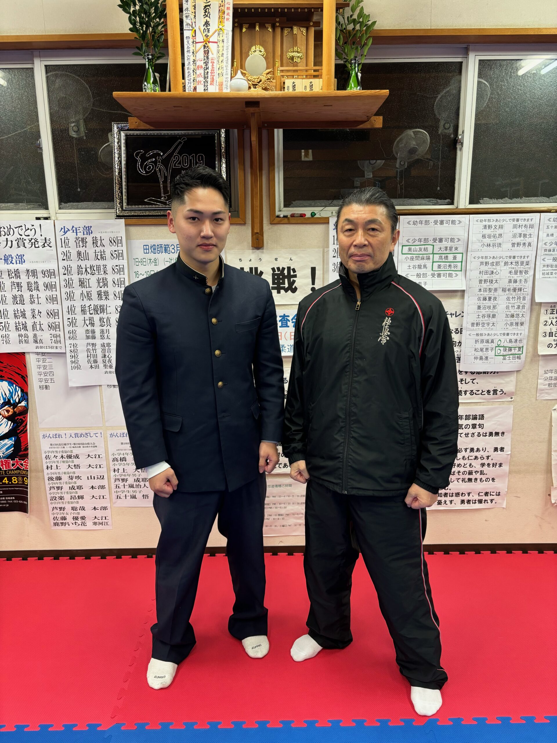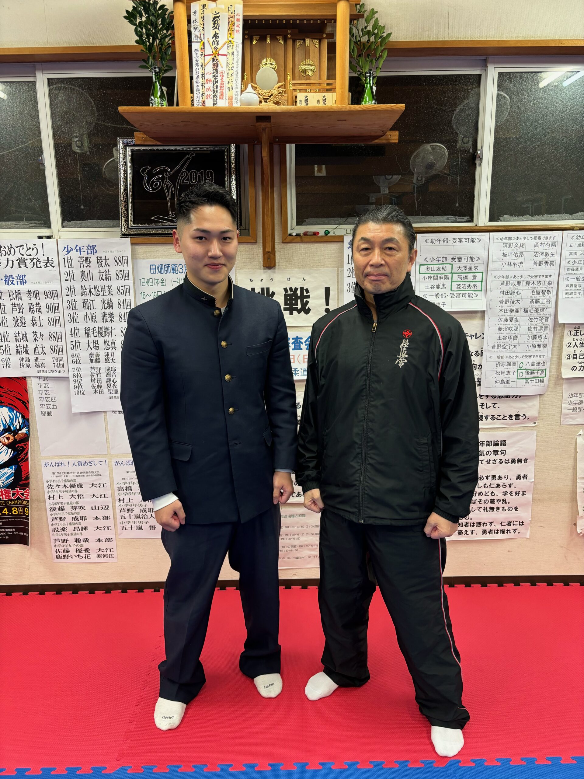 石井翔君は、小学1年生から中学3年生まで稽古を積み、高校からは日大山形高校のボクシング部で活躍しておりました。その実力が認められて、専修大学からスカウトされました。「これからの益々のご活躍を祈ると同時に、カラテで培った三合法での覇気、勇気をボクシング界での夢、ビジョン、目標をその手に掴むまで頑張ってほしい。」と田畑師範からお話しがありました。