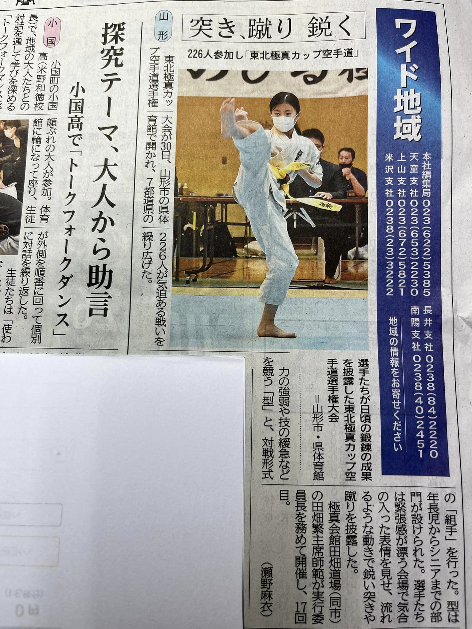 What's New 第17回東北極真カップ大会の記事が山形新聞に掲載されました! tabatadojo 2022年11月1日 山形新聞、10月31日号に、第17回東北極真カップ空手道選手権大会の記事が掲載されました。型シニア男子部では、本部道場生の左、松橋初段が優勝、右、仲島三級が準優勝という輝かしい成績を残しました‼️