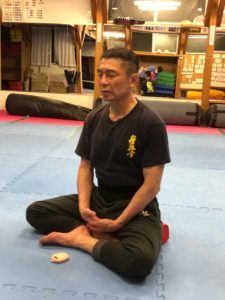 瞑想会が始まる前に田畑師範より、瞑想のいわれの説明がありました。はじめの5分間は有我一念の瞑想。これは大山総裁が身延山に籠り、瞑想している時に嵐が来て木々の音がうるさくて精神が統一されませんでしたが、一心に木々の音を聞いていた刹那に静寂が訪れて大自然と一体になった体験をされたことから、極真円心の呼吸瞑想といういわれになりましたと。