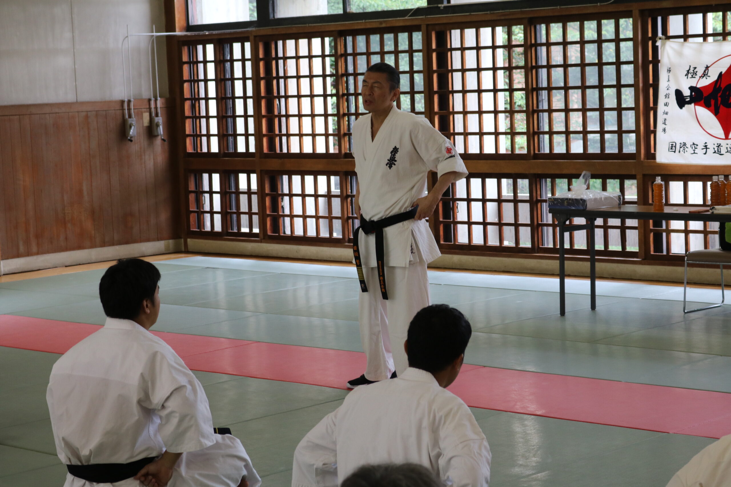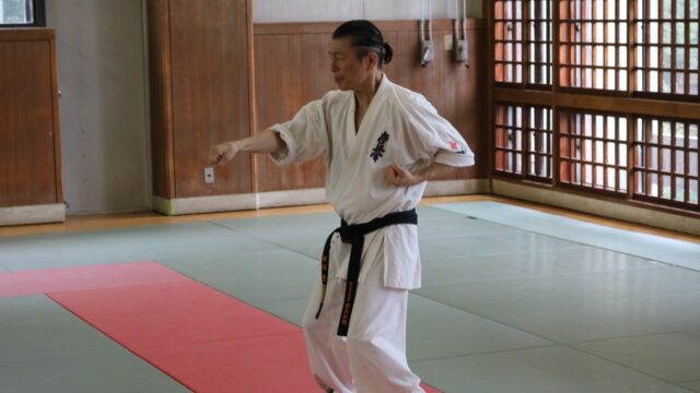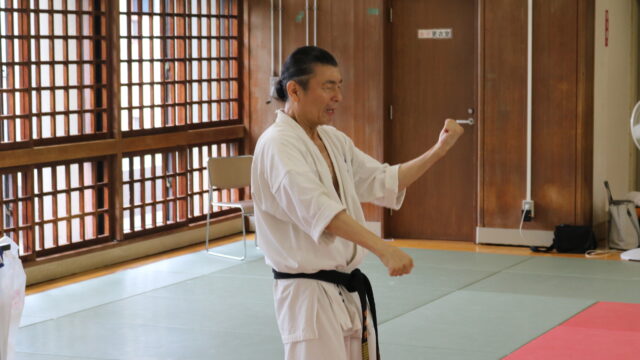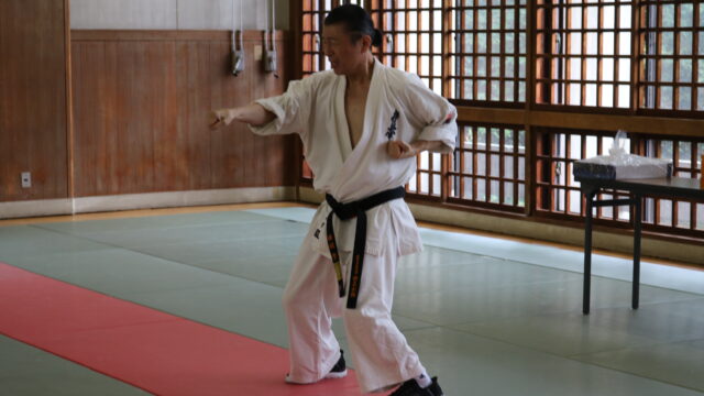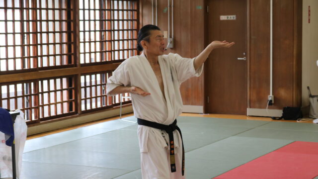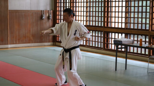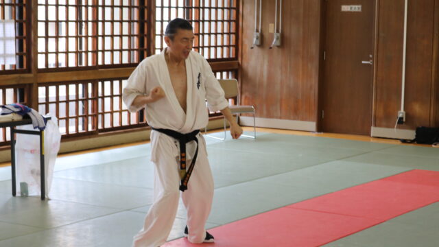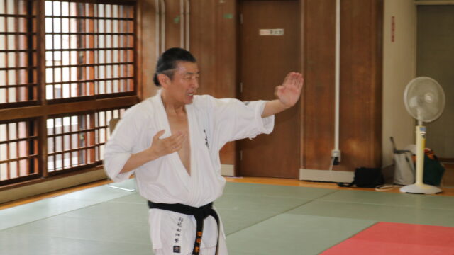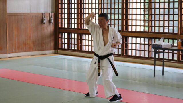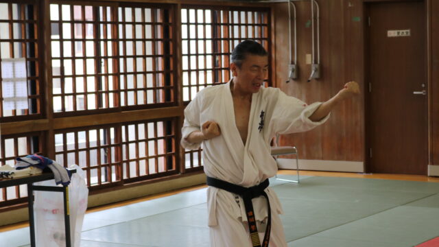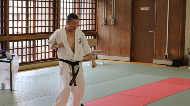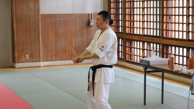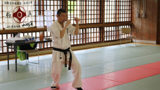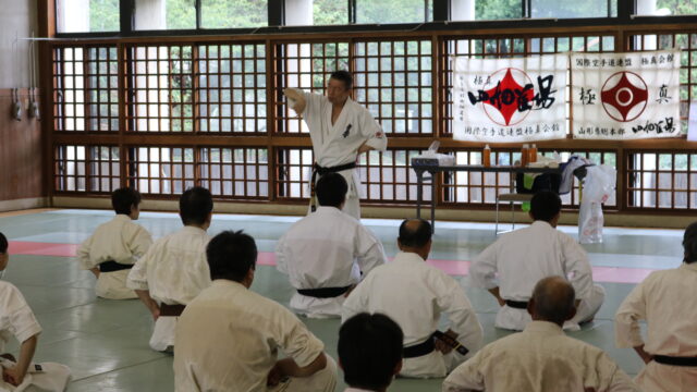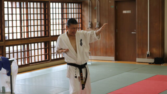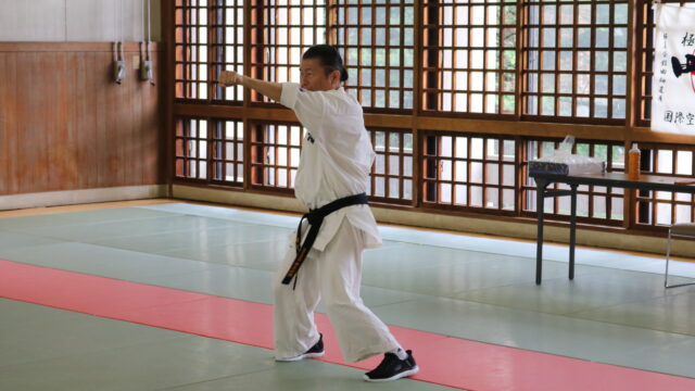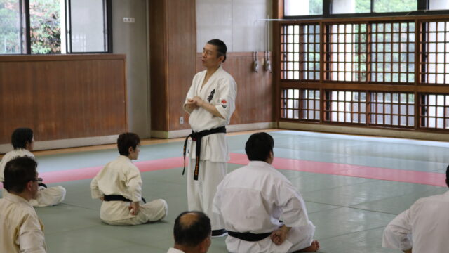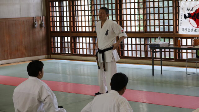 冒頭、田畑師範より「極真カラテは基本ではじまり、基本で終わる。三合法により、自分の生命力を最大限に高め自己完成、自己実現を目指していく。」ことを実技を交えての訓話がありました。