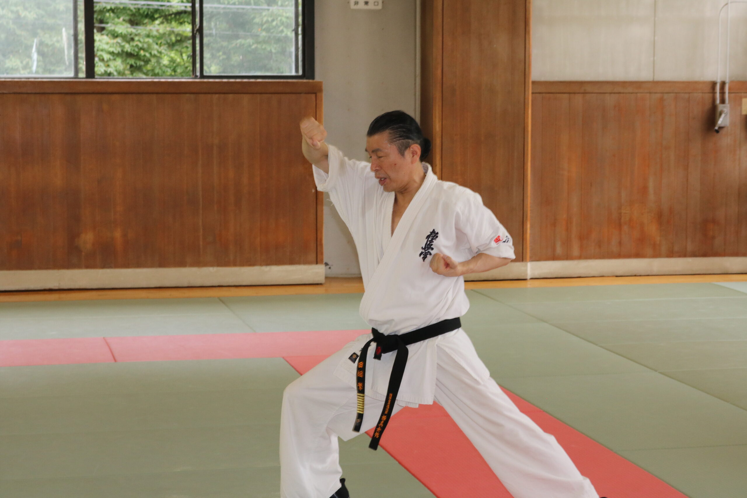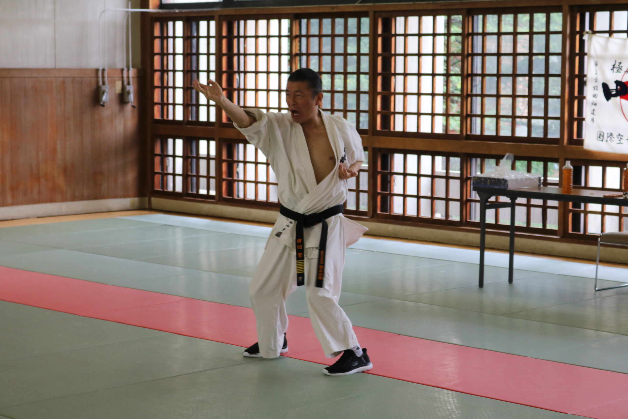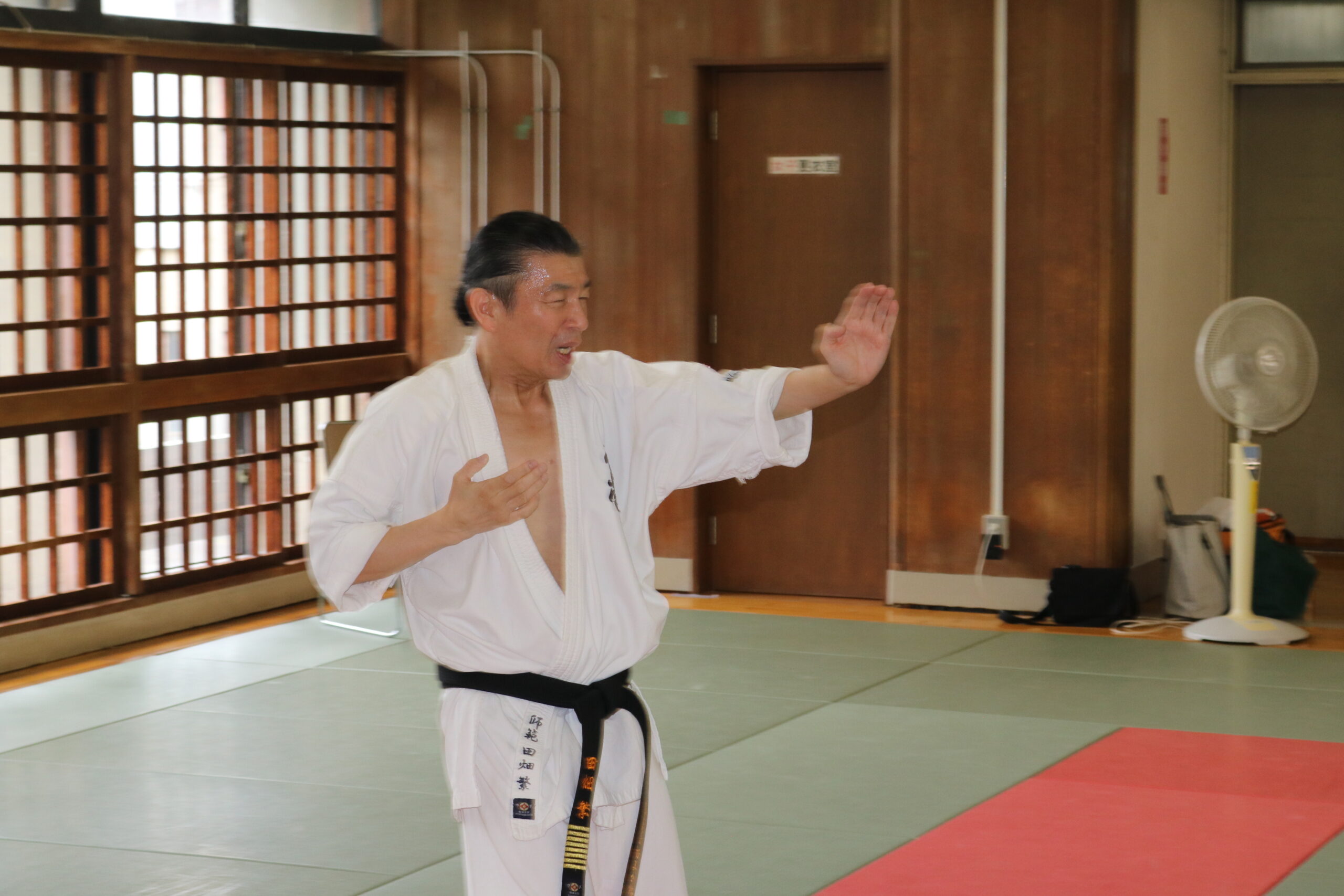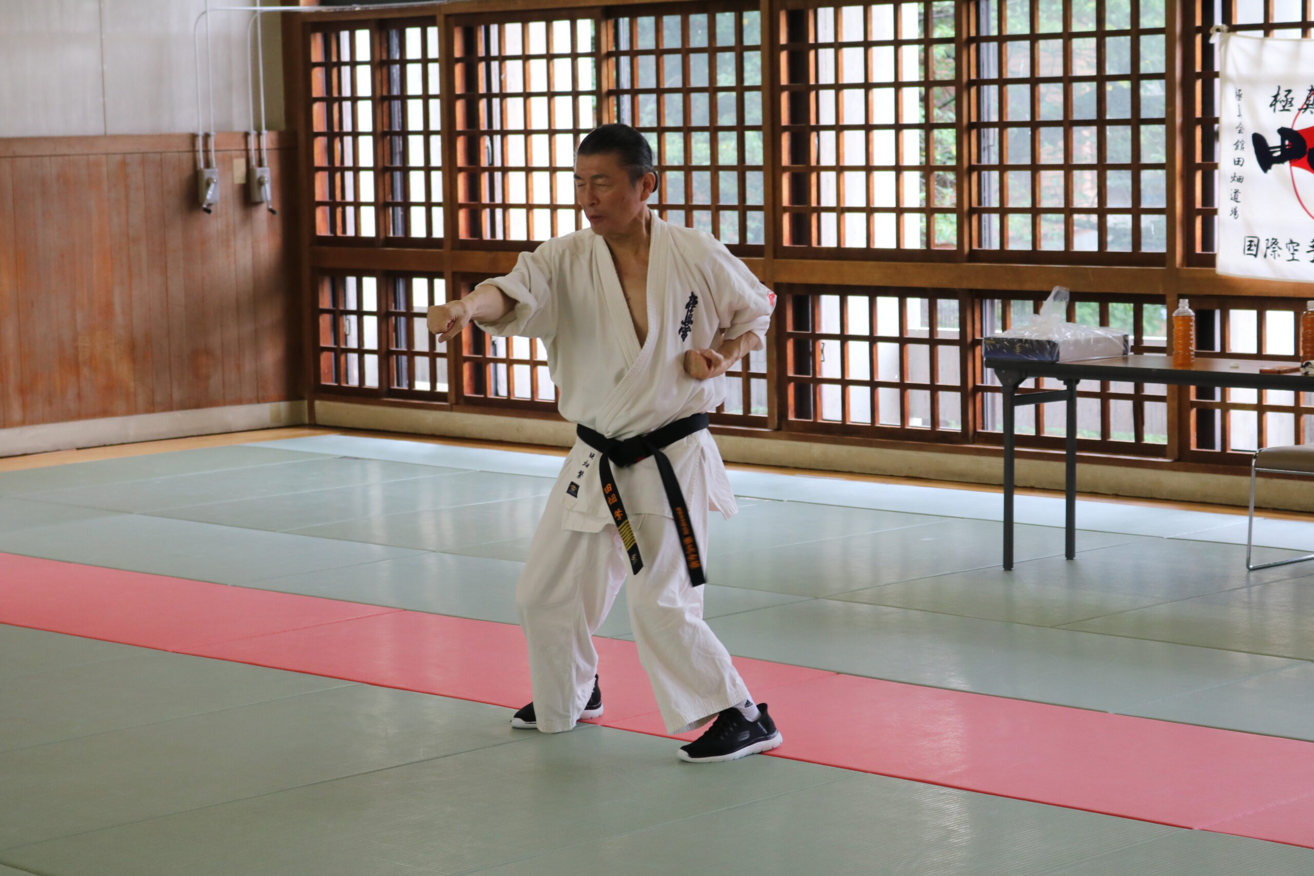 冒頭、田畑師範より「極真カラテは基本ではじまり、基本で終わる。三合法により、自分の生命力を最大限に高め自己完成、自己実現を目指していく。」ことを実技を交えての訓話がありました。