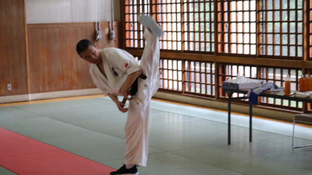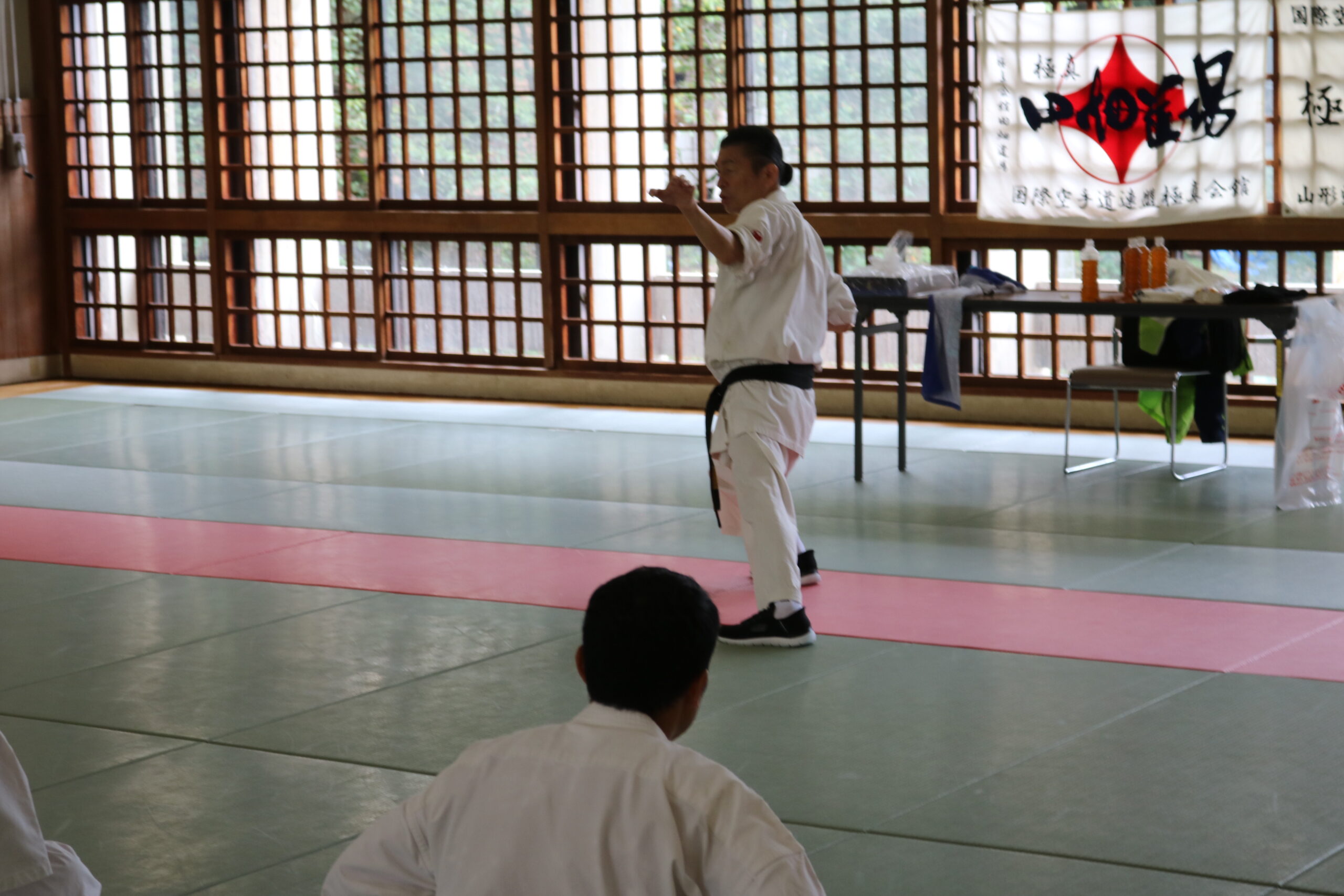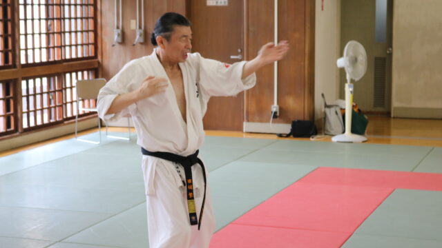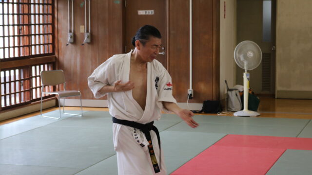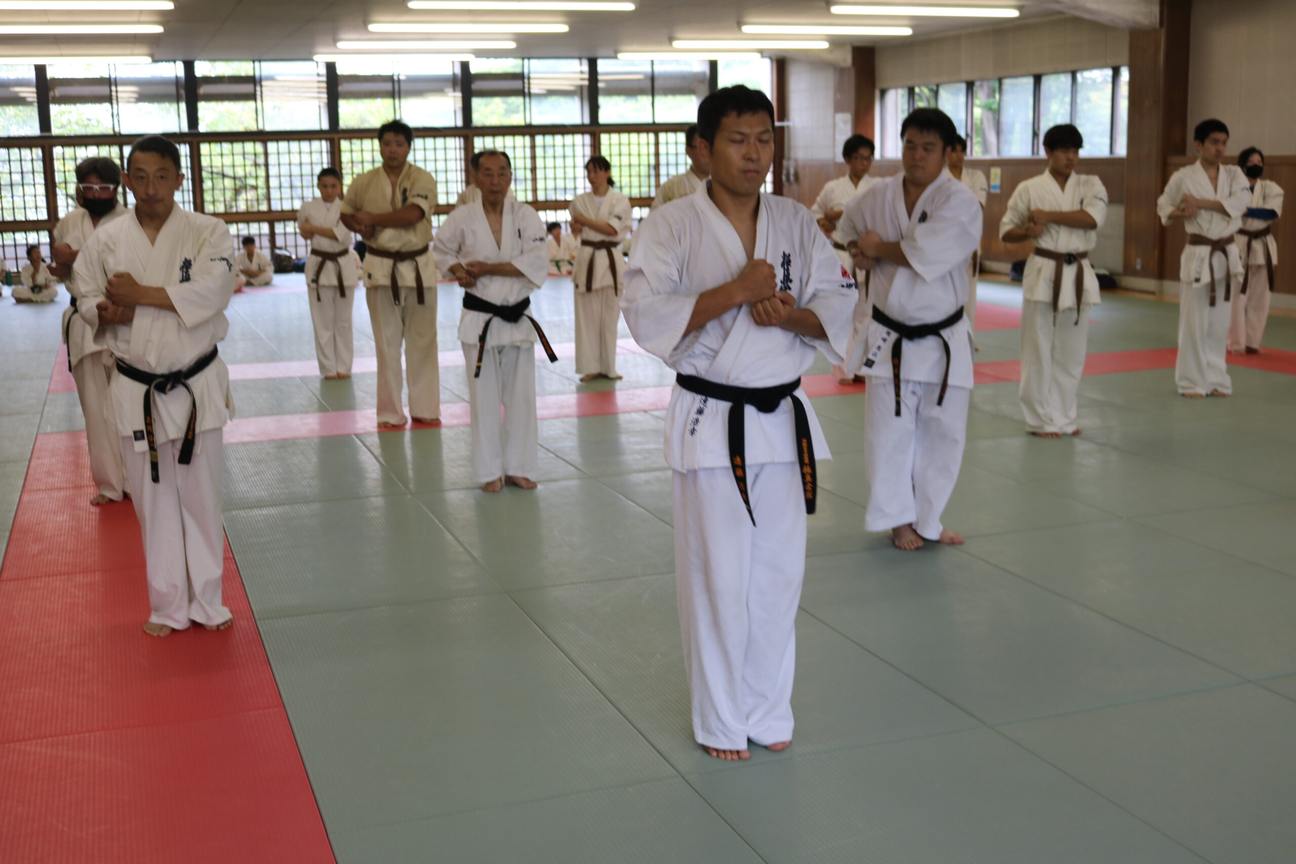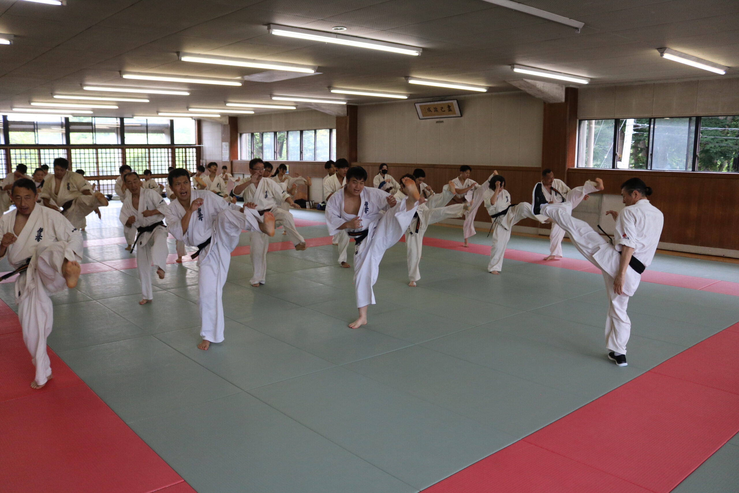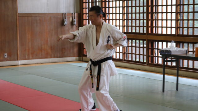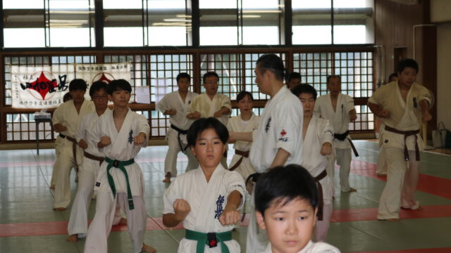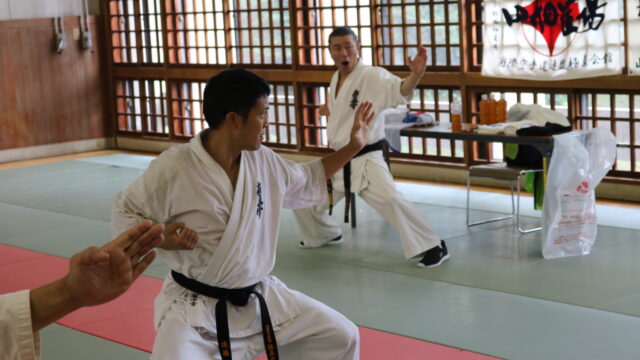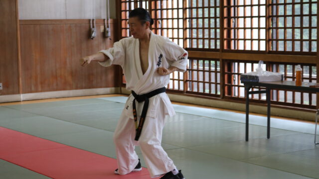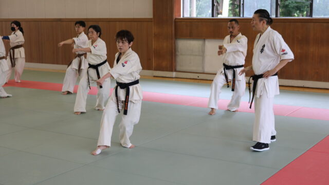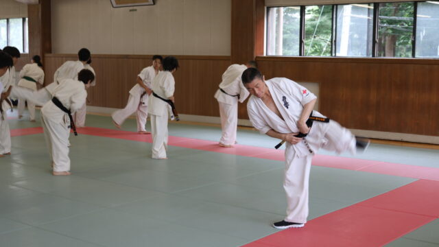 基本稽古のはじめは、緊張感もあり気合も静かなスタートでしたが、田畑師範の号令と発破に長岡師範代をはじめとする参加者全員が次第に力を出し、田畑師範も納得する基本稽古となりました。その中でも、新庄教室から参加の伊藤志徳君が白帯ながらも、最後まで一生懸命に気合を入れ基本稽古に打ち込んでいたことを田畑師範がとても褒められ、参加者全員の大きな拍手がありました。