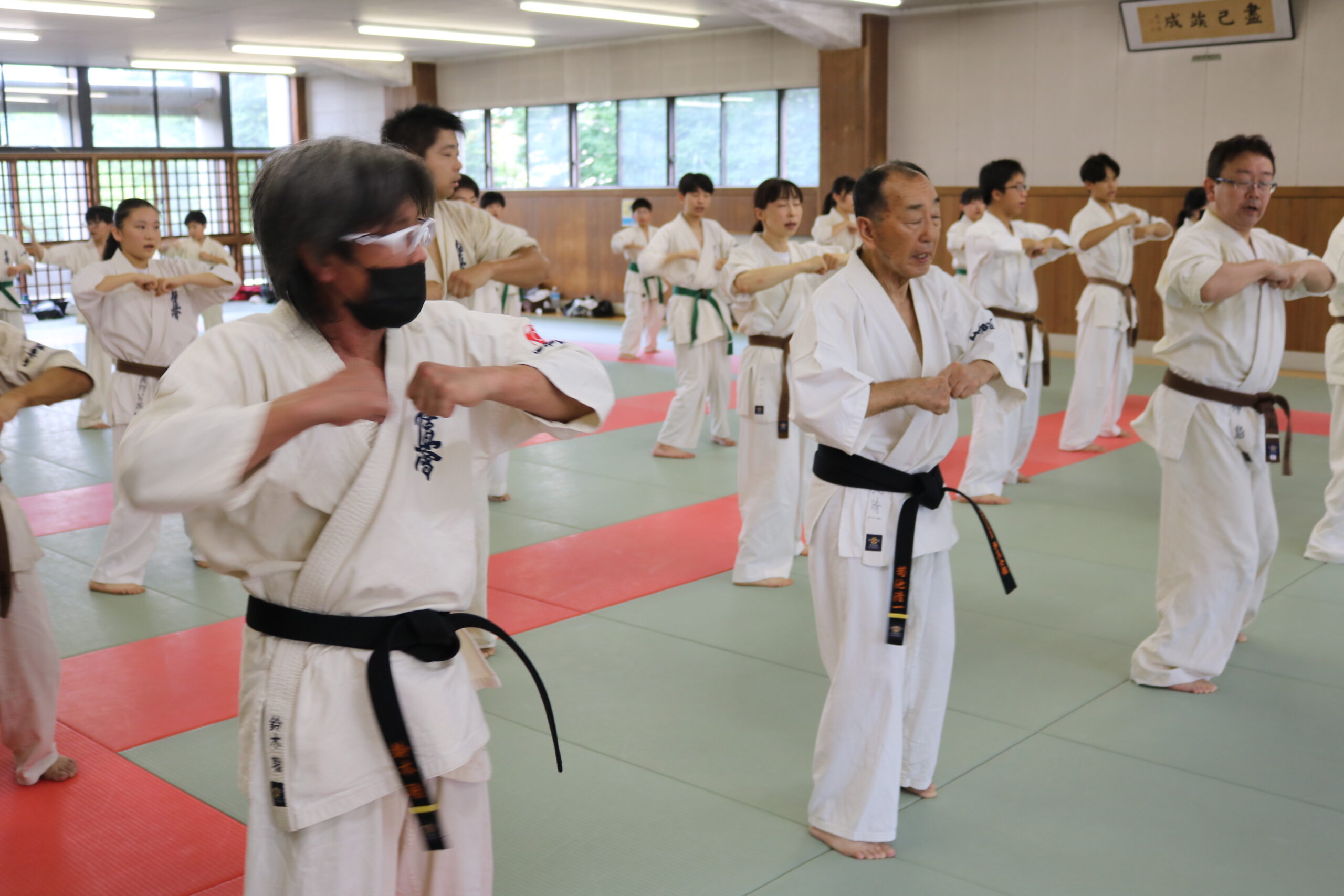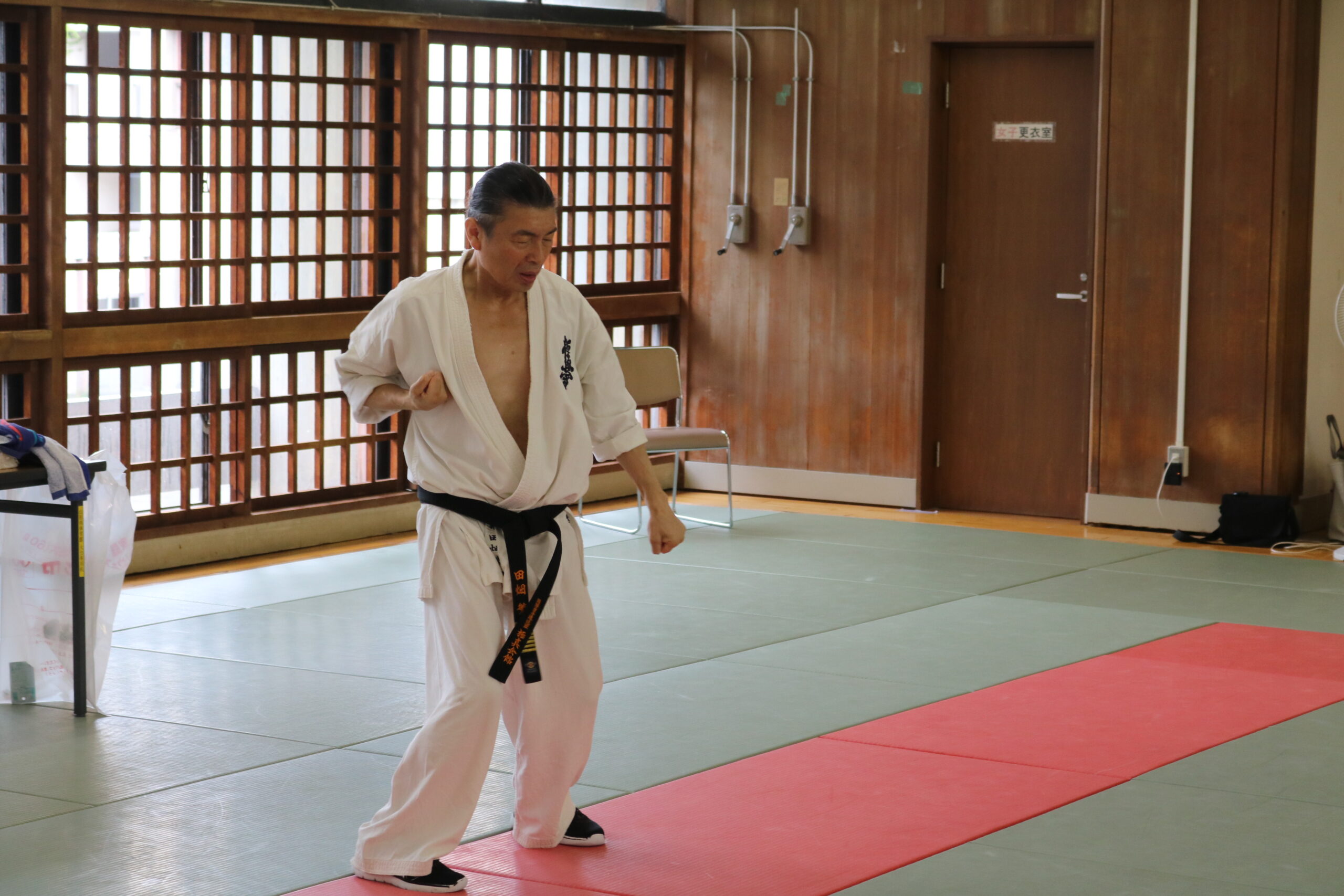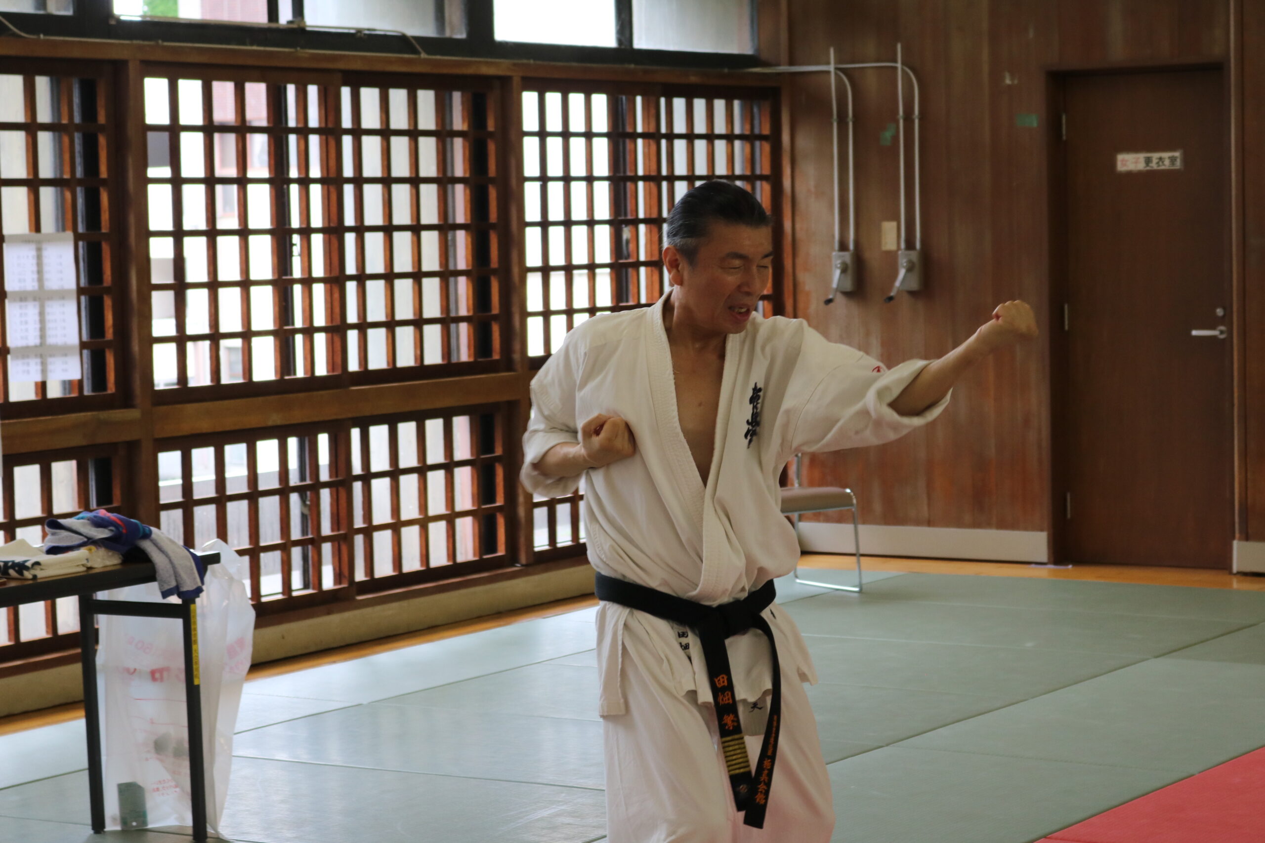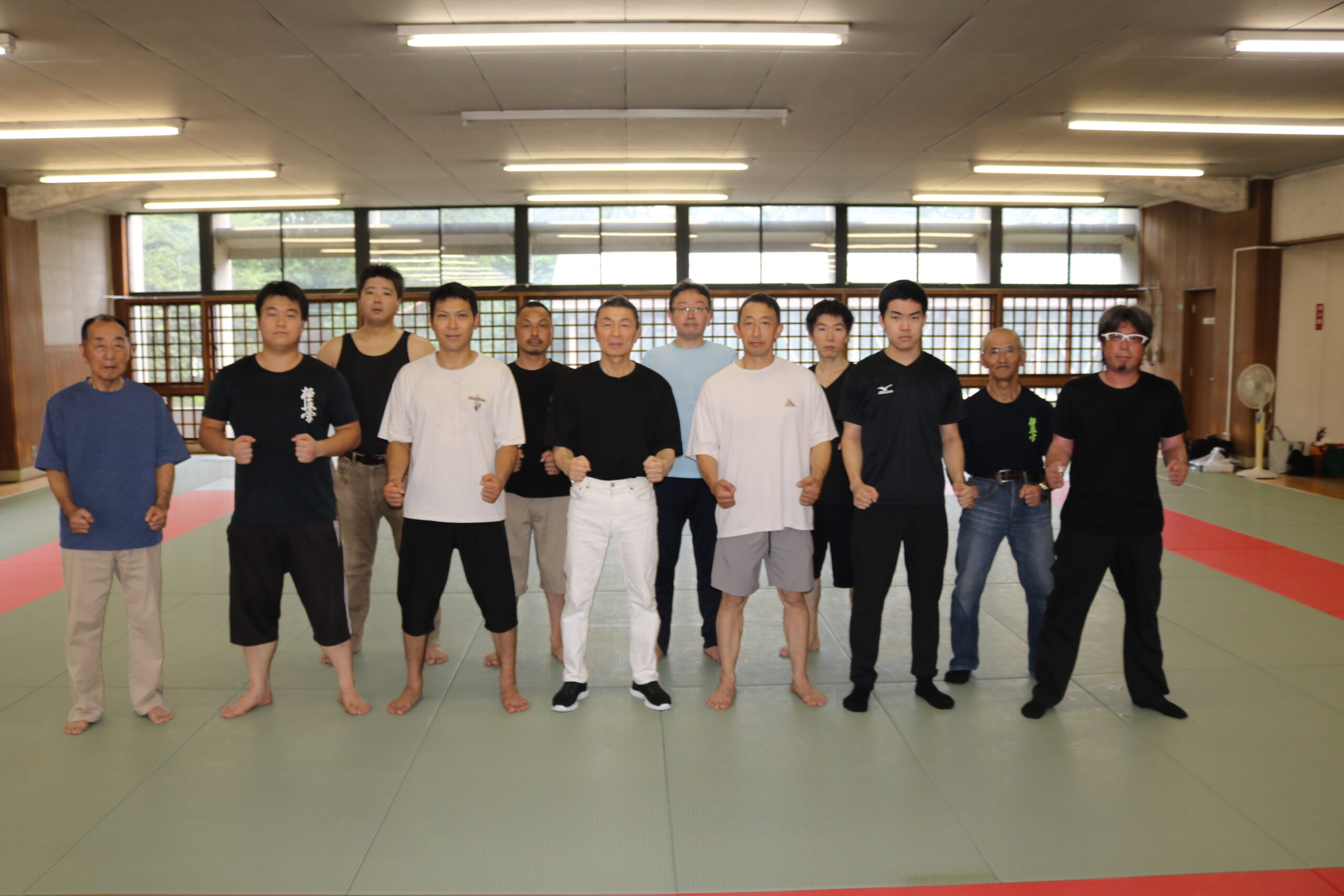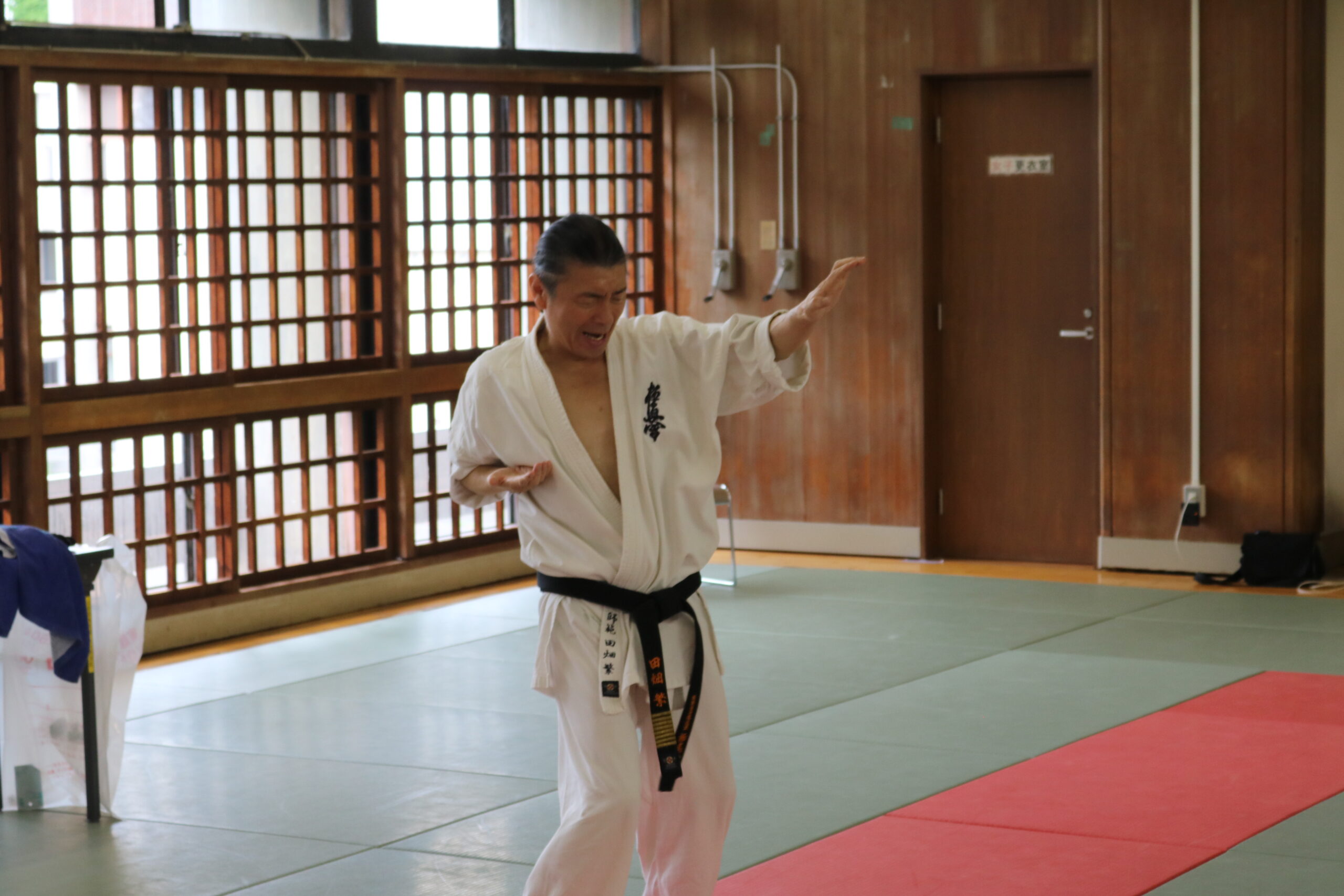 基本稽古のはじめは、緊張感もあり気合も静かなスタートでしたが、田畑師範の号令と発破に長岡師範代をはじめとする参加者全員が次第に力を出し、田畑師範も納得する基本稽古となりました。その中でも、新庄教室から参加の伊藤志徳君が白帯ながらも、最後まで一生懸命に気合を入れ基本稽古に打ち込んでいたことを田畑師範がとても褒められ、参加者全員の大きな拍手がありました。
