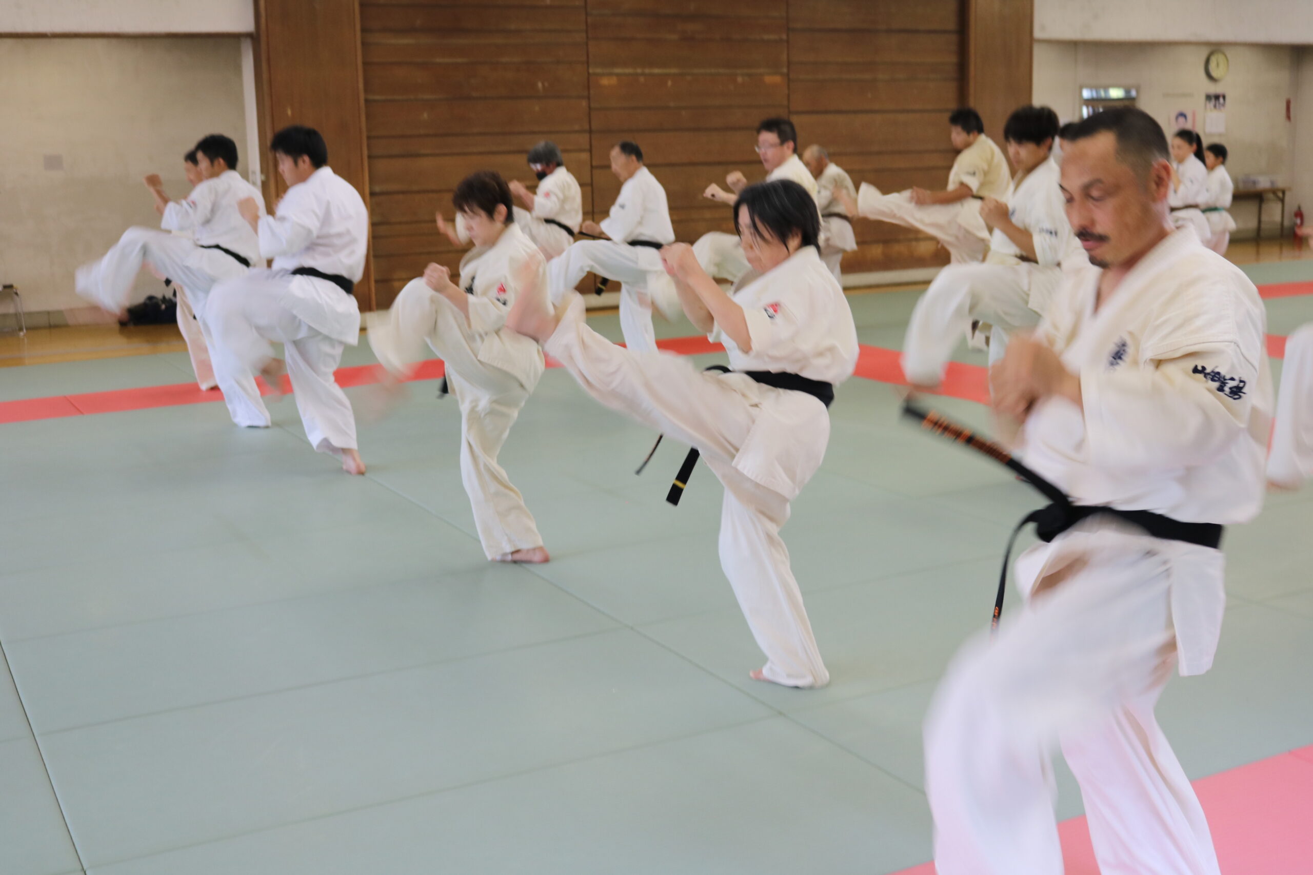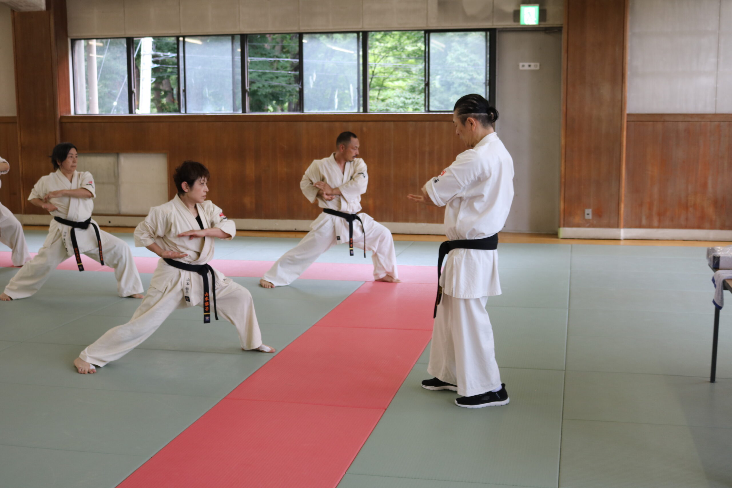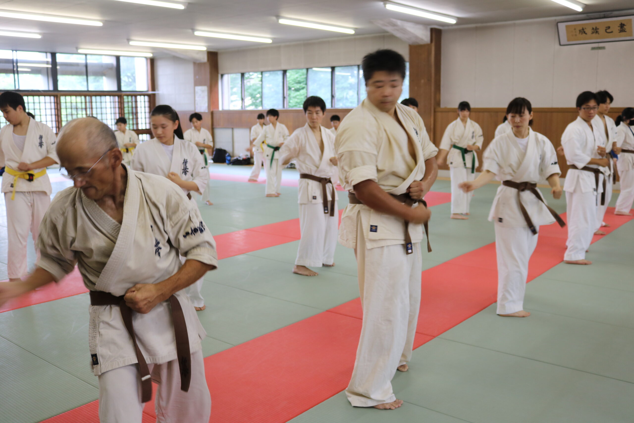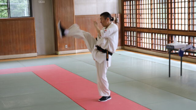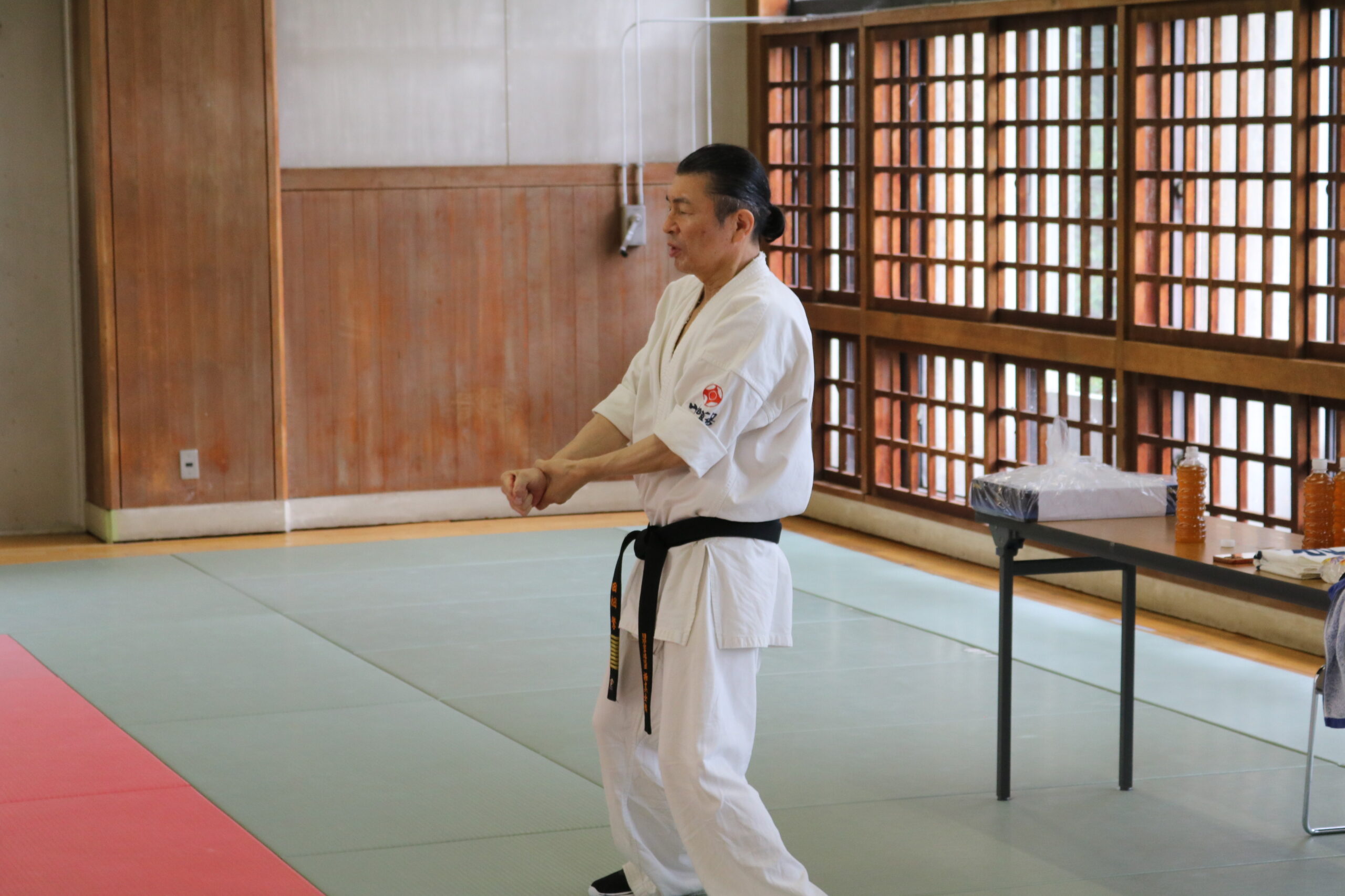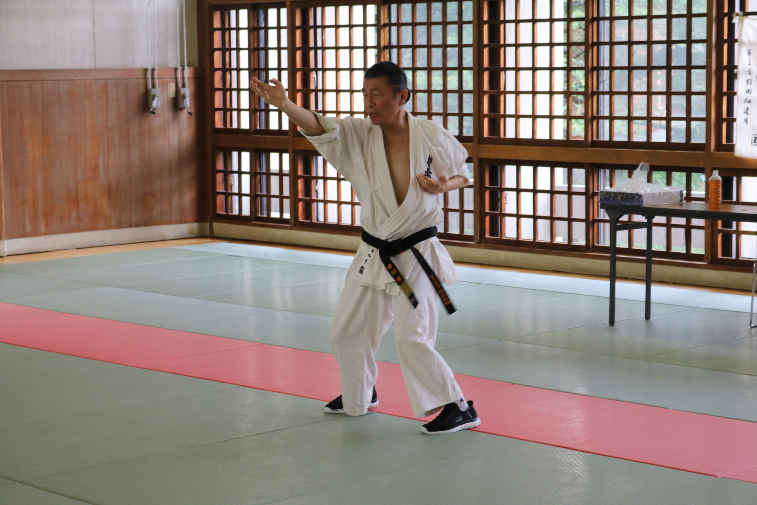 基本稽古のはじめは、緊張感もあり気合も静かなスタートでしたが、田畑師範の号令と発破に長岡師範代をはじめとする参加者全員が次第に力を出し、田畑師範も納得する基本稽古となりました。その中でも、新庄教室から参加の伊藤志徳君が白帯ながらも、最後まで一生懸命に気合を入れ基本稽古に打ち込んでいたことを田畑師範がとても褒められ、参加者全員の大きな拍手がありました。