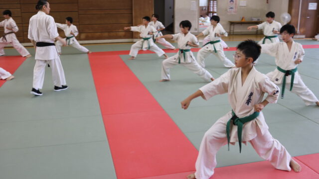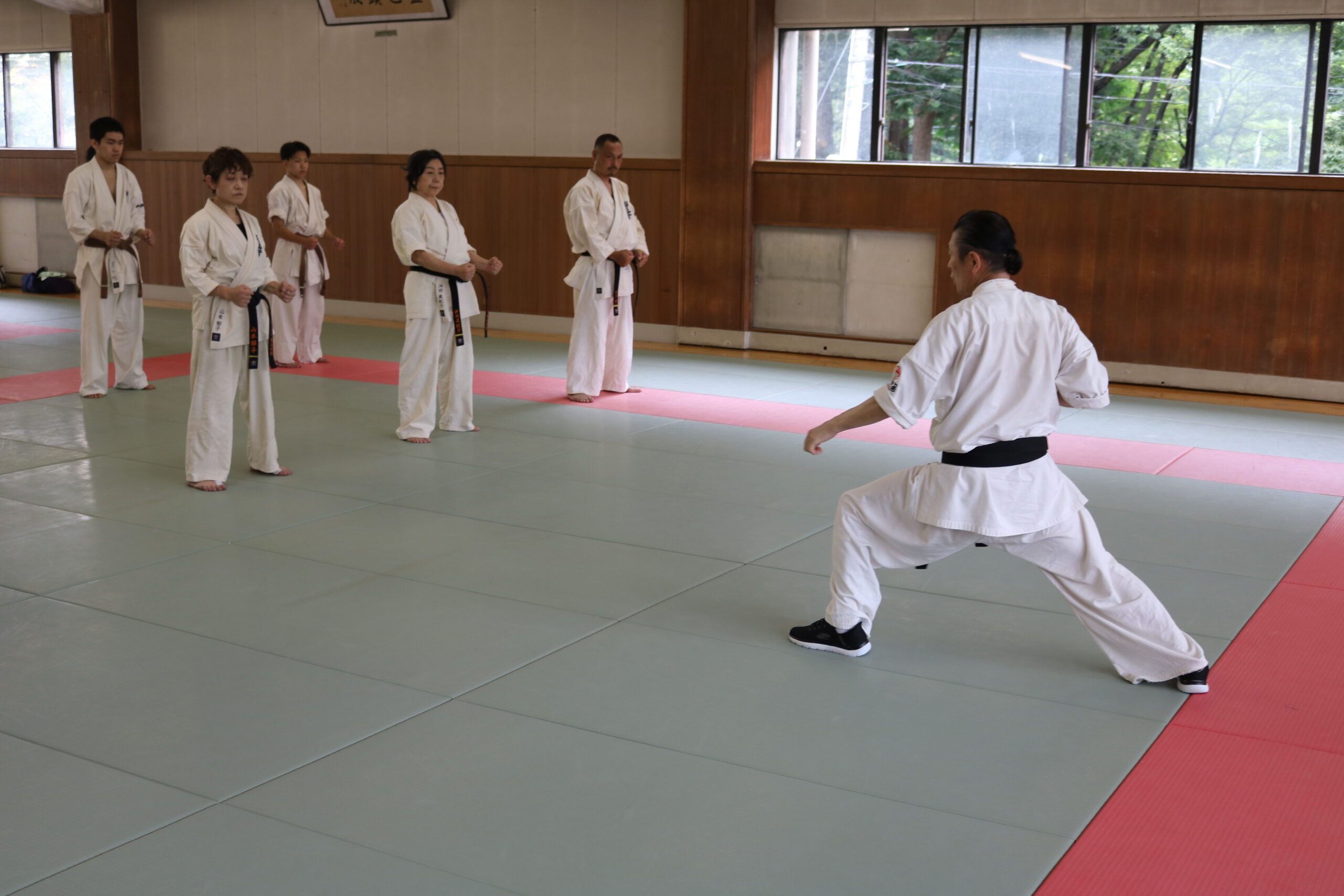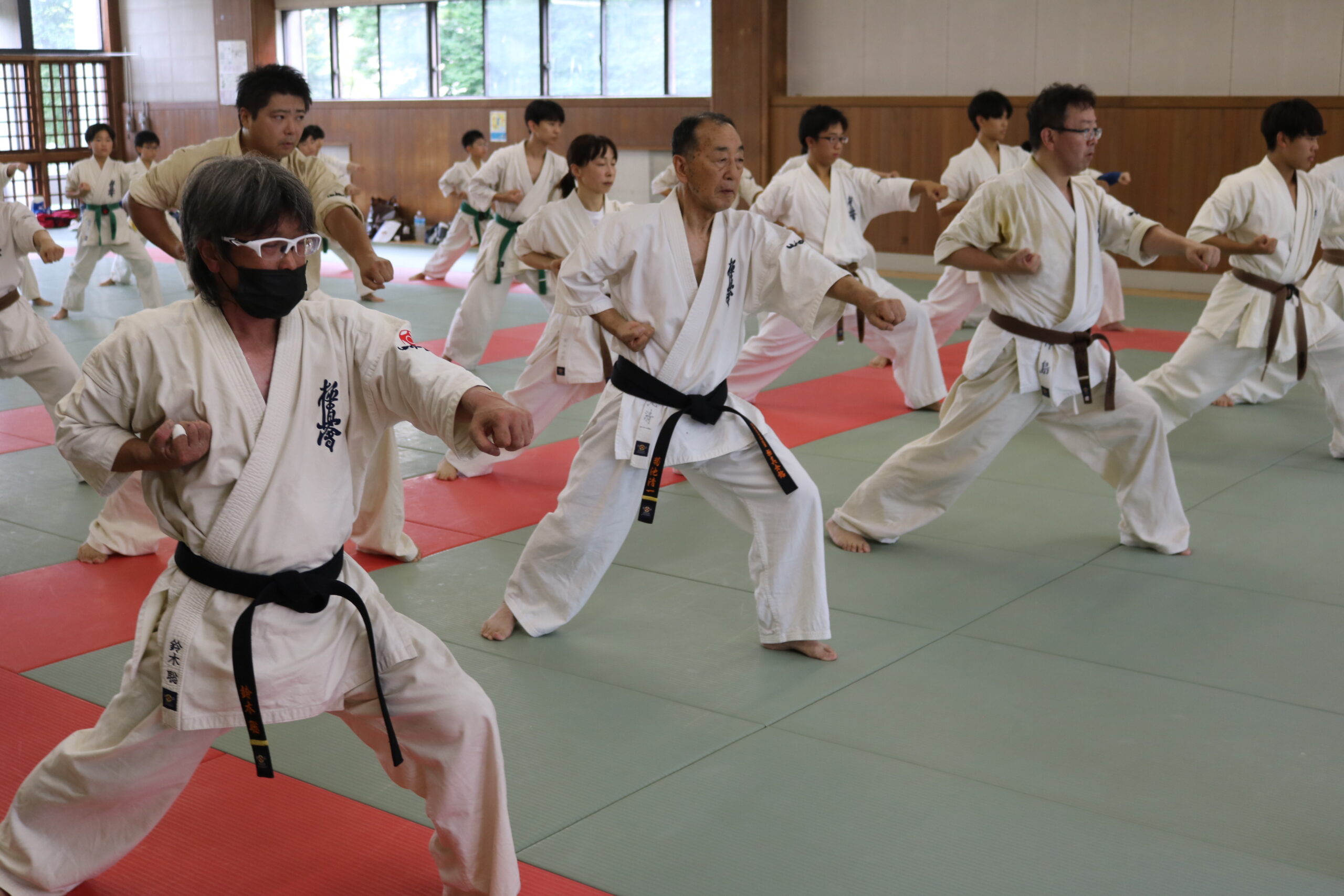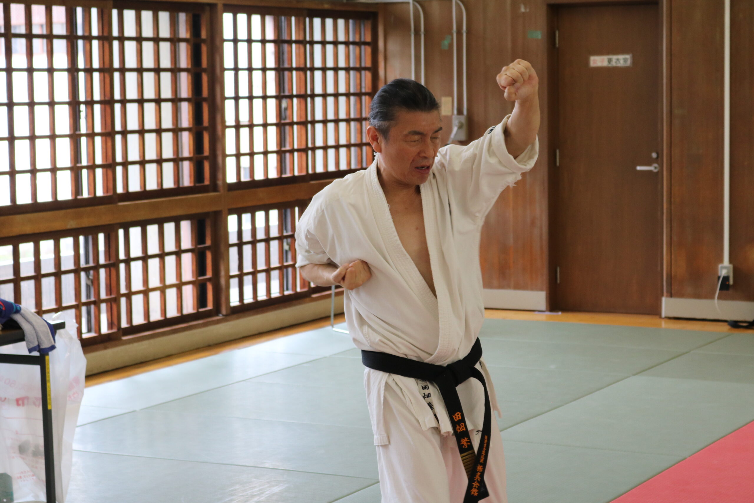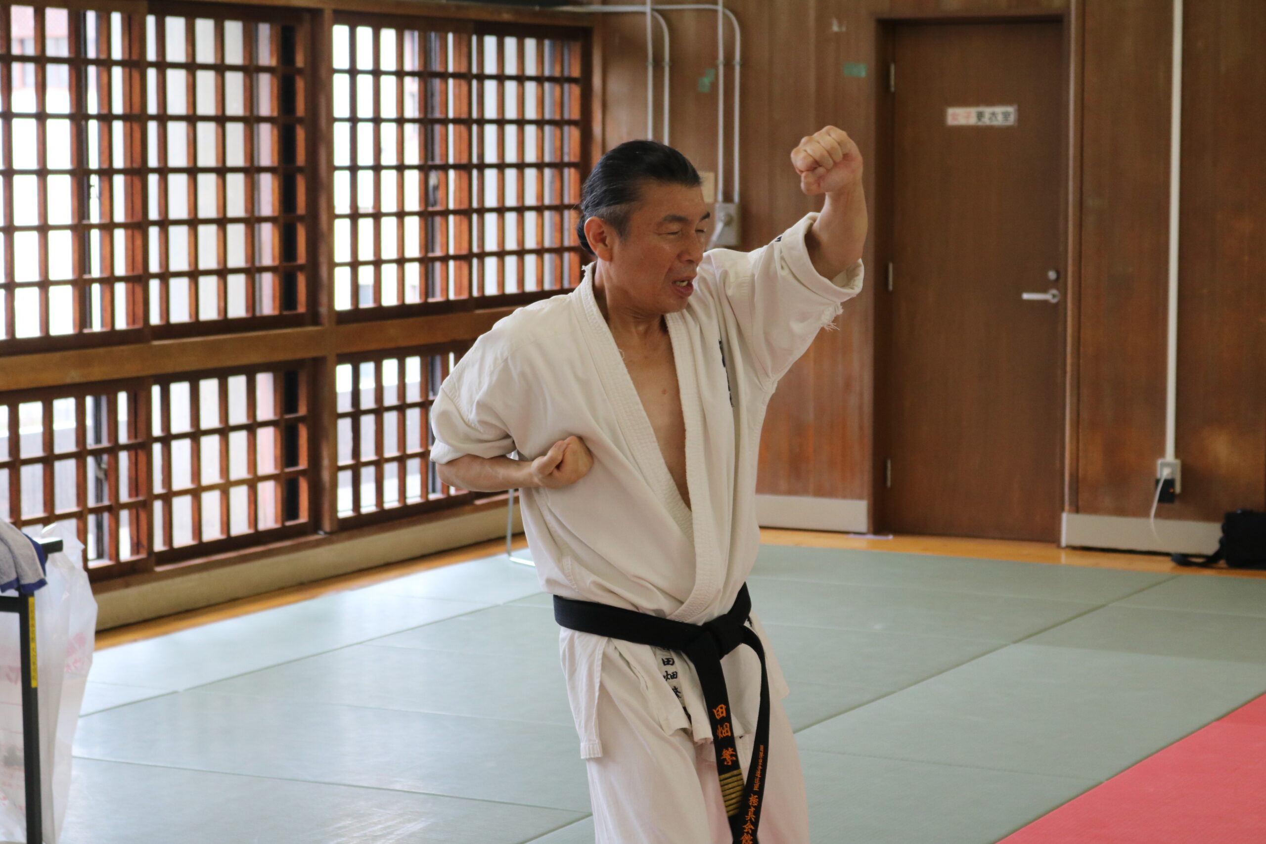 基本稽古のはじめは、緊張感もあり気合も静かなスタートでしたが、田畑師範の号令と発破に長岡師範代をはじめとする参加者全員が次第に力を出し、田畑師範も納得する基本稽古となりました。その中でも、新庄教室から参加の伊藤志徳君が白帯ながらも、最後まで一生懸命に気合を入れ基本稽古に打ち込んでいたことを田畑師範がとても褒められ、参加者全員の大きな拍手がありました。