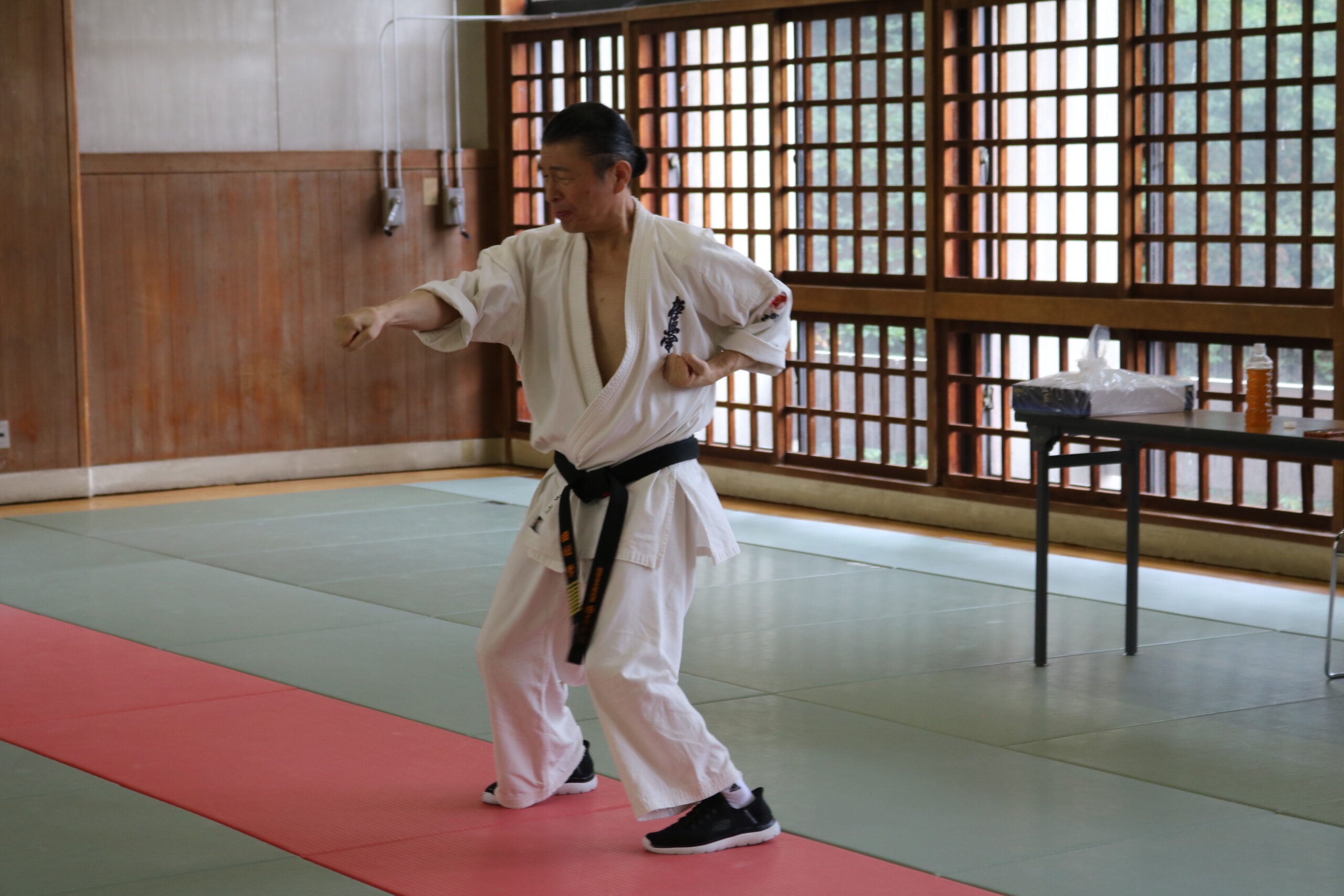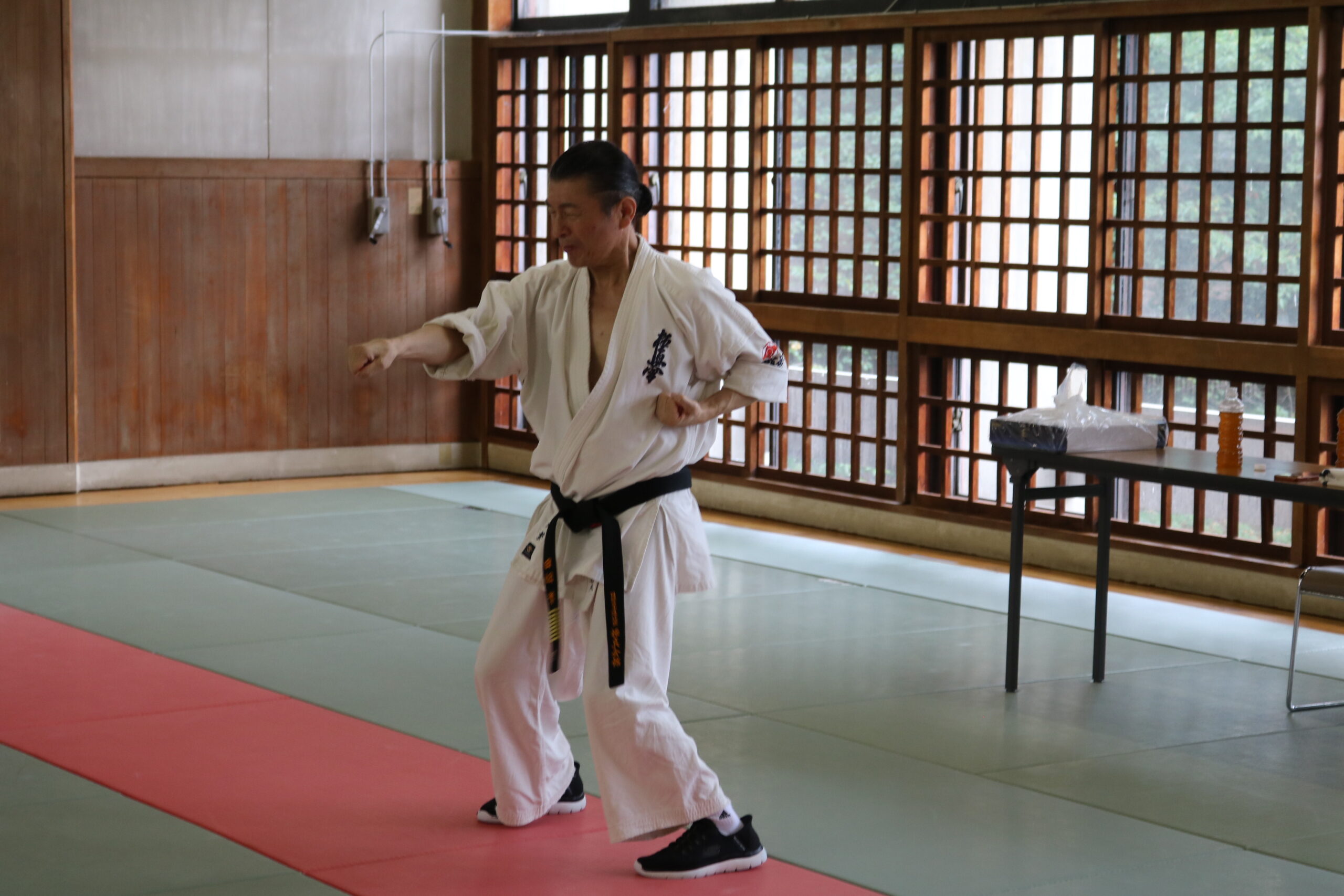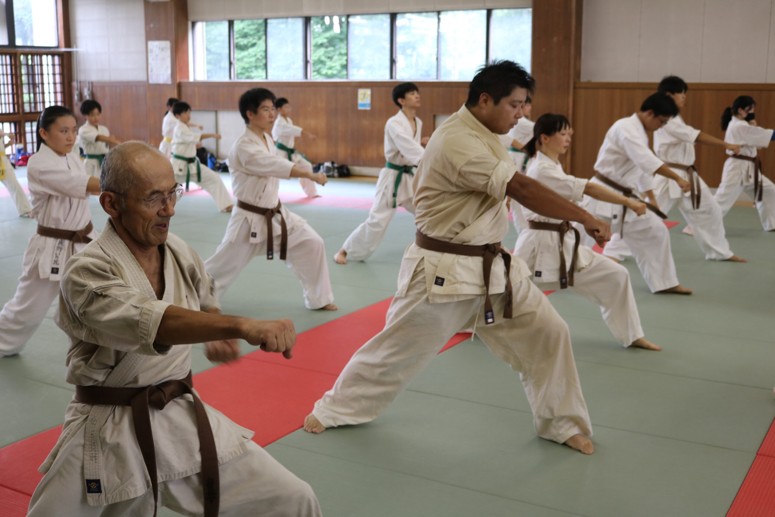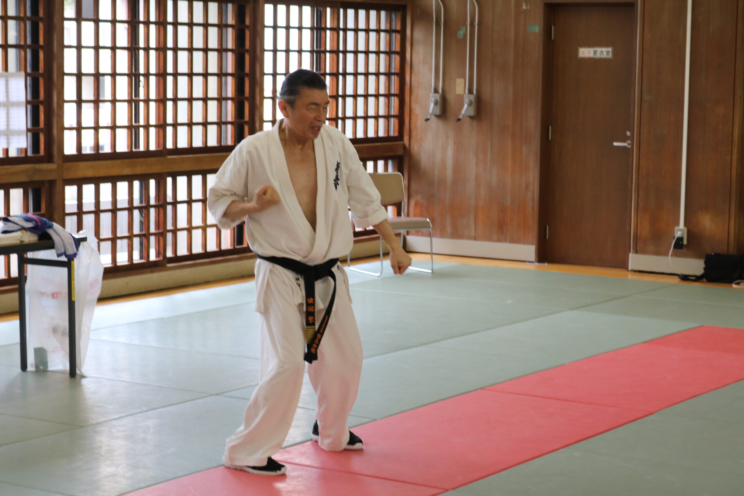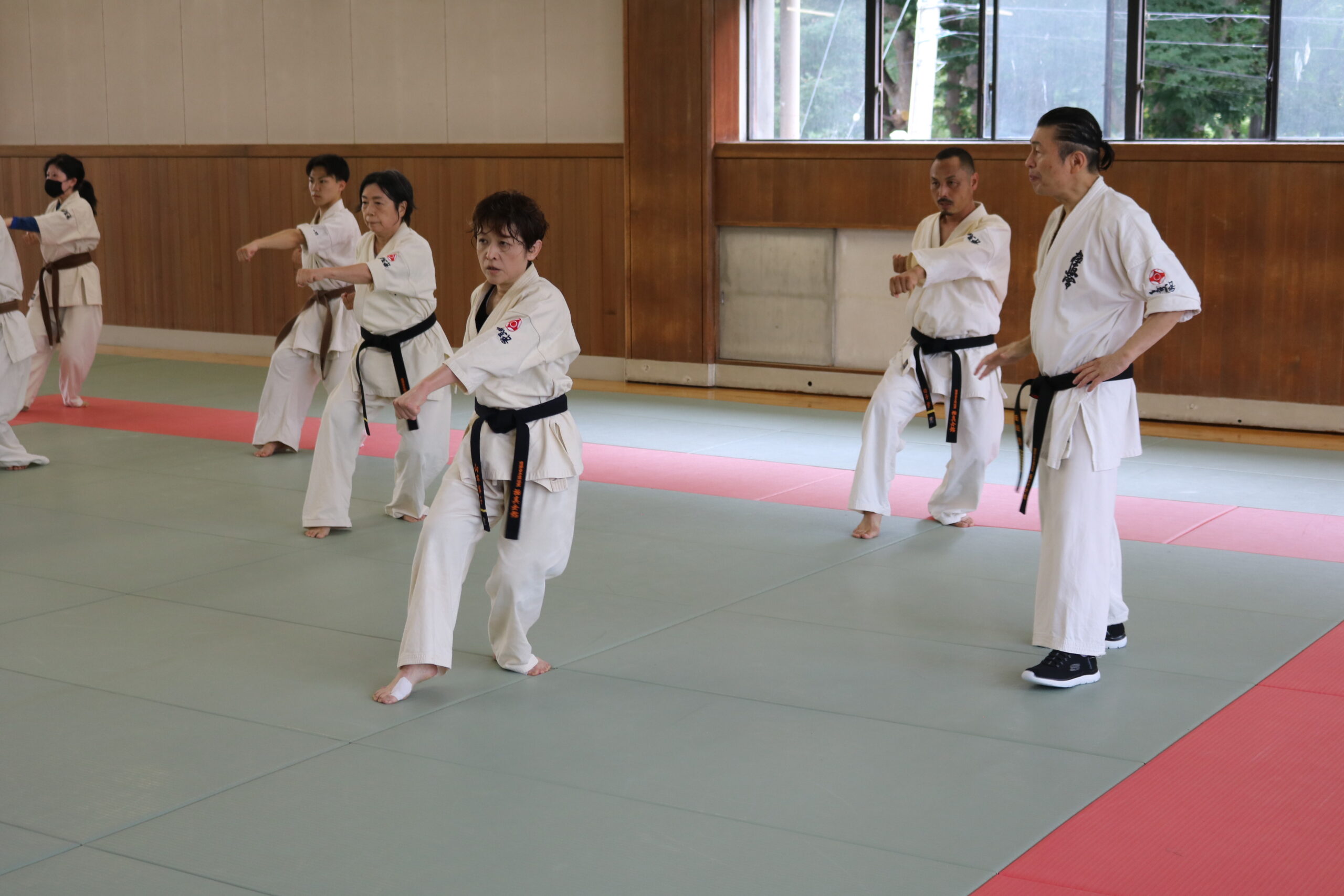 基本稽古のはじめは、緊張感もあり気合も静かなスタートでしたが、田畑師範の号令と発破に長岡師範代をはじめとする参加者全員が次第に力を出し、田畑師範も納得する基本稽古となりました。その中でも、新庄教室から参加の伊藤志徳君が白帯ながらも、最後まで一生懸命に気合を入れ基本稽古に打ち込んでいたことを田畑師範がとても褒められ、参加者全員の大きな拍手がありました。