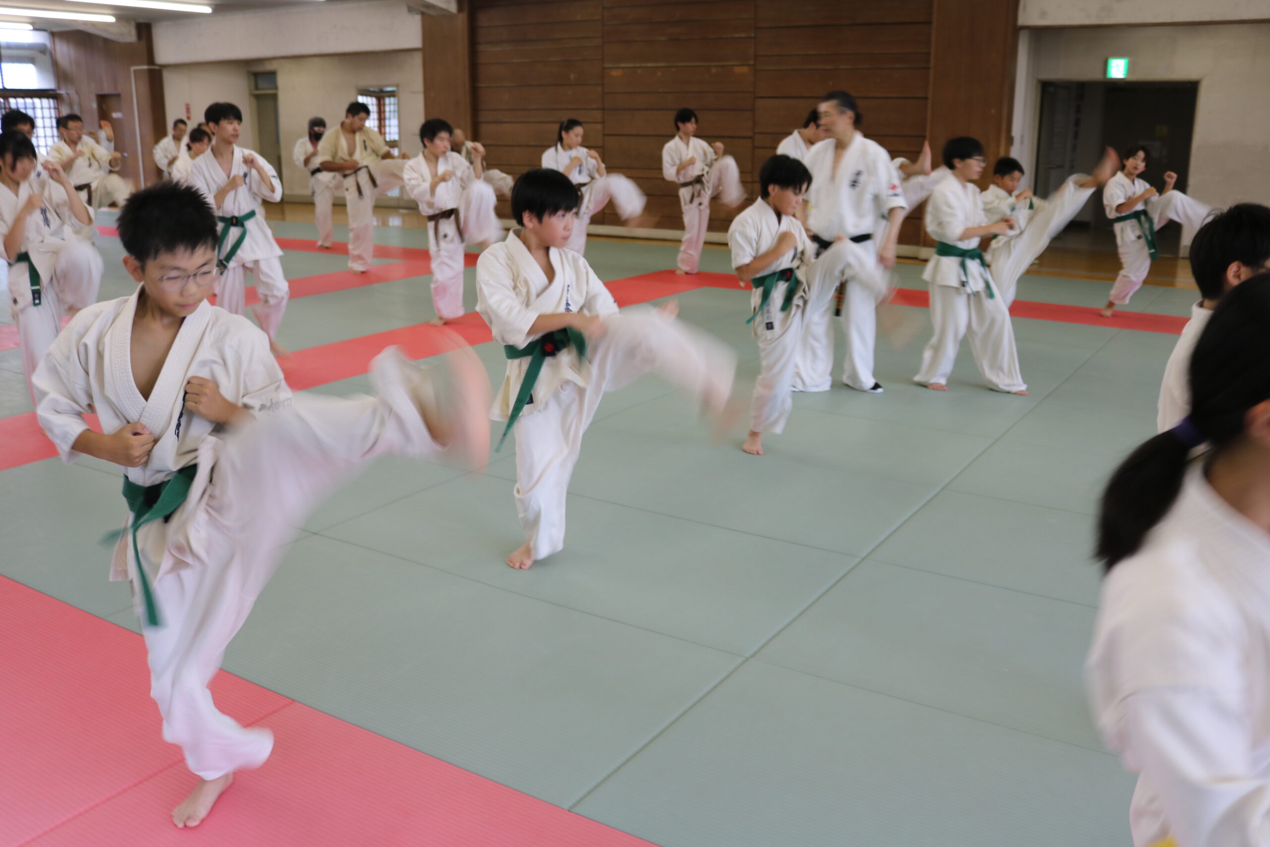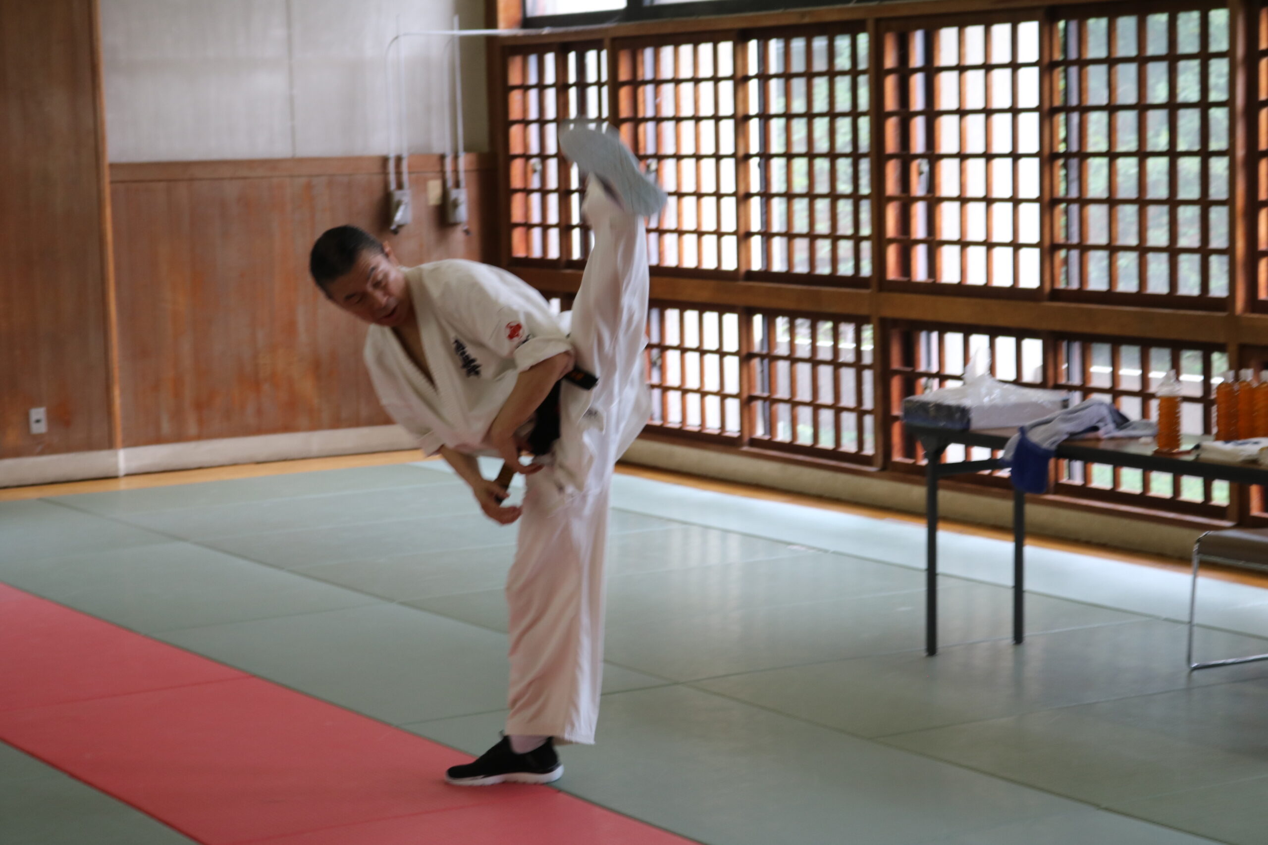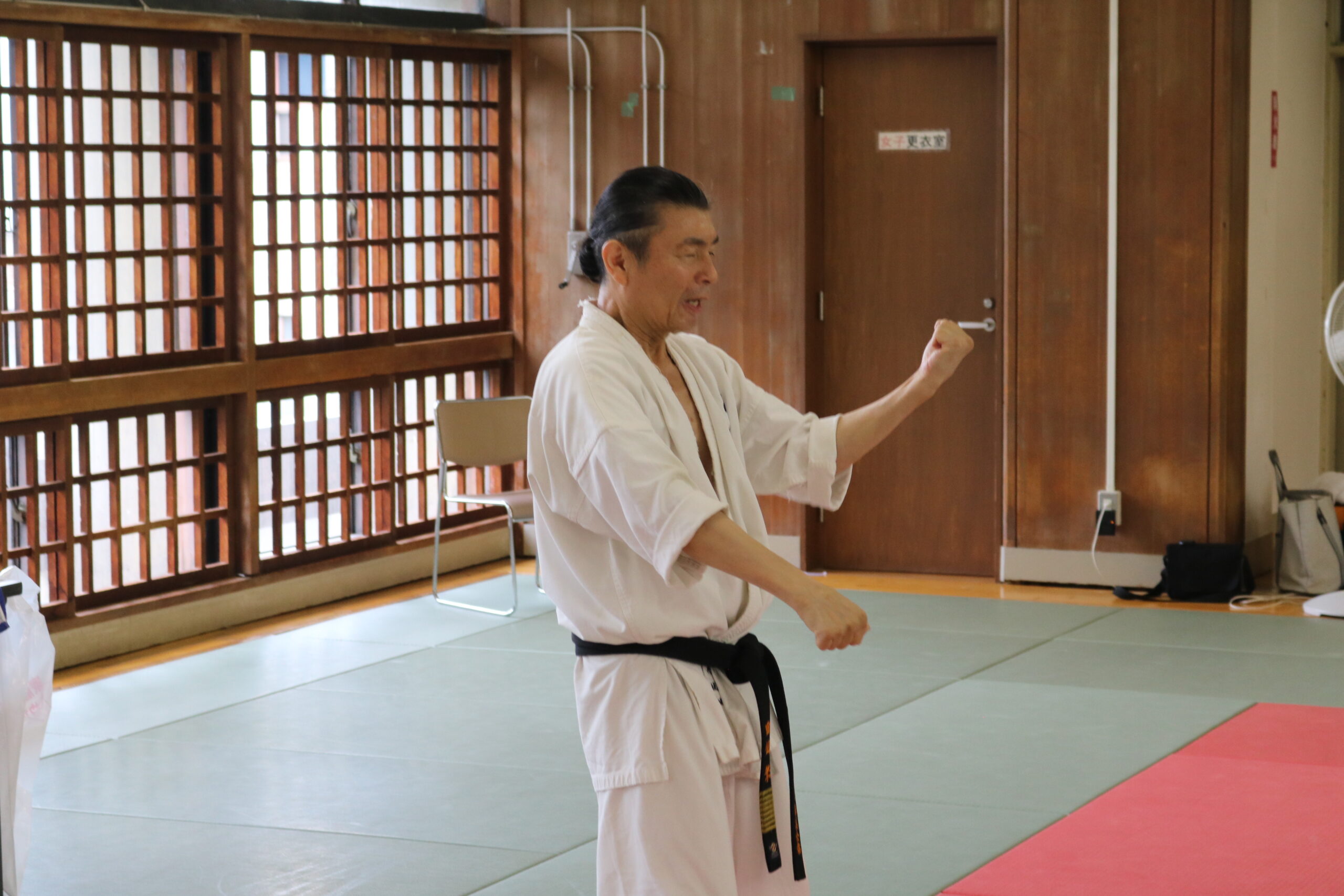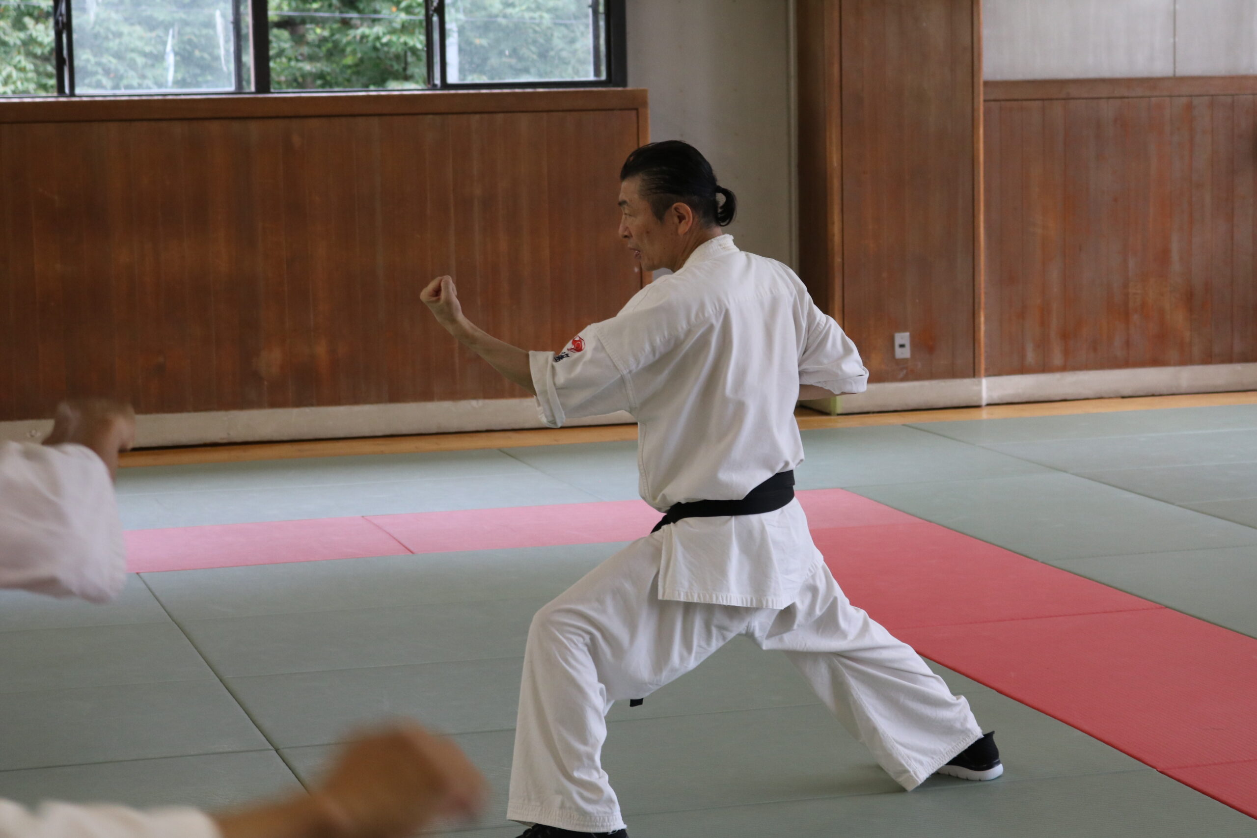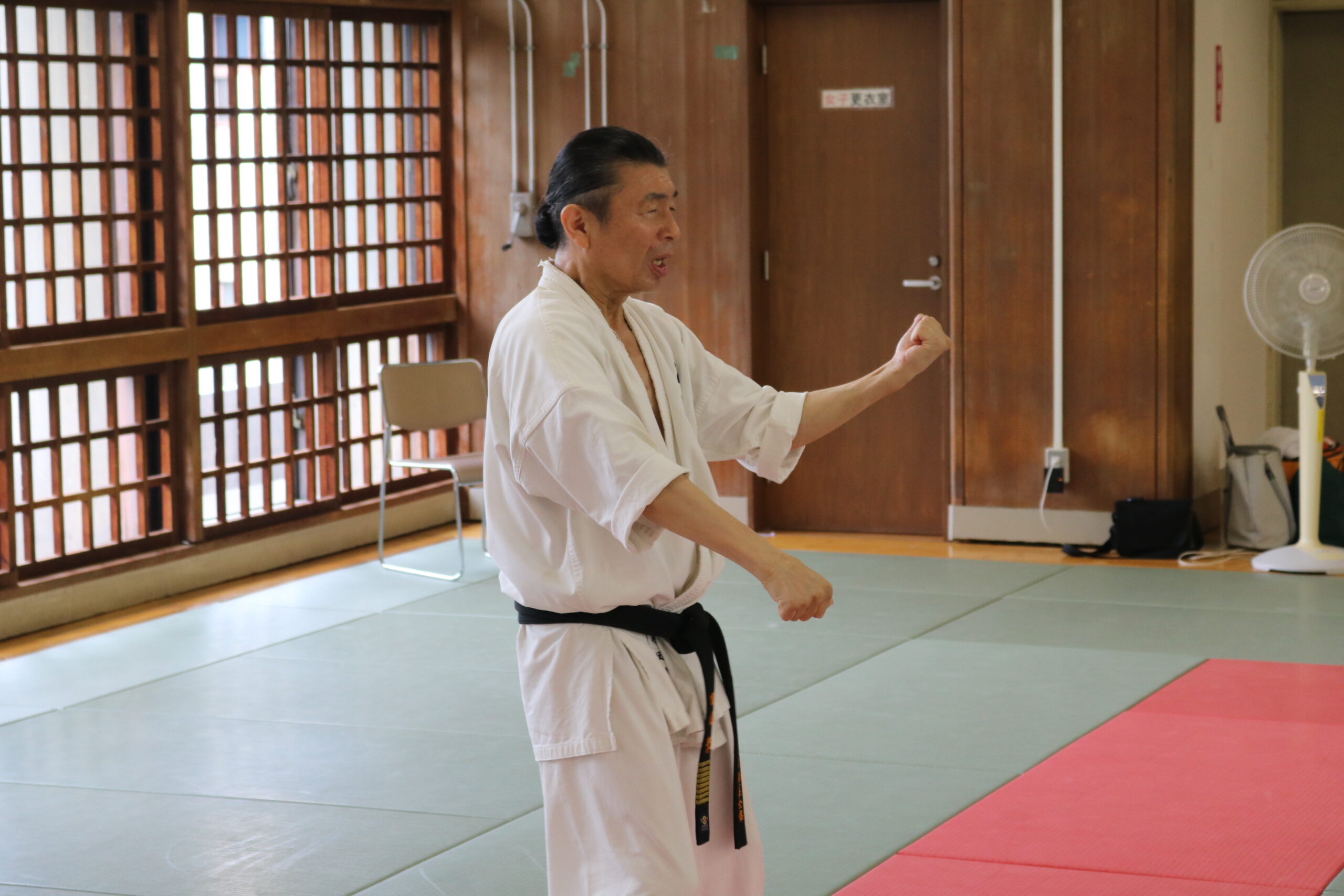 基本稽古のはじめは、緊張感もあり気合も静かなスタートでしたが、田畑師範の号令と発破に長岡師範代をはじめとする参加者全員が次第に力を出し、田畑師範も納得する基本稽古となりました。その中でも、新庄教室から参加の伊藤志徳君が白帯ながらも、最後まで一生懸命に気合を入れ基本稽古に打ち込んでいたことを田畑師範がとても褒められ、参加者全員の大きな拍手がありました。