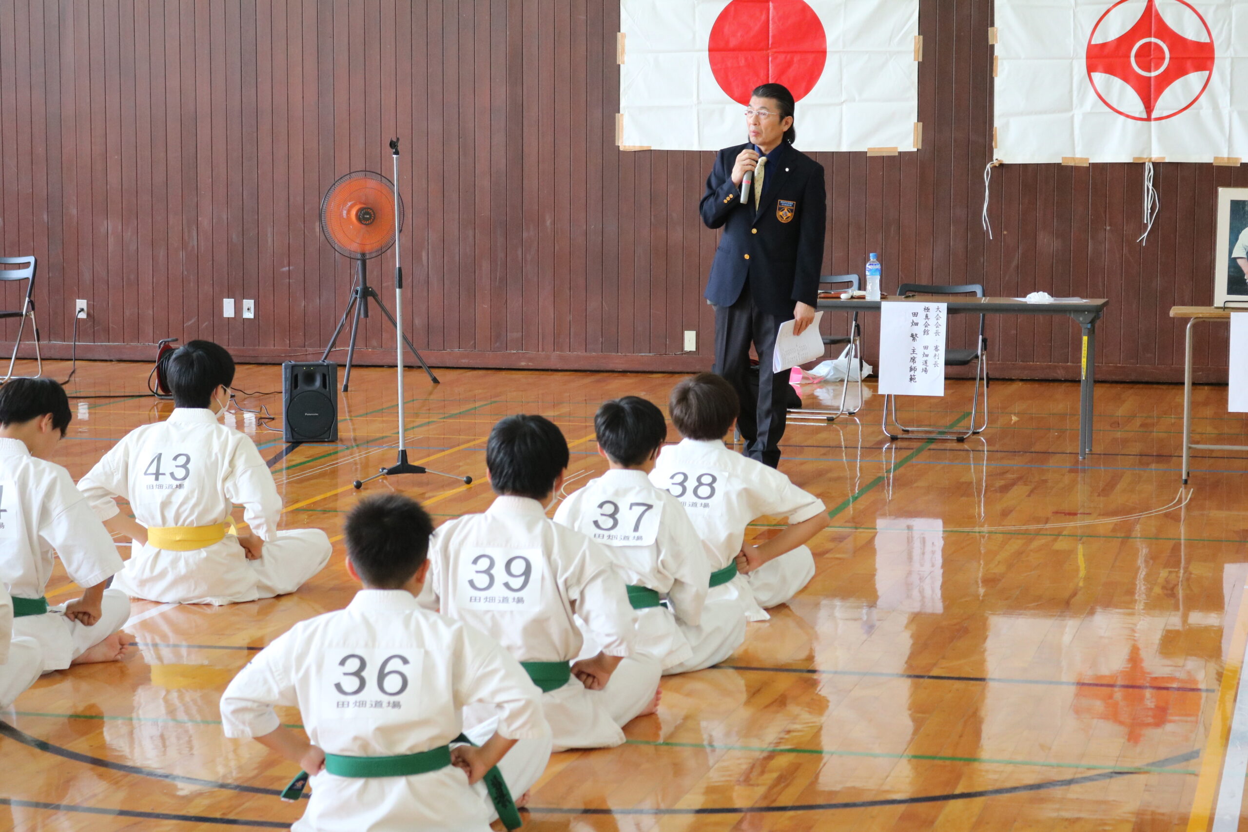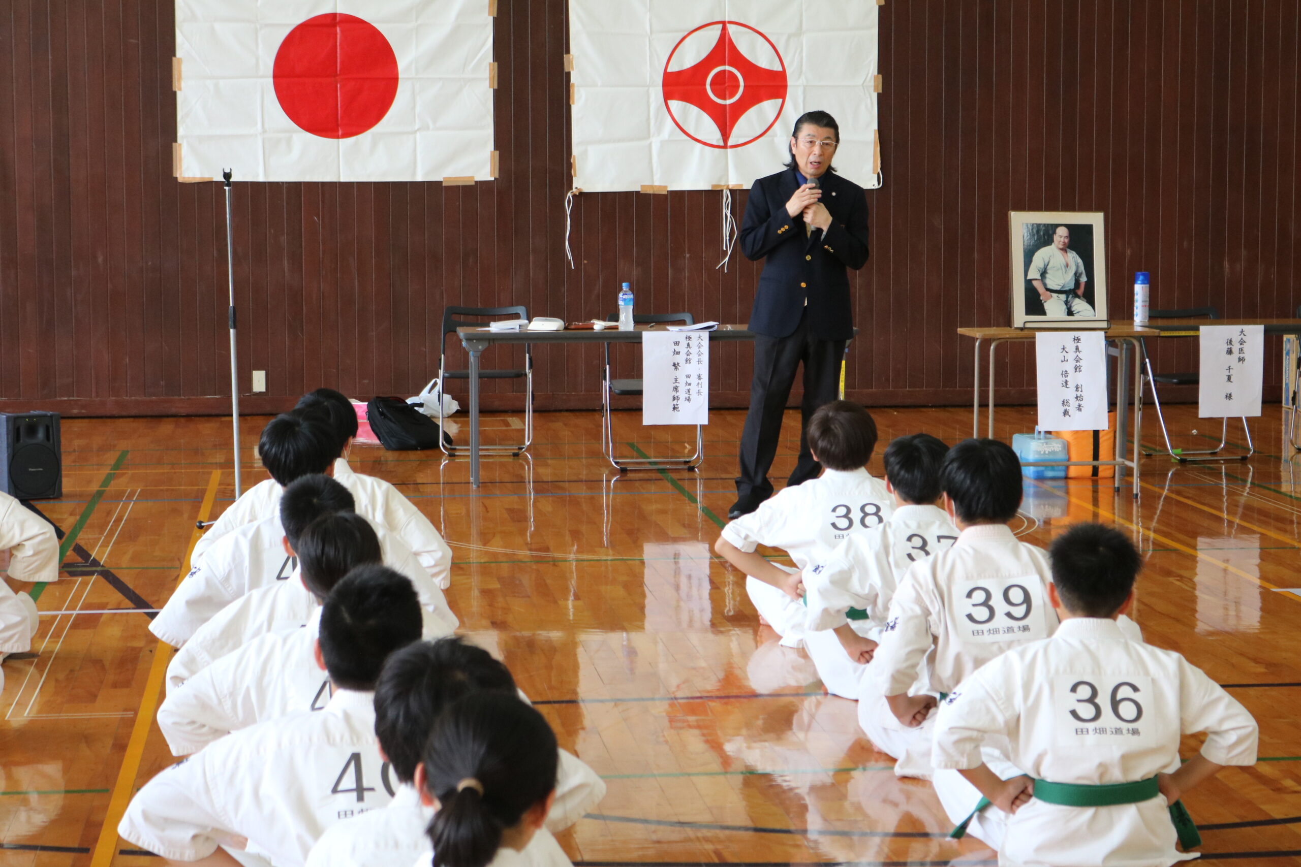 午前の型の部での開会式において、田畑繁主席師範より「型は分析力を高くして、理法(どこで始まり、どこで終るか)を正しく理解し、反復練習を積み重ねて下さい。経験を通じて自分を高め、もう一人の自分と対話しながら、一つの技は十万回、一つの型は三千回と稽古を積み重ねていって下さい。大山総裁は『絶対に失敗してはいけない状況で、一生懸命に頑張ったときに本当の力がつく。』とおっしゃってます。その気持ちをもって正々堂々頑張って下さい。」と激励がありました。