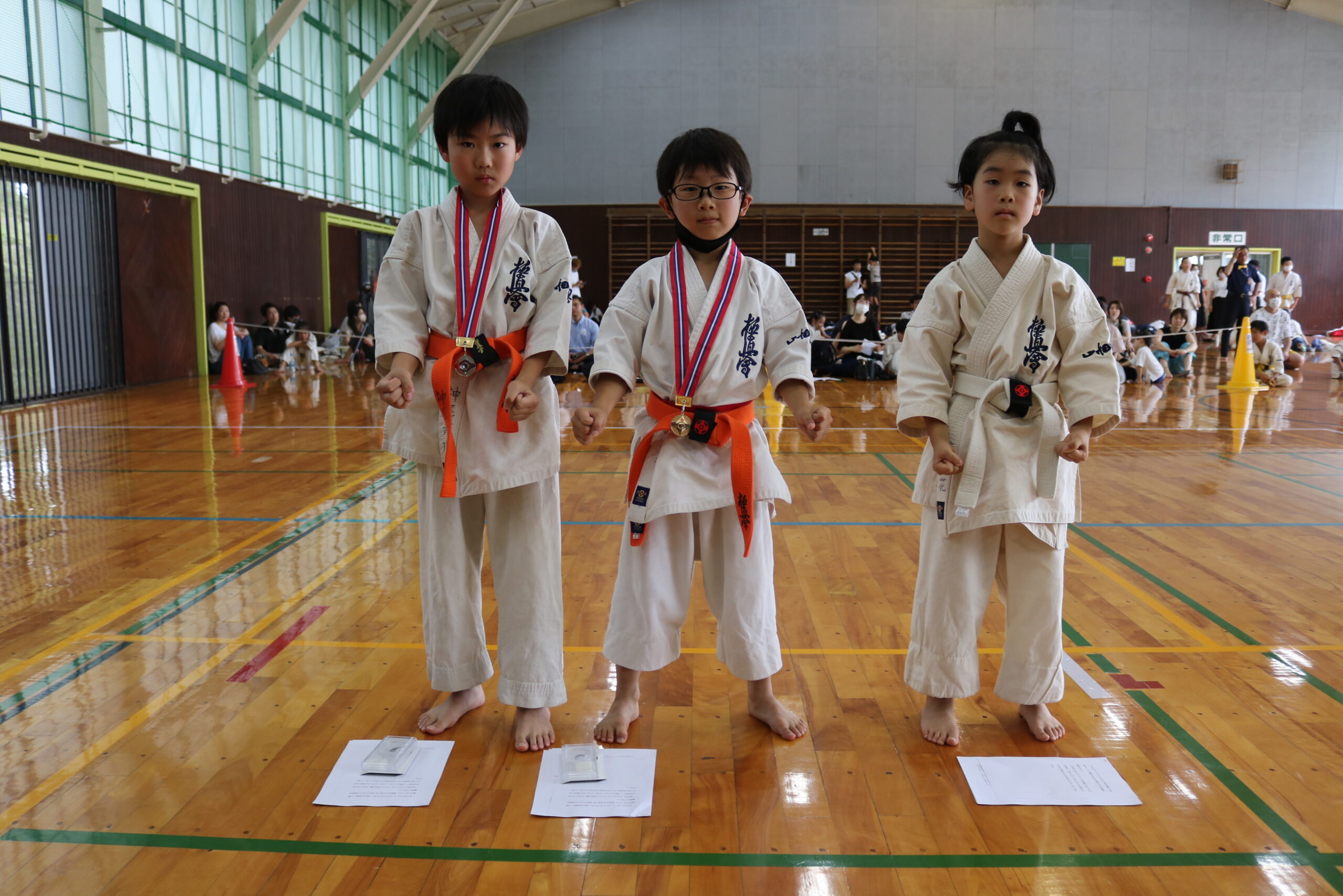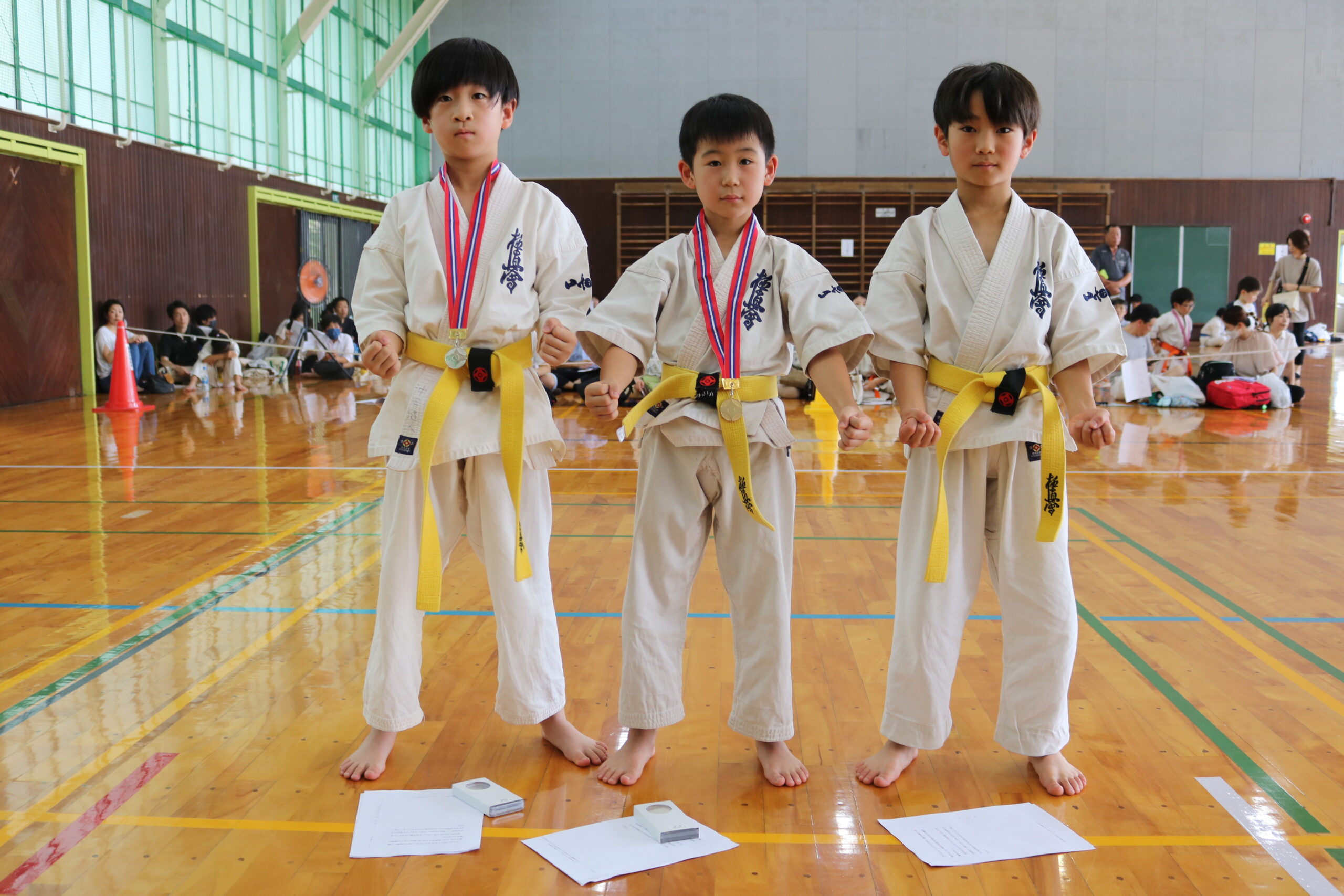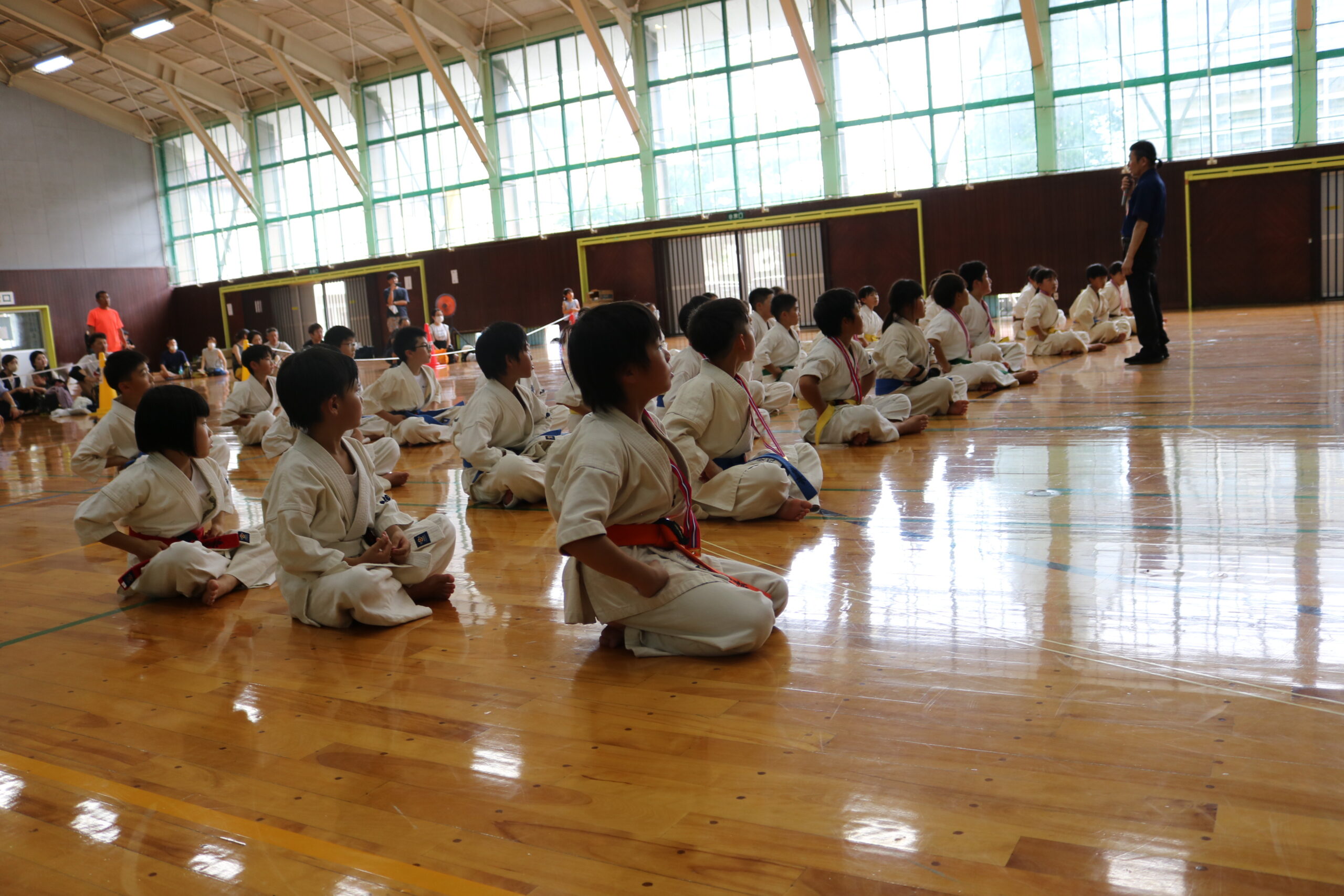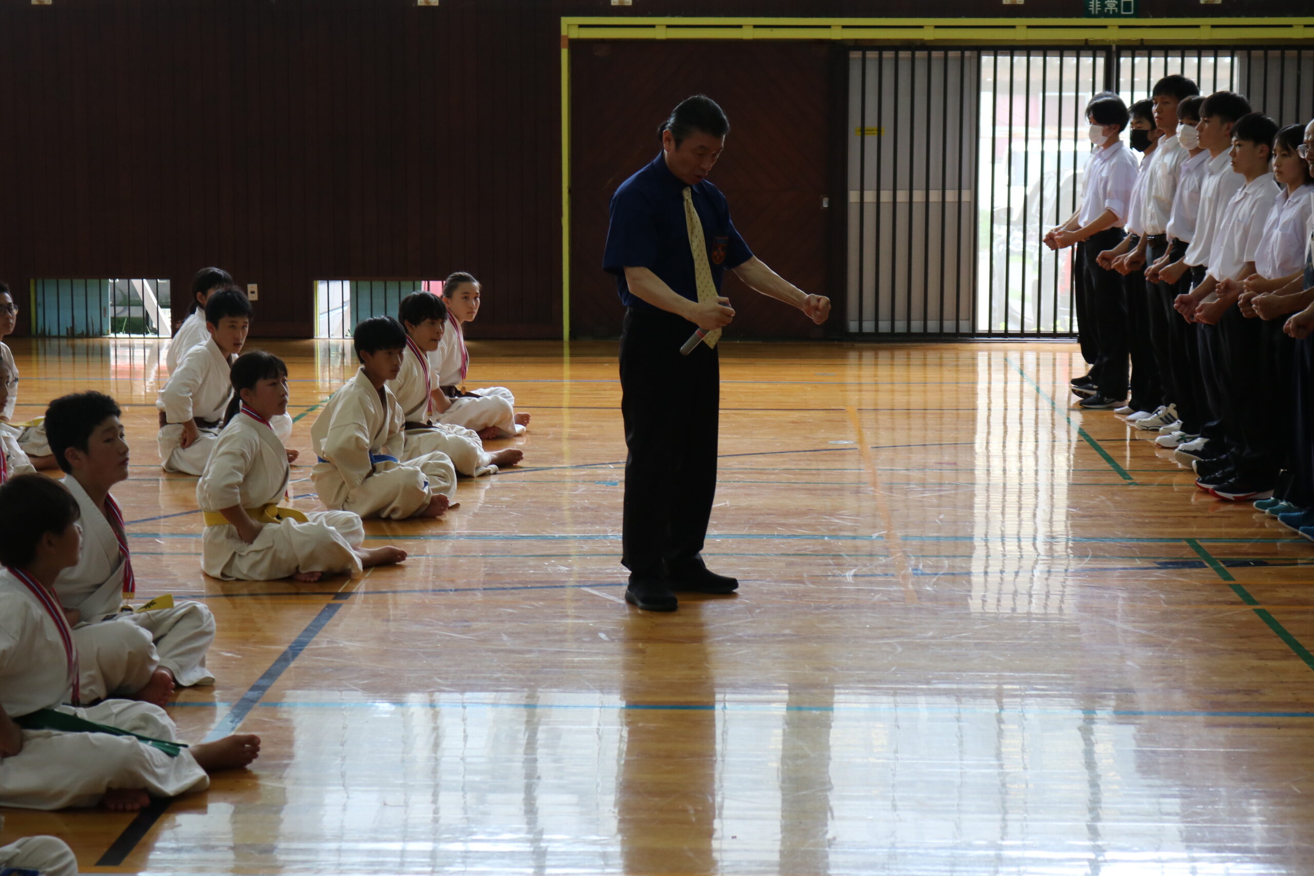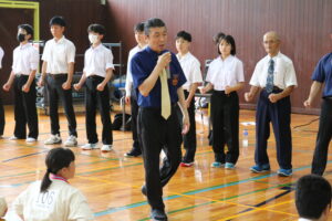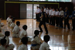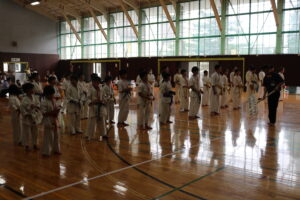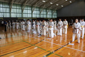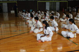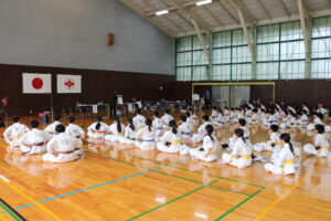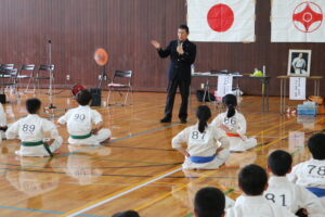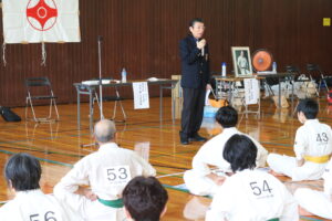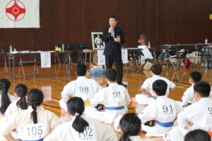 閉会式において、田畑主席師範より「今大会は臨場感があり、気迫を感じました。ただ、不動立ちや立ち居振る舞いが出来ていない選手も見受けられました。苦しい中でも、立ち居振る舞いをしっかり正して、試合に臨んで下さい。また、優勝者と準優勝者の差は紙一枚です。それは一番苦しいときに我慢出来たか、踏ん張ったか、攻撃したか。最後の紙一枚を超えるには普段の稽古で気持ちを込めて反復練習して、勝って驕らず、負けて腐らずの精神で の積み重ねていって下さい。ここからが始まりです。」と閉会のご挨拶がありました。