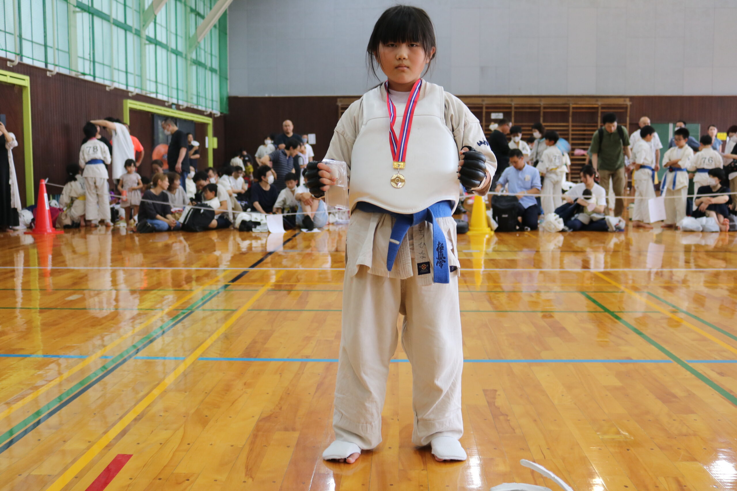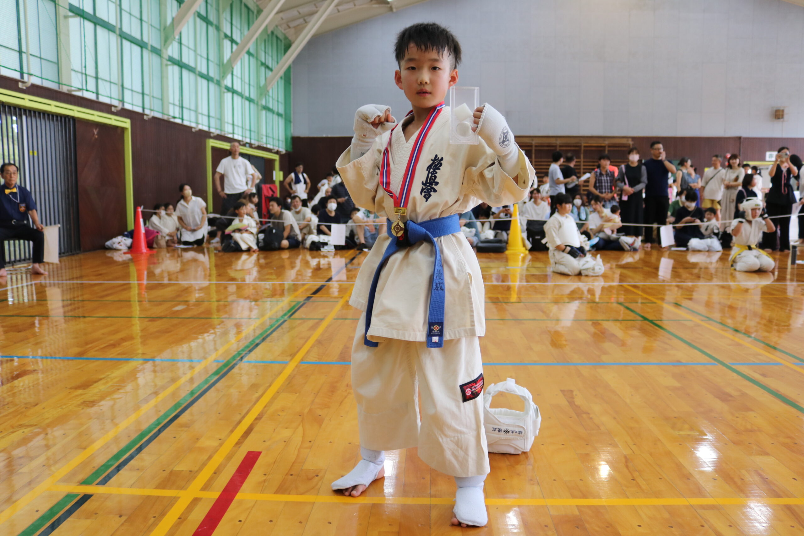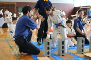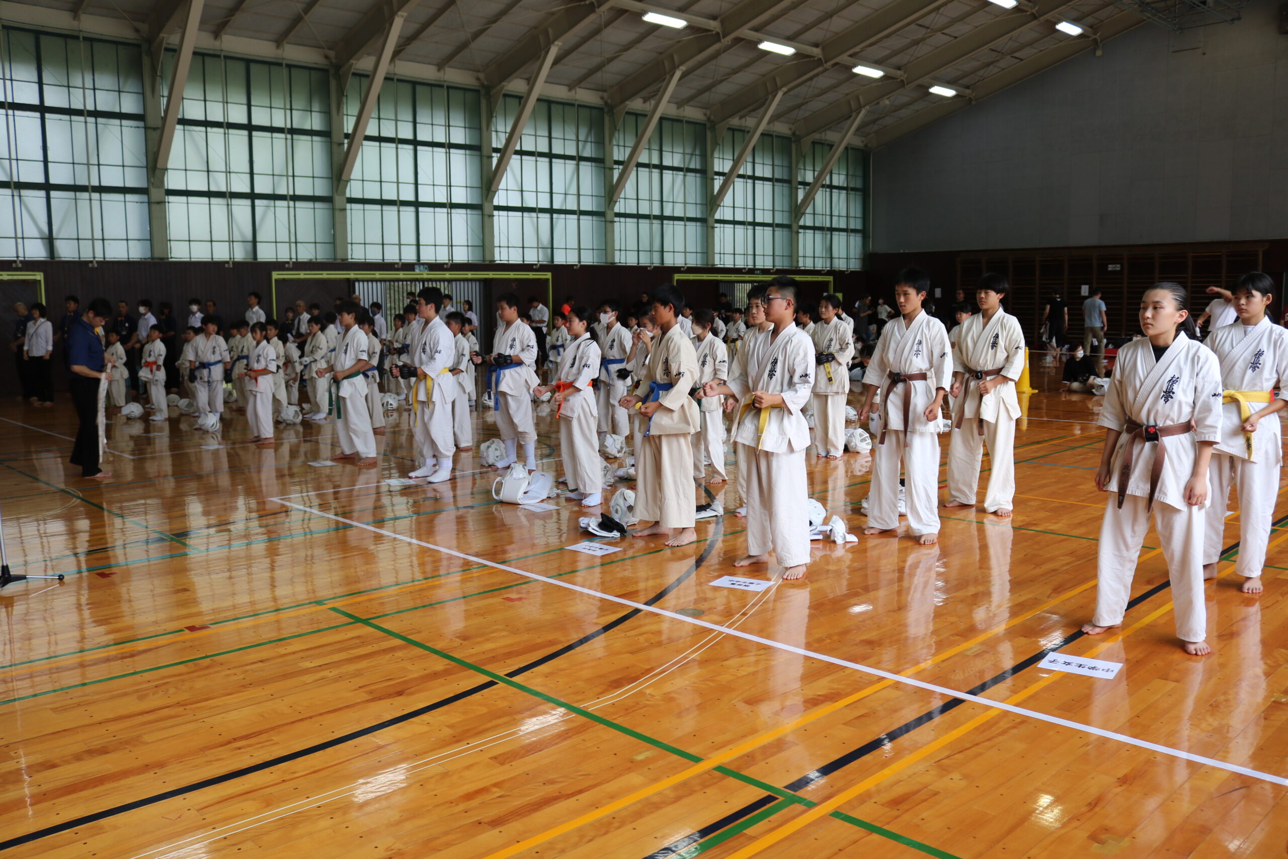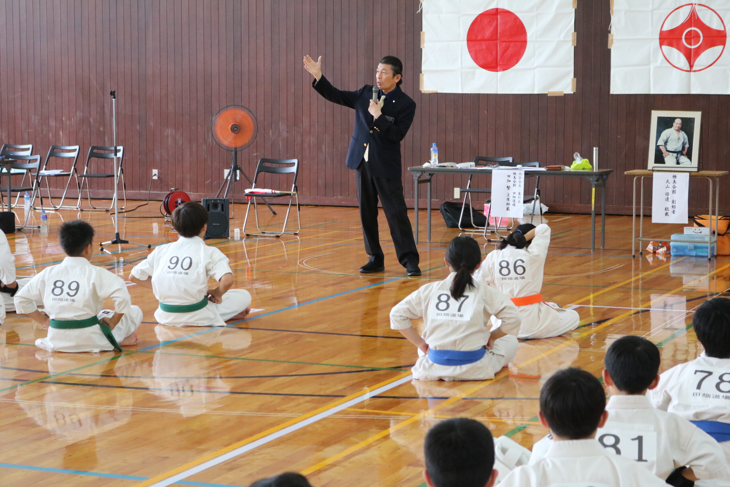 午後からの組手の部において、開会式で田畑繁主席師範より「極真カラテは、今から約60年前に大山倍達総裁が創始されました。大山総裁は『直接打撃制は殺傷能力が高いため、致命的なダメージを与えることが出来る。その為、強さ、弱さだけでなく、文武両道、又は文武二道が必要である。一道は稽古を通じて、自分の限界を知り、限界を乗り越え、無限なる自分の可能性を信じ、努力と忍耐を継続して、技量、力量を高める。もう一道はカラテの修業、修養を通じて、心を磨き、心を高め、人間性を作っていく。この二つが一つになって文武両道、文武二道』とおっしゃっています。日ごろ鍛えた文武両道の力をもってして、その力を発表するのが今日の大会です。大会は最大の修練の場です。戦った後は、相手の健闘、命、人格を尊重することで友情が生まれ、和合し、世界平和への第一歩を踏み出すことが出来ます。正々堂々、戦って下さい。」とのご挨拶がありました。
