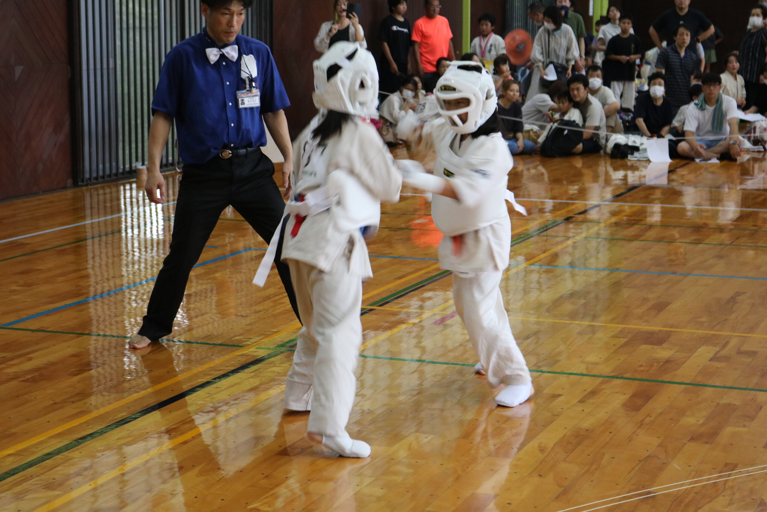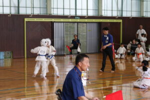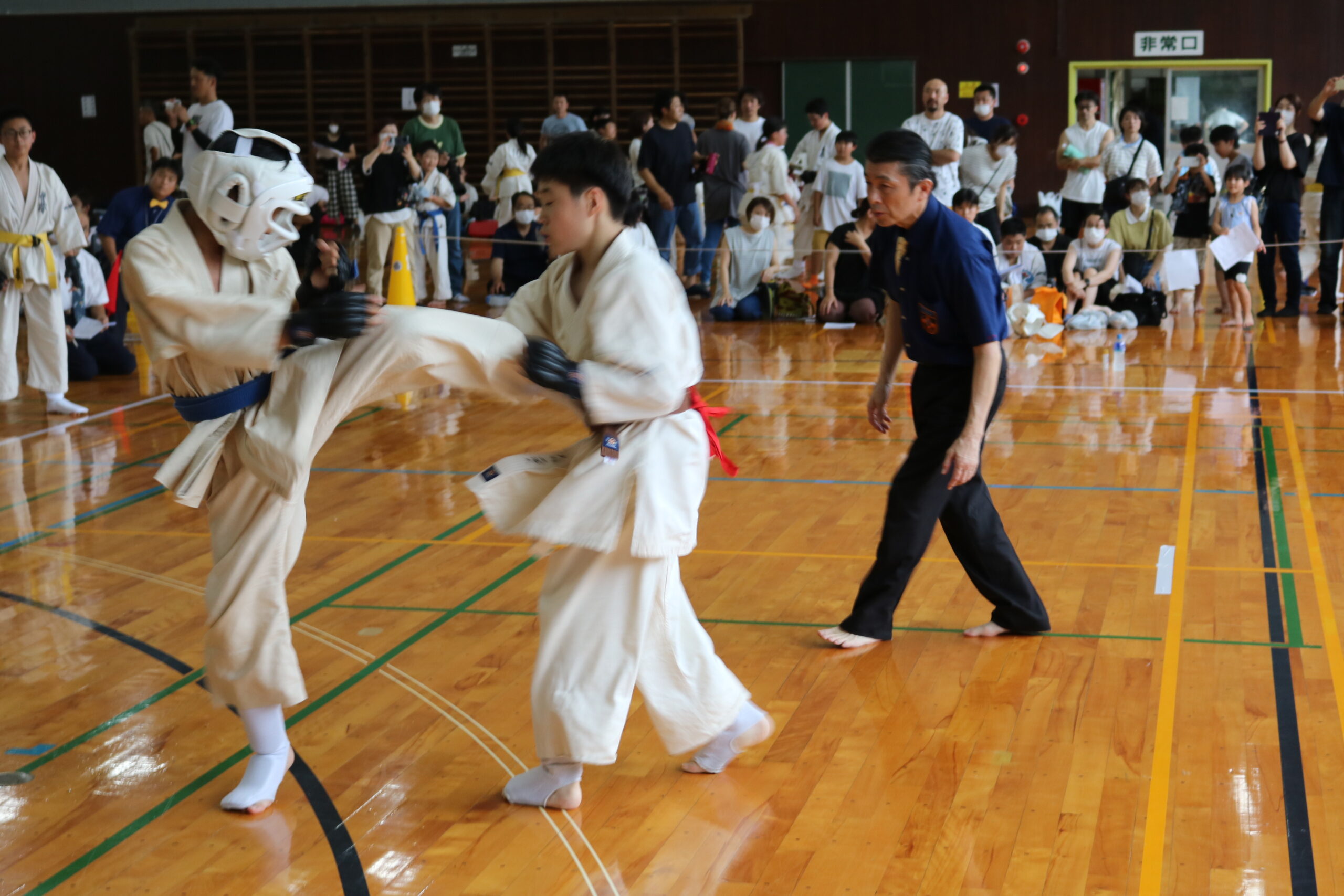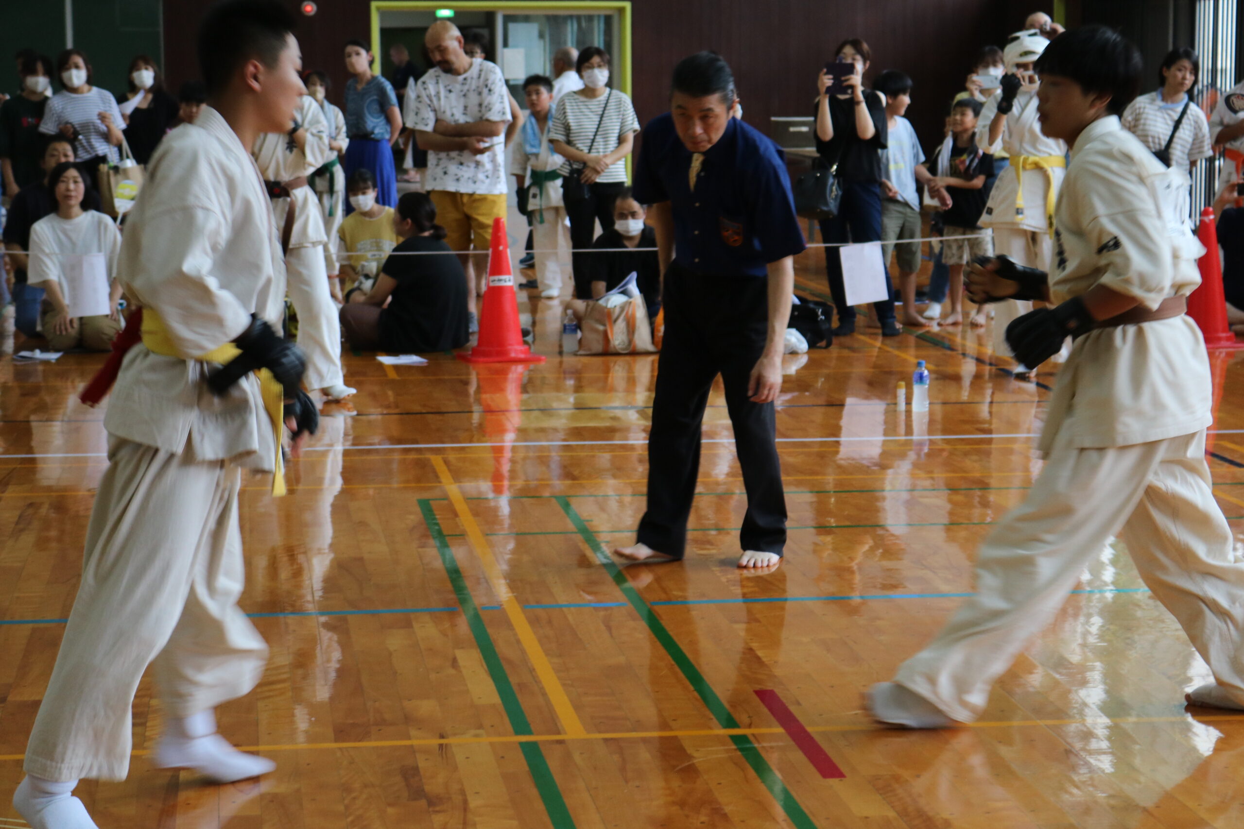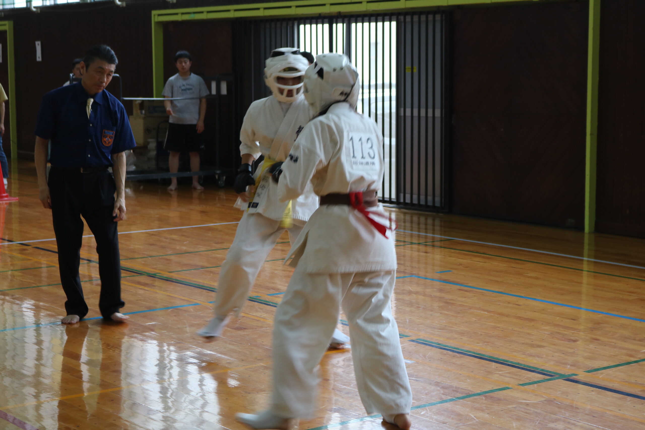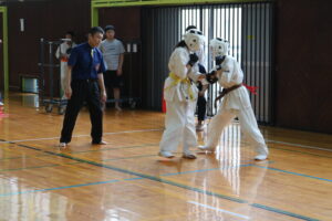 また、審判員の技術向上のため、Mコートの1回戦から決勝までの全20試合を田畑主席師範自らが主審を務められました。サブ副審制を用いて、育成を図りました。
