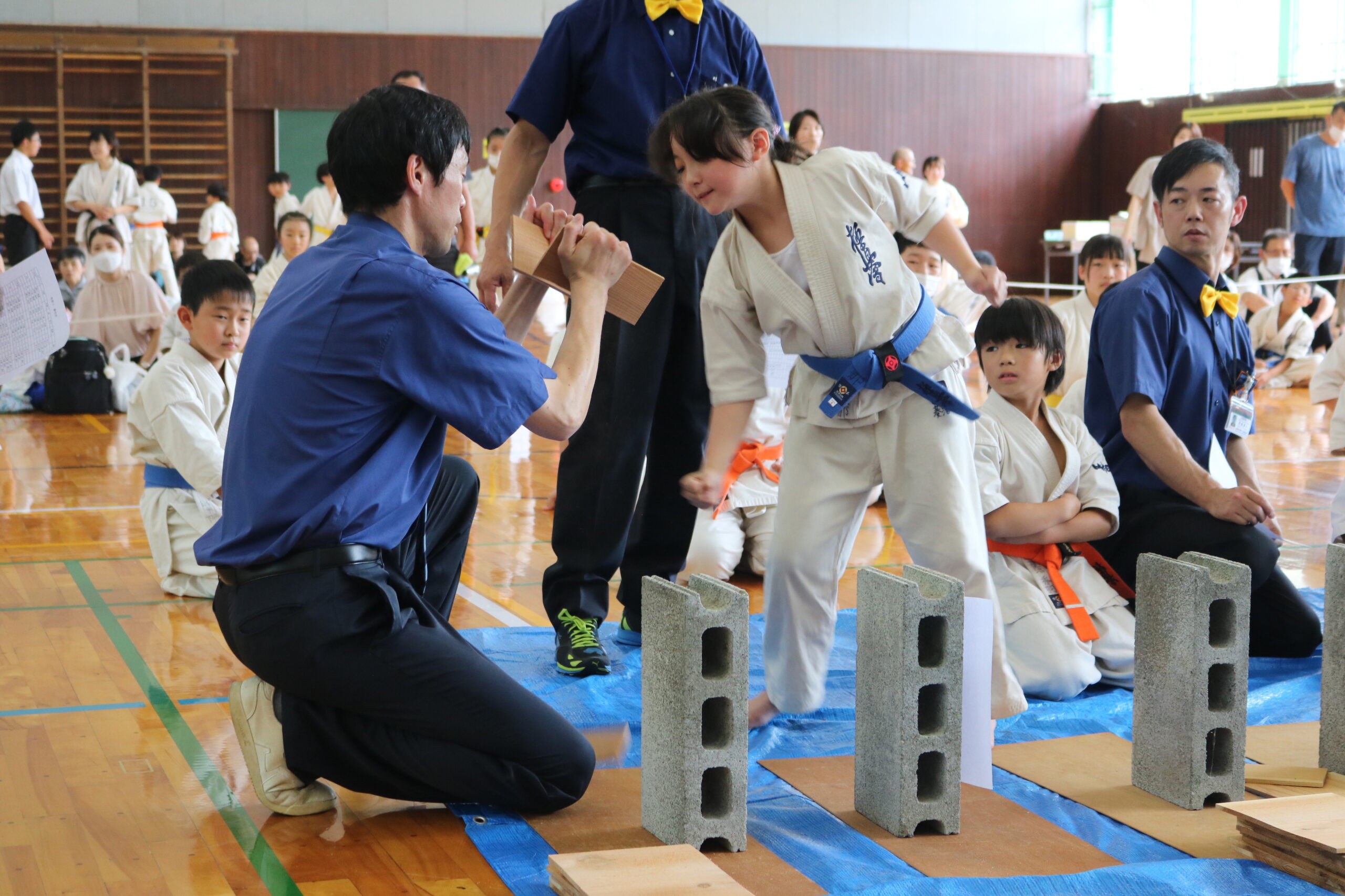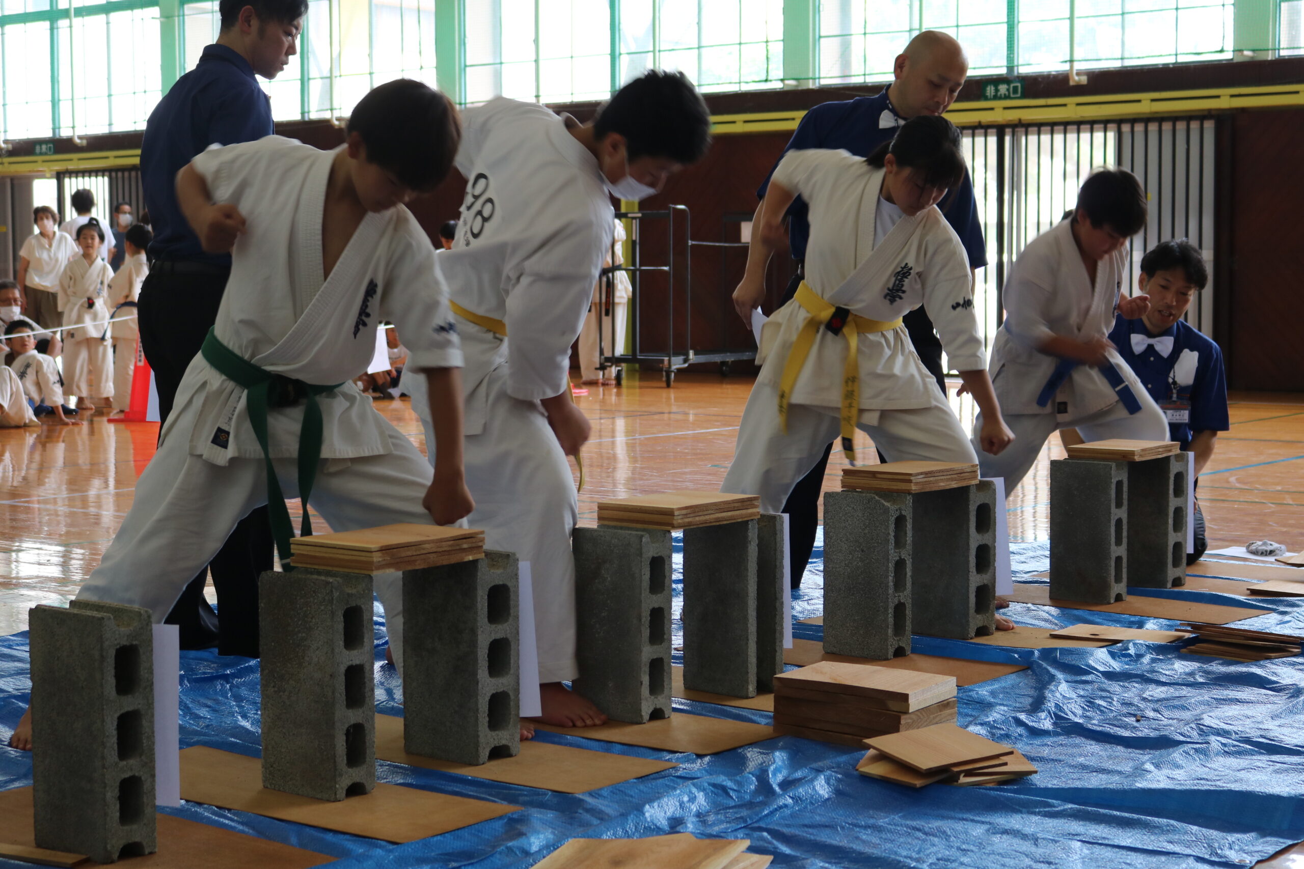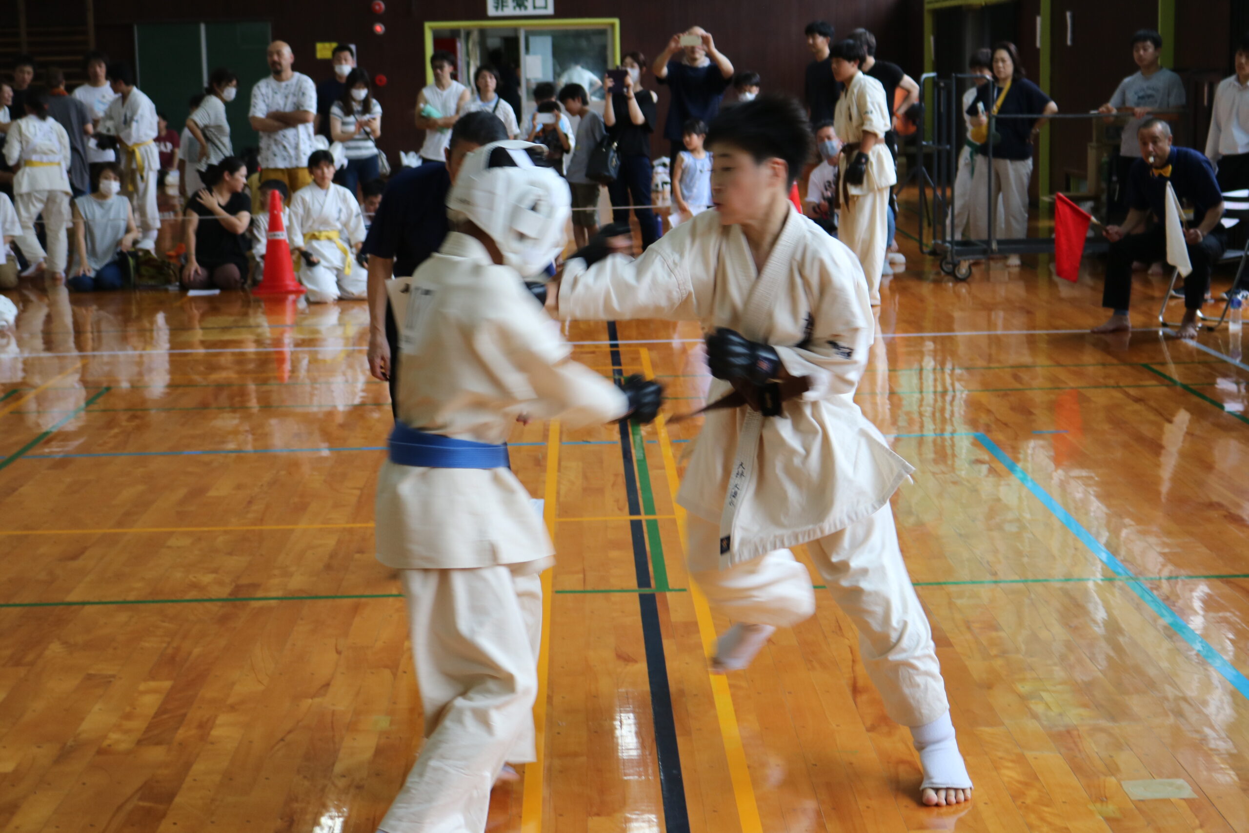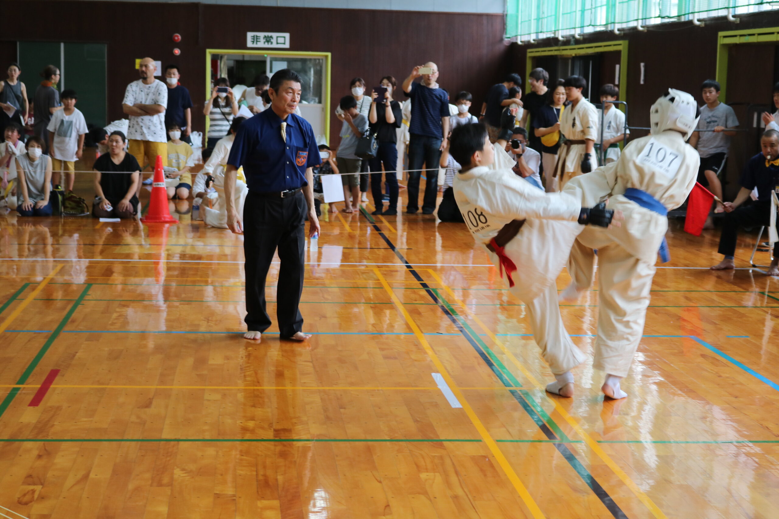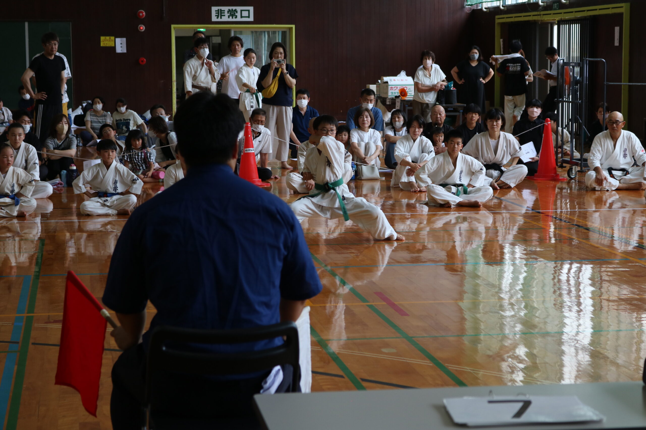また、審判員の技術向上のため、Mコートの1回戦から決勝までの全20試合を田畑主席師範自らが主審を務められました。サブ副審制を用いて、育成を図りました。