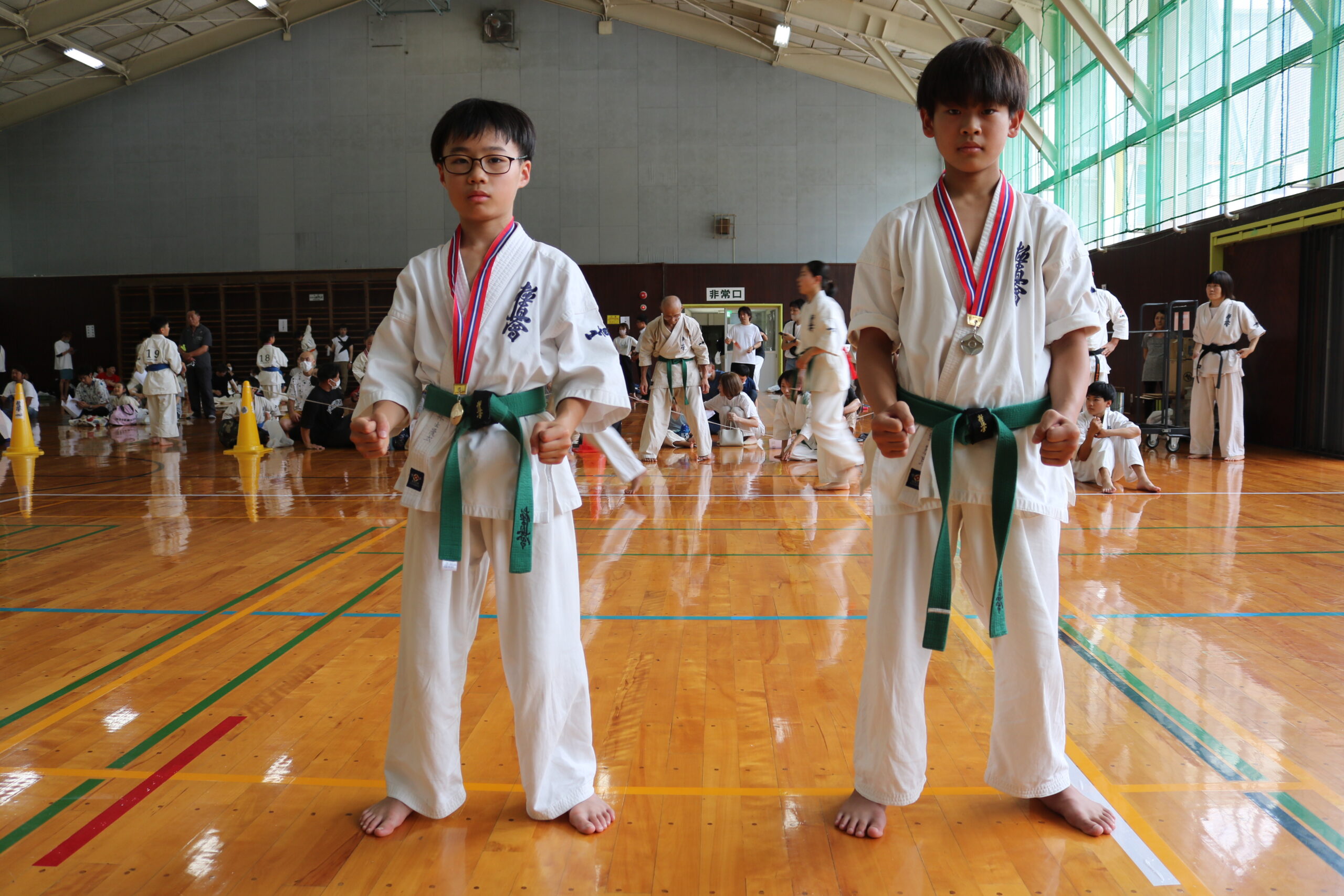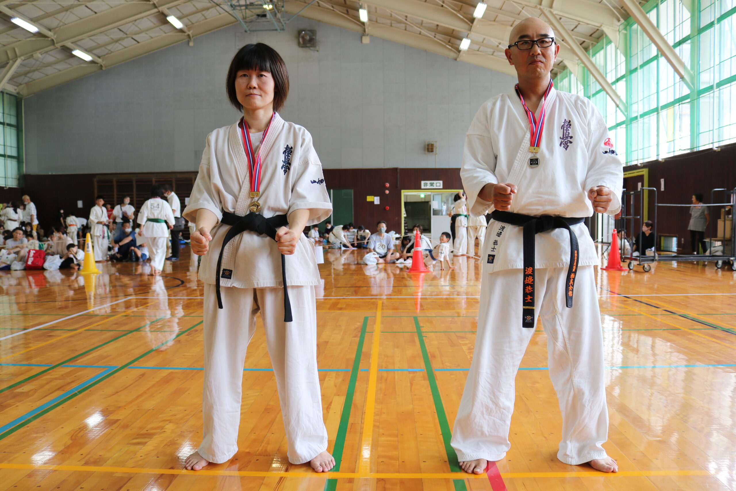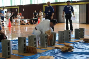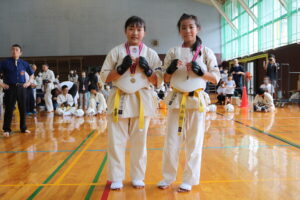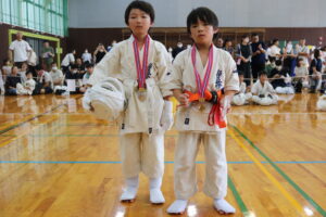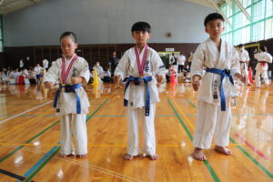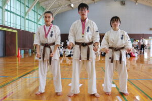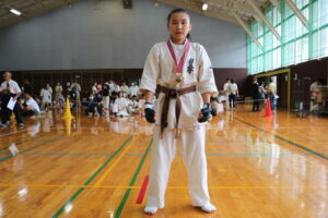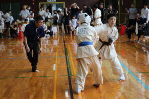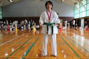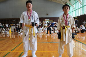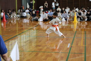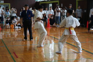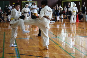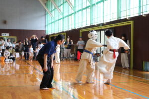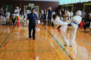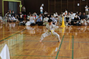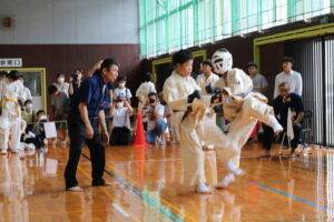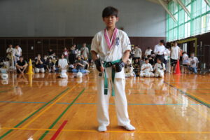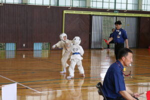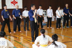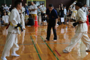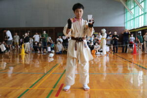 試合は、猛暑の中でも集中力を保ち、自らが磨いた型を存分に発揮していました。特に一般部上級は岸夏輝選手(大江)、鹿野いち花選手(寒河江)の決勝戦となりましたが、互いに日々の稽古で磨いた型を存分に発揮した結果、岸夏輝選手に凱歌が上がりました。