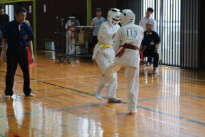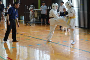 組手の部で、中学生男子重量級では、芦野聡哉選手(本部)と設楽昂輝選手(大江)という、互いに6月に行われた全日本少年少女大会出場者同士が決勝を戦いました。試合は、延長戦までもつれる内容でしたが、芦野選手の気迫が一歩上回り、勝利を手にしました。
