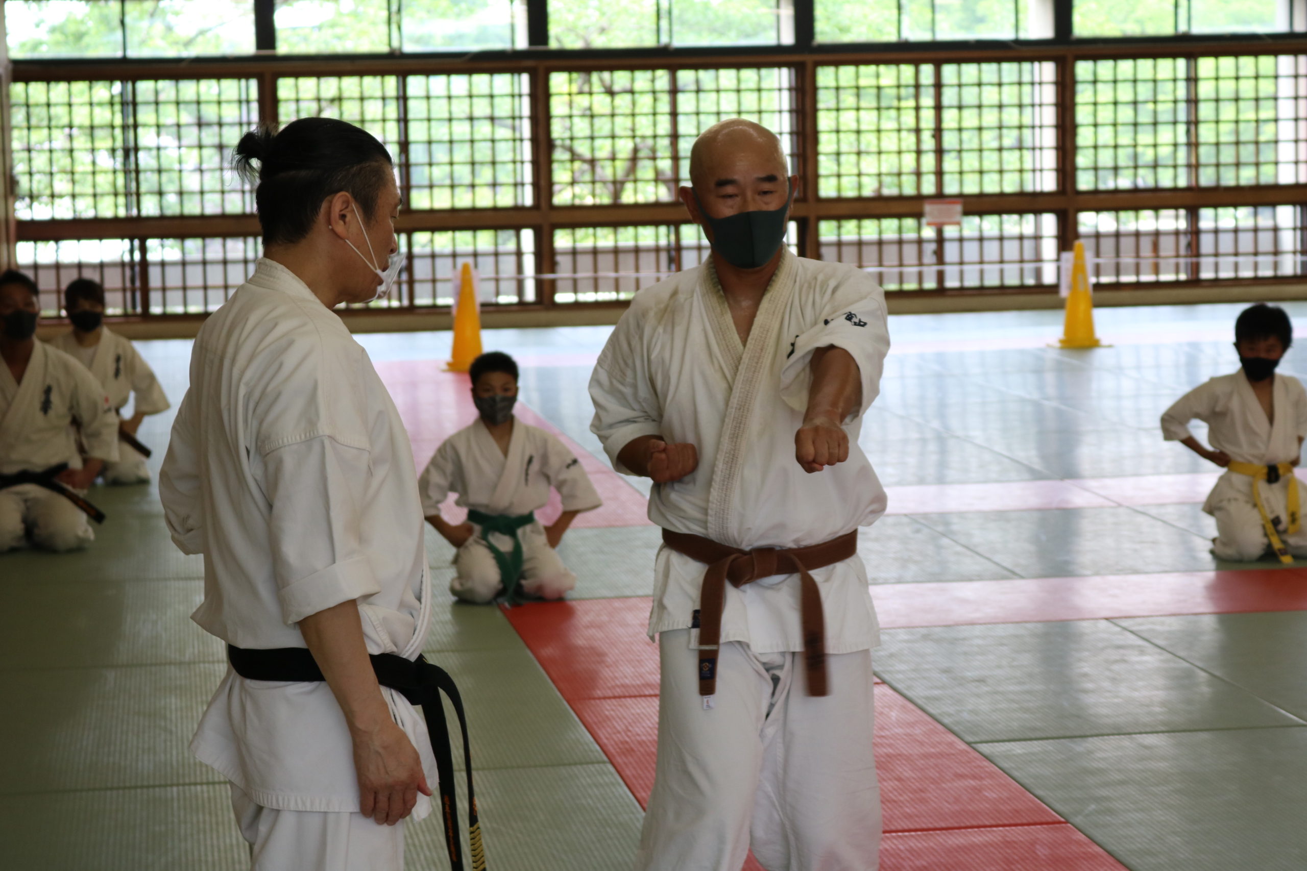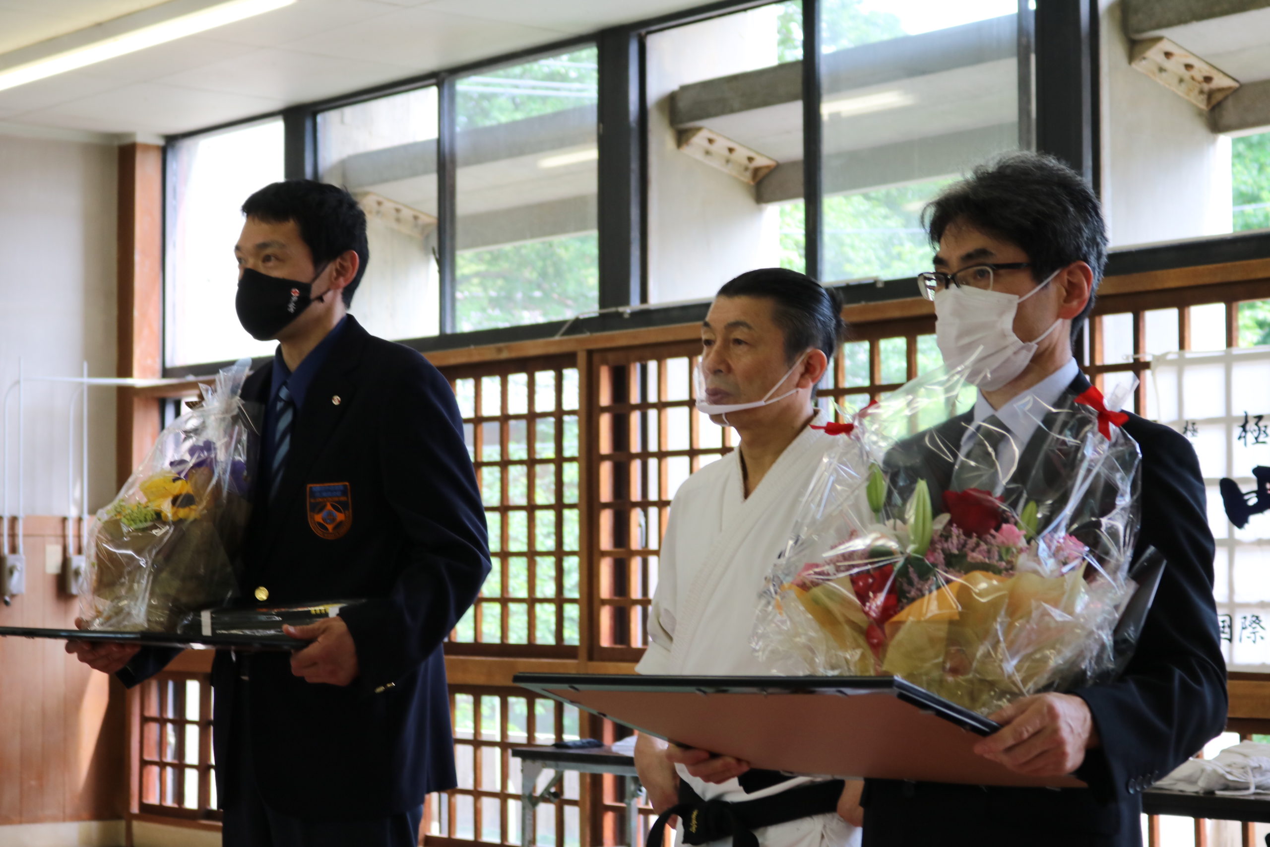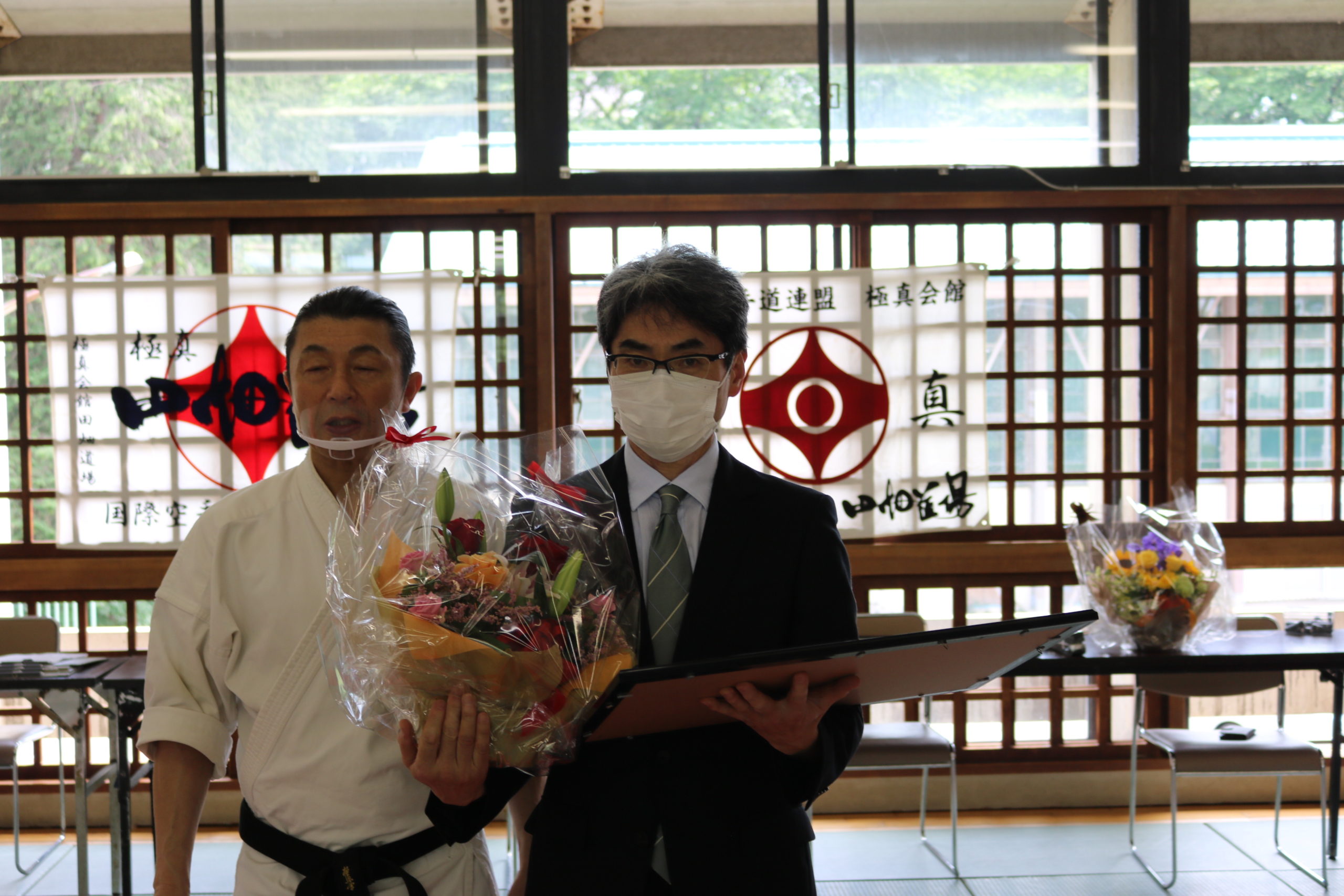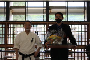 また、午後の審査開始前に松橋孝明初段と黒沼誠への四段昇段の帯と昇段状の授与式が行われ、二人ともこれからのさらなる稽古精進の決意を述べました。