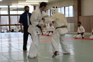 少年部も黄帯以上となると、審査内容も高度になりますが、コロナ禍で稽古内容も制約のある中、しっかりと力をつけている受審者も多く、田畑師範の神気と覇気の入った鋭い号令で、一般部は昇段審査受審者の気迫と緊張感はピークを迎えて、全員が積極的に審査項目に挑んでいました。 またこの日は、本部の松橋孝明1級が11年かけての昇段審査会で十人組手、米沢の山本郁子2級が5年半かけて七人組手に挑み、田畑師範の激励を受けて二人とも見事に完遂しました。受審者は声援ができないので、一人終わるたびごとに大きな拍手で闘魂を讃えました。松橋1級の10人目には、はじめから最後まで、拍手の雨で、松橋1級の奮起を促しました。特に松橋1級は連続組手終盤の厳しい場面も、田畑師範と毎週土曜日に行われているオンライン瞑想会で養った集中力で乗り切っての完遂でした。とても年齢が60代とは思えない組手でした。