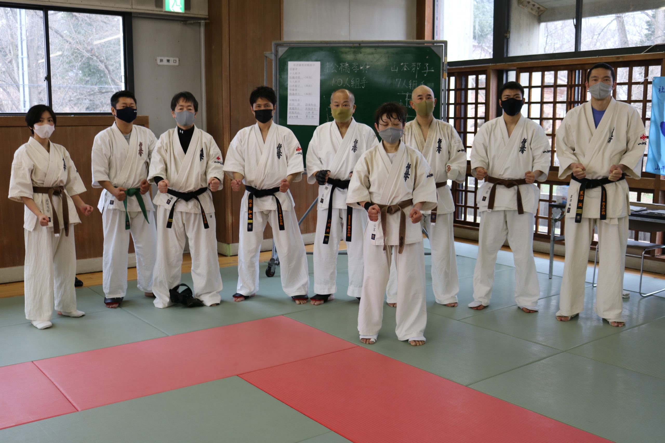少年部も黄帯以上となると、審査内容も高度になりますが、コロナ禍で稽古内容も制約のある中、しっかりと力をつけている受審者も多く、田畑師範の神気と覇気の入った鋭い号令で、一般部は昇段審査受審者の気迫と緊張感はピークを迎えて、全員が積極的に審査項目に挑んでいました。 またこの日は、本部の松橋孝明1級が11年かけての昇段審査会で十人組手、米沢の山本郁子2級が5年半かけて七人組手に挑み、田畑師範の激励を受けて二人とも見事に完遂しました。受審者は声援ができないので、一人終わるたびごとに大きな拍手で闘魂を讃えました。松橋1級の10人目には、はじめから最後まで、拍手の雨で、松橋1級の奮起を促しました。特に松橋1級は連続組手終盤の厳しい場面も、田畑師範と毎週土曜日に行われているオンライン瞑想会で養った集中力で乗り切っての完遂でした。とても年齢が60代とは思えない組手でした。