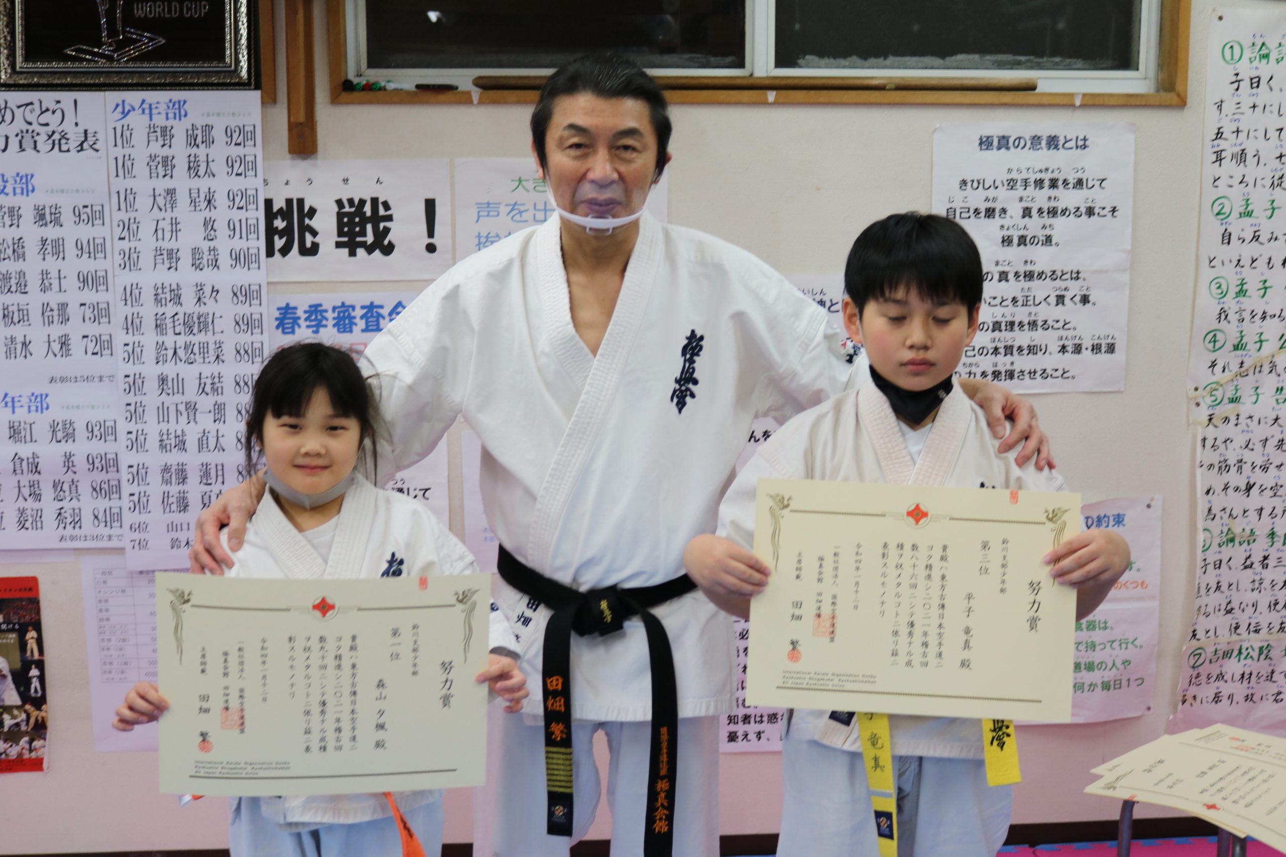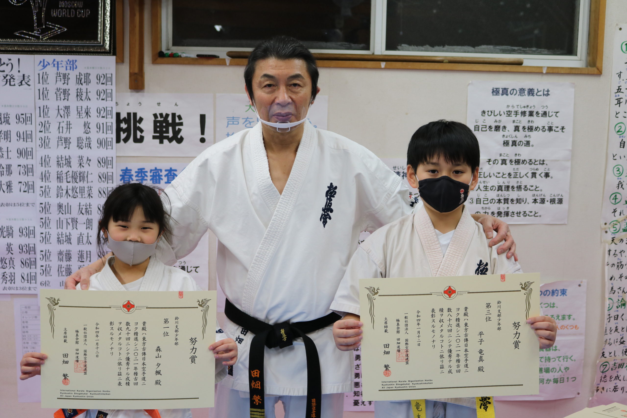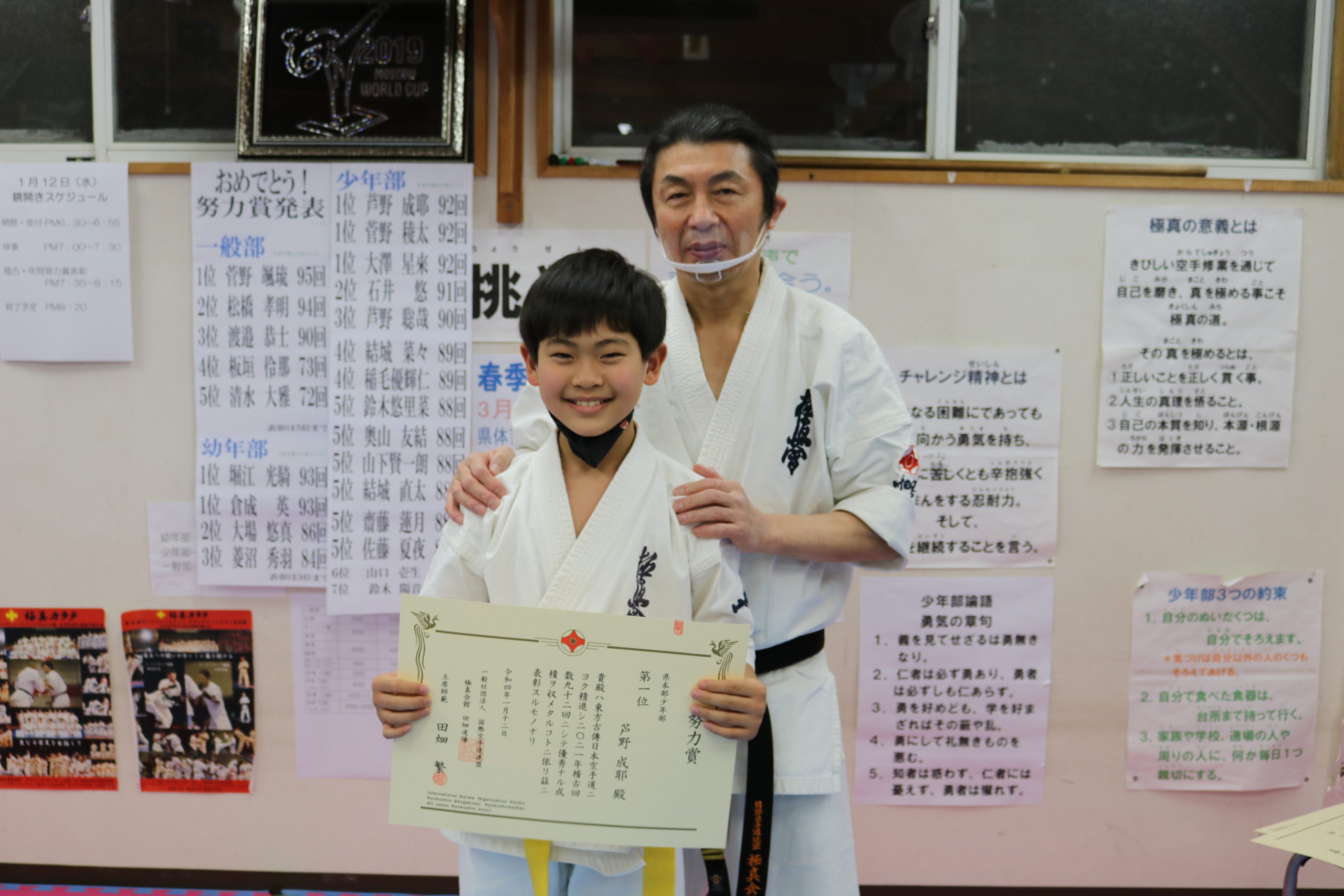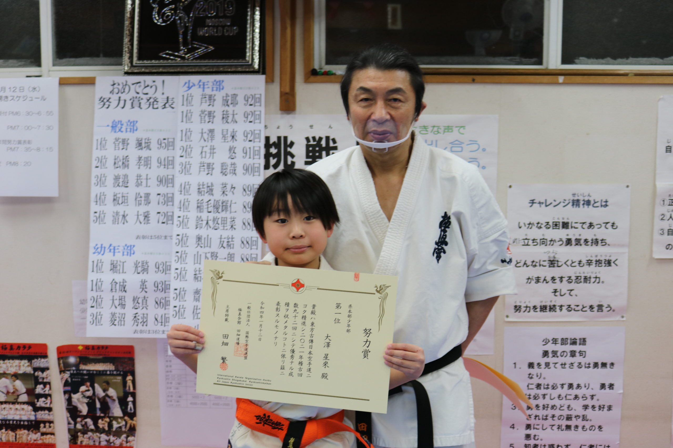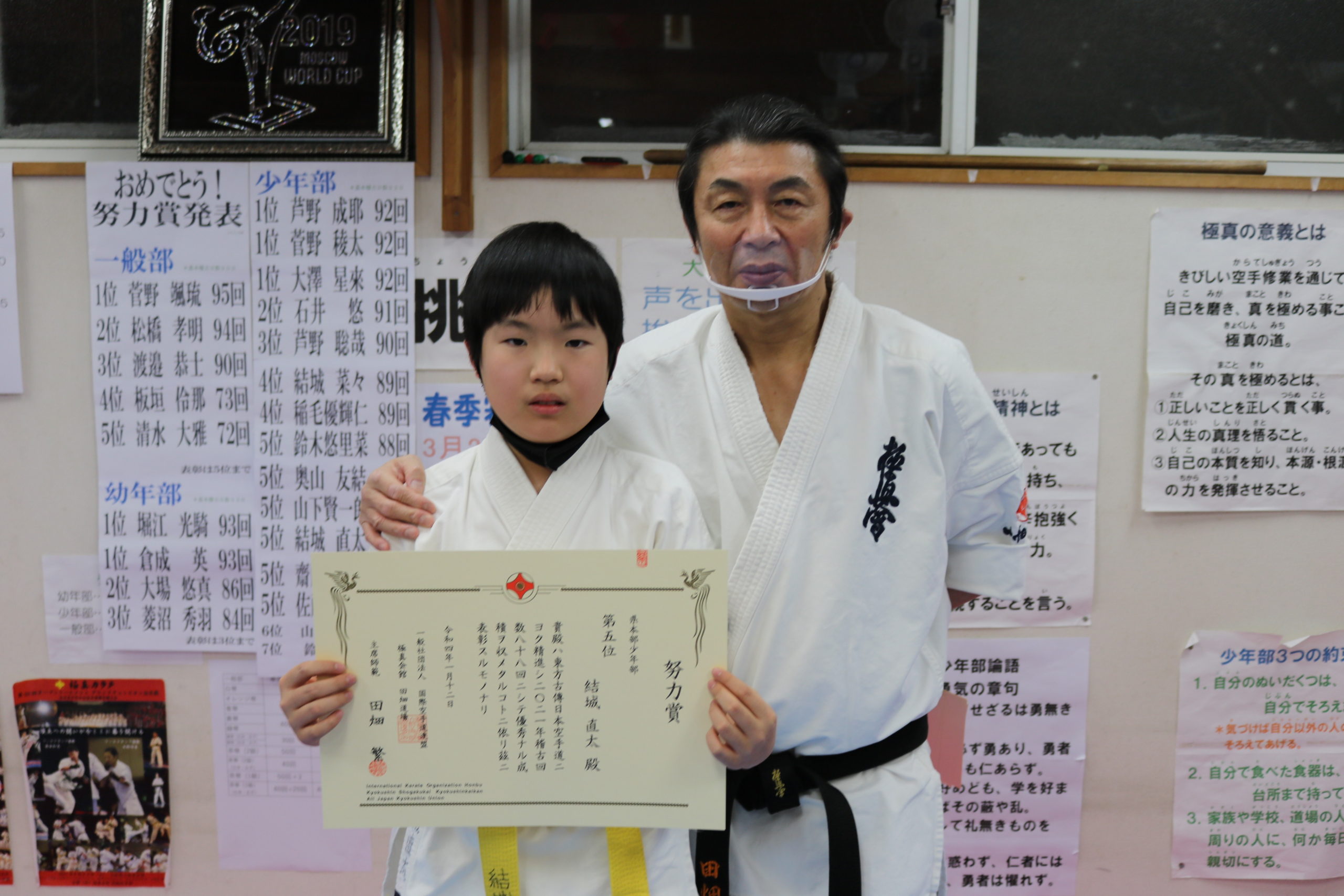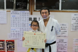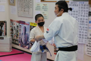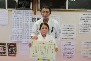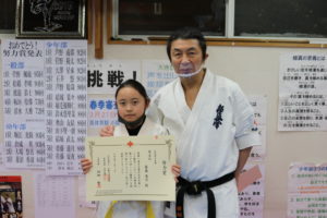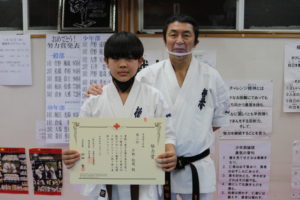 神事の後は、突き100本、蹴り100本の基本稽古で汗を流し、田畑師範からの年間努力賞の表彰が行われ、盛大な拍手と共に一年間の努力が讃えられました。