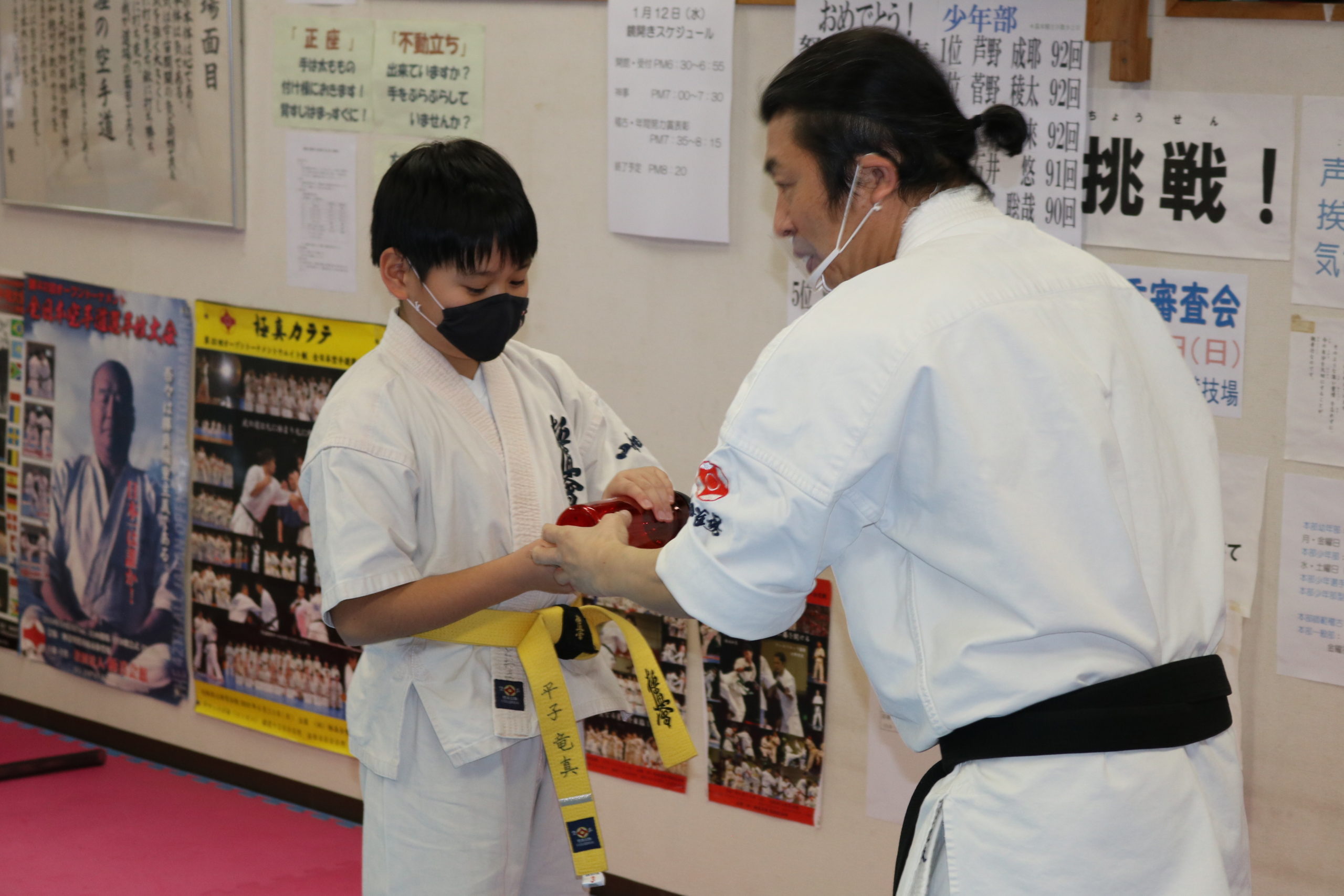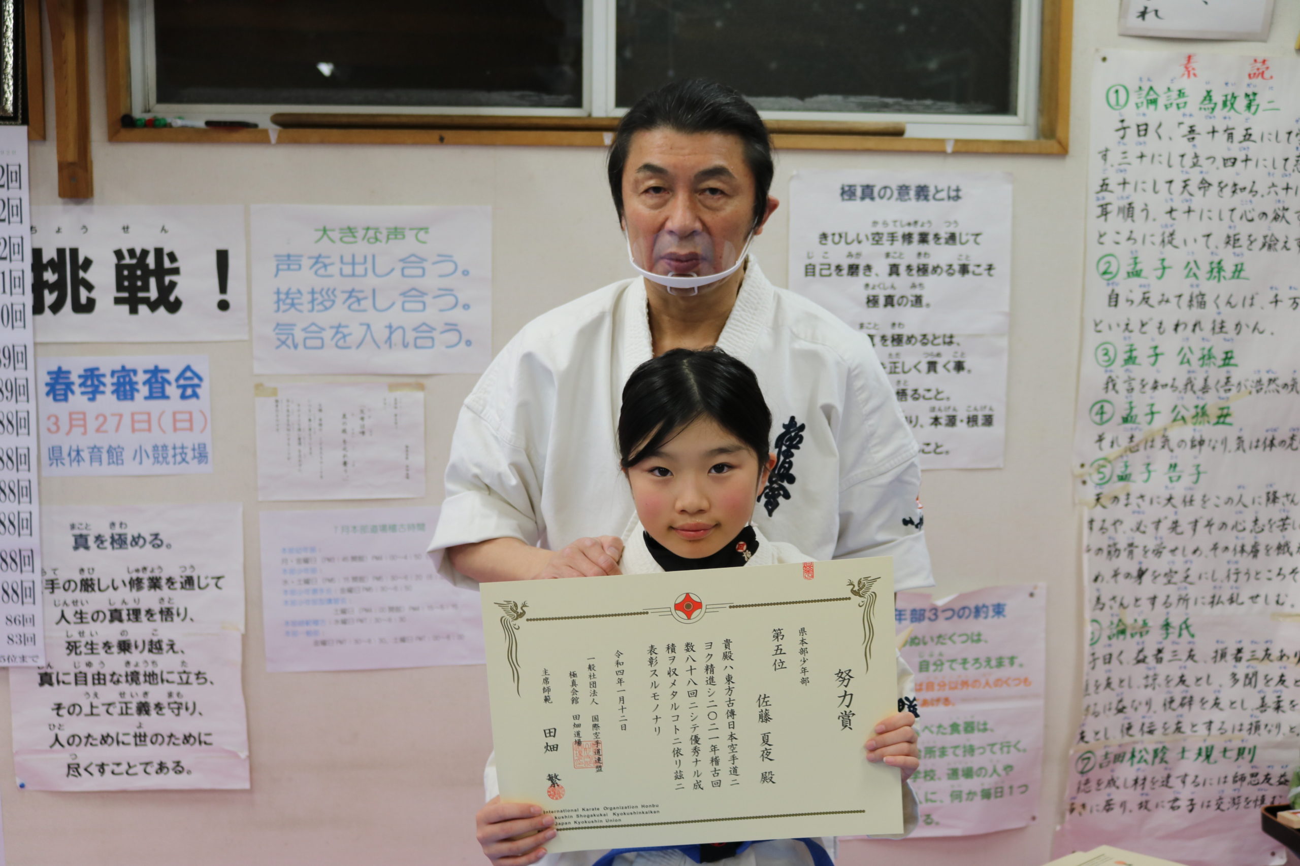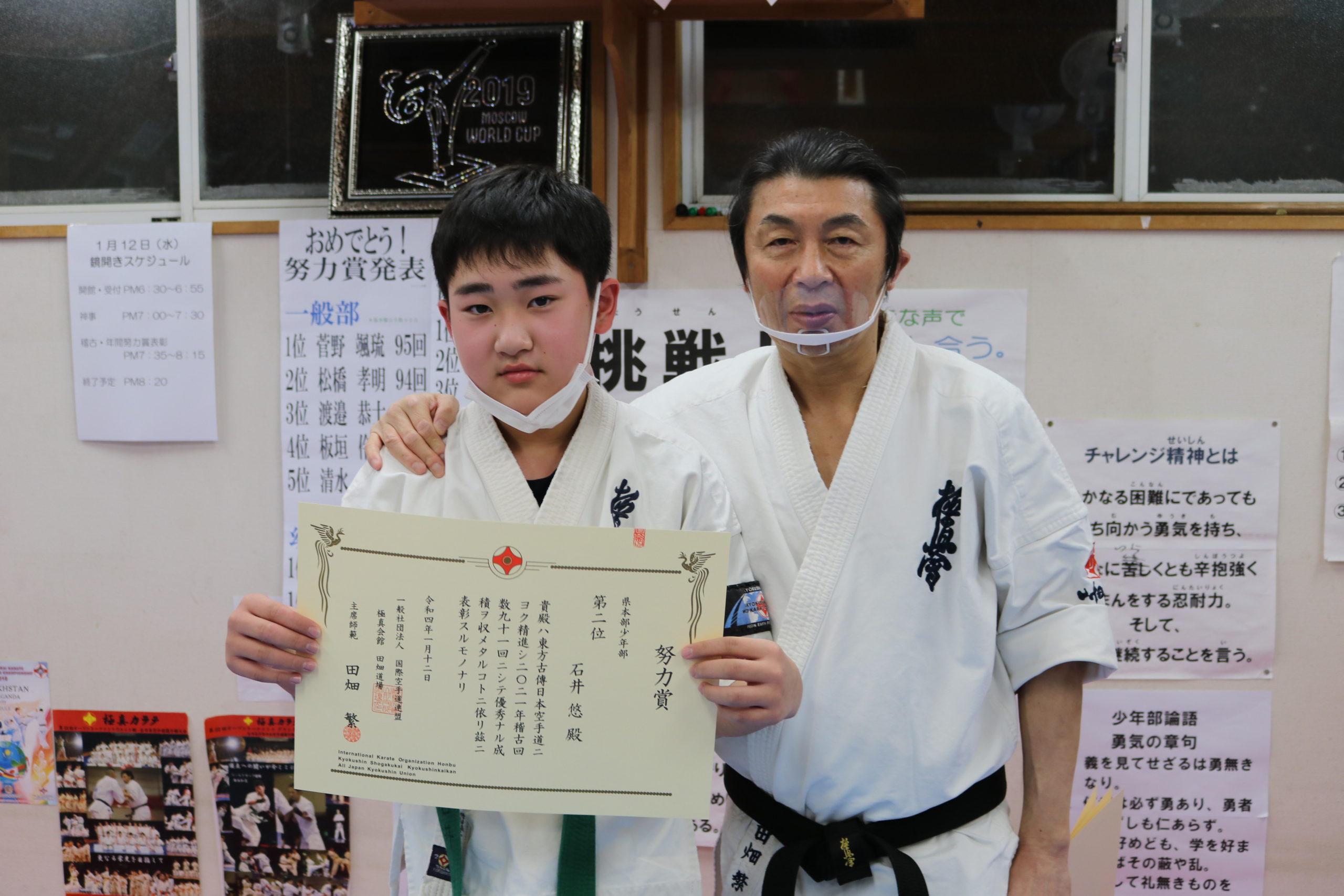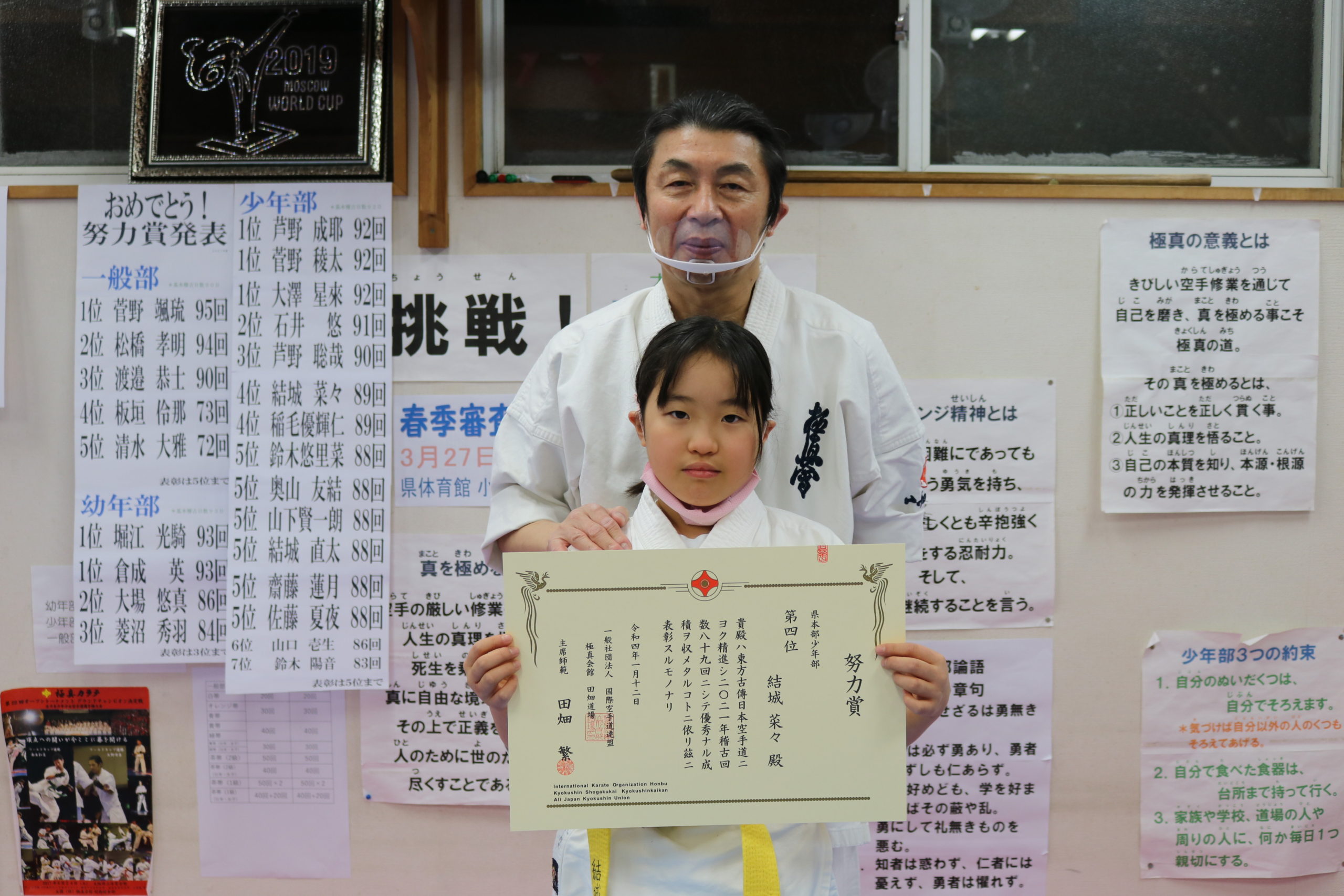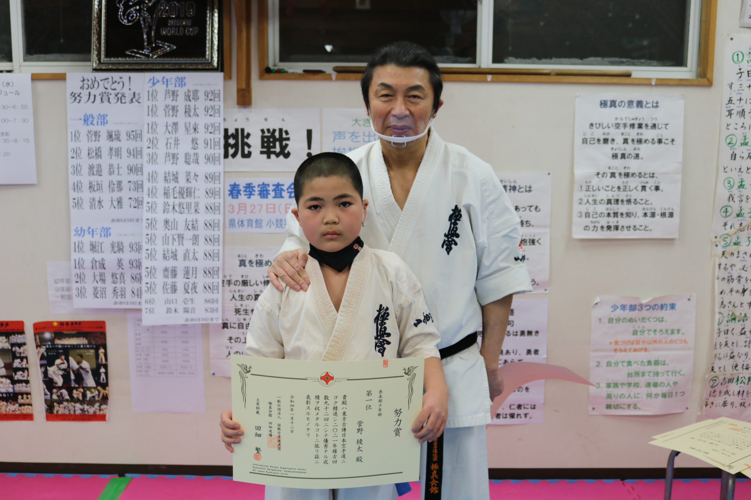 神事の後は、突き100本、蹴り100本の基本稽古で汗を流し、田畑師範からの年間努力賞の表彰が行われ、盛大な拍手と共に一年間の努力が讃えられました。