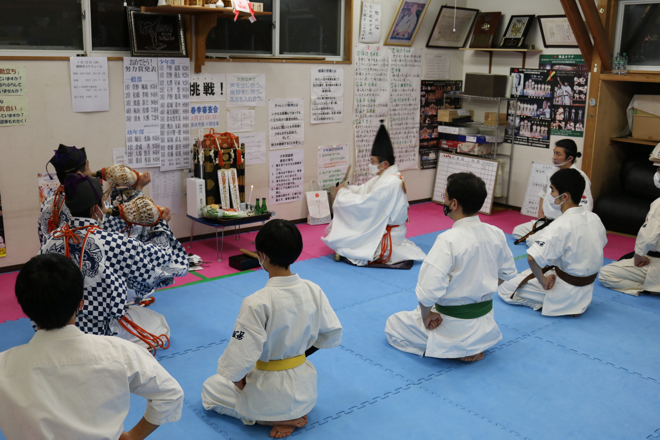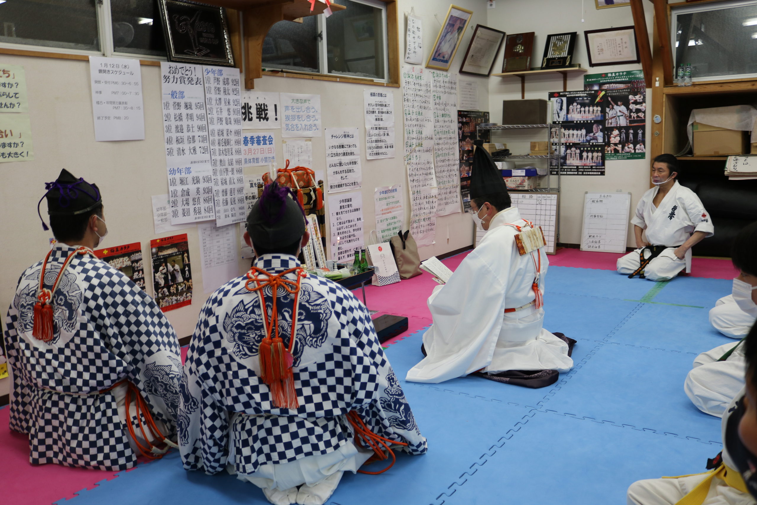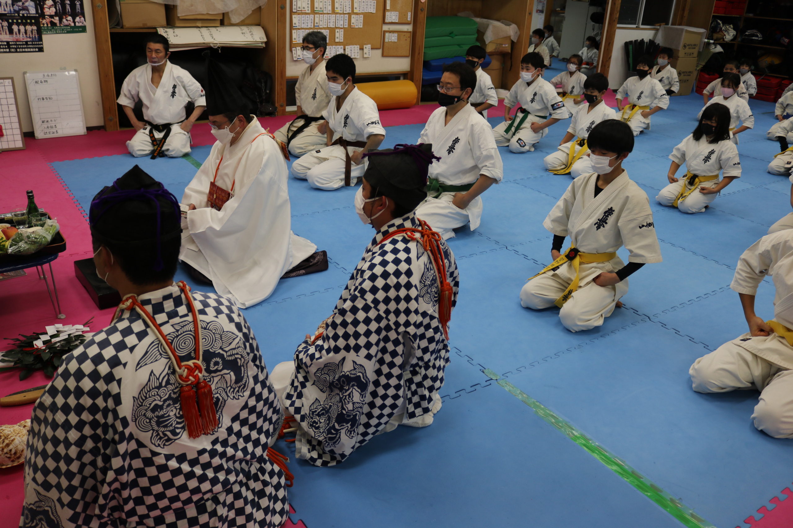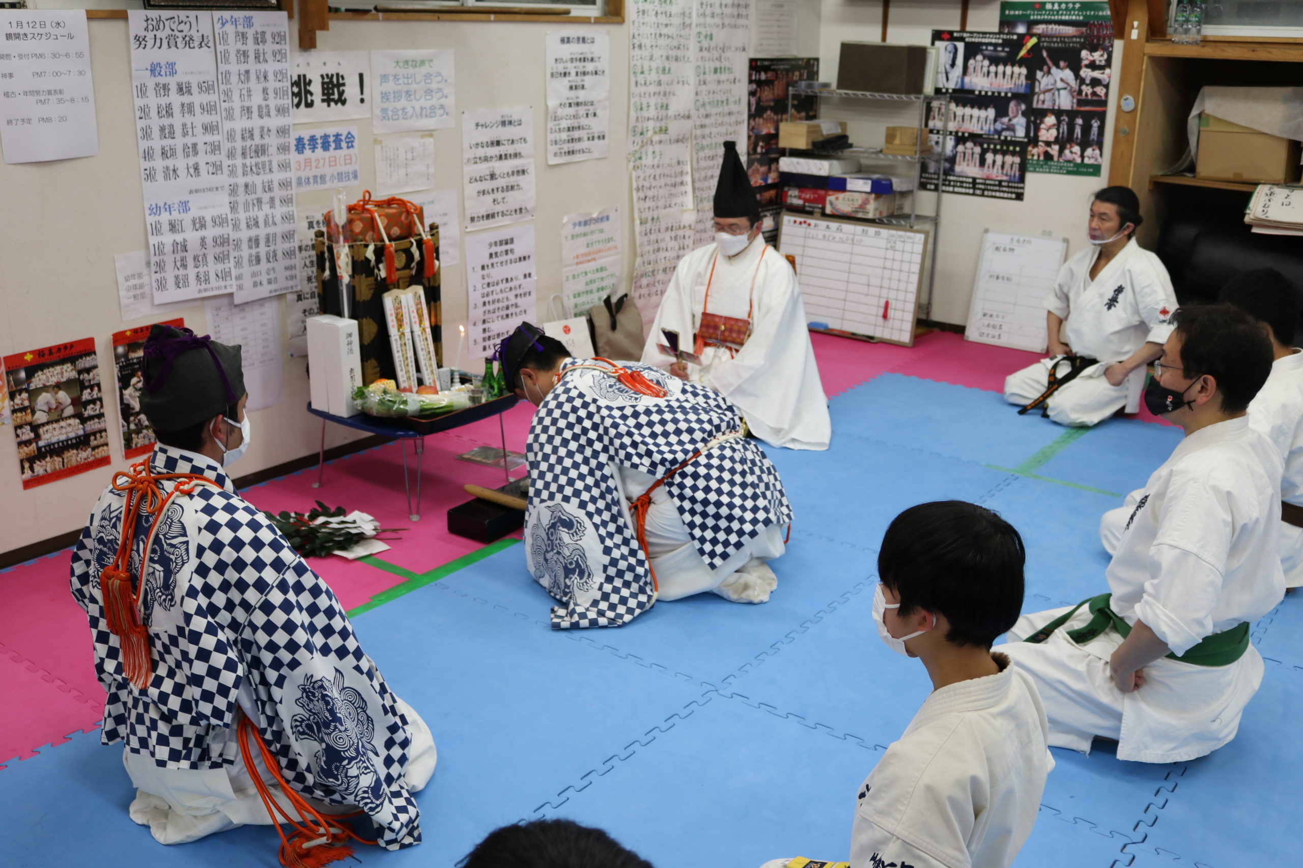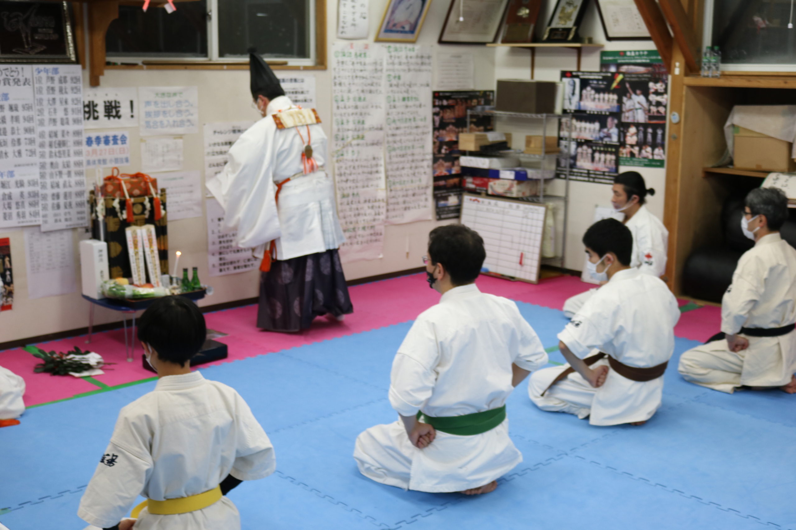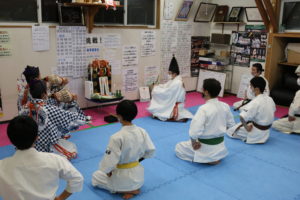 気温も低く、悪天候の中ではありましたが、昨年はコロナで叶わなかったため2年ぶりとなる、3名の出羽三山神社勧進の方々による神事に一同、厳粛な気持ちで臨みました。神事の最後に神官の吉住先生から「他力本願にならず、自分の力を信じ自力本願で、いかなる困難を乗り越えていける力を稽古を通じて養っていってください。」との激励のお言葉を頂きました。