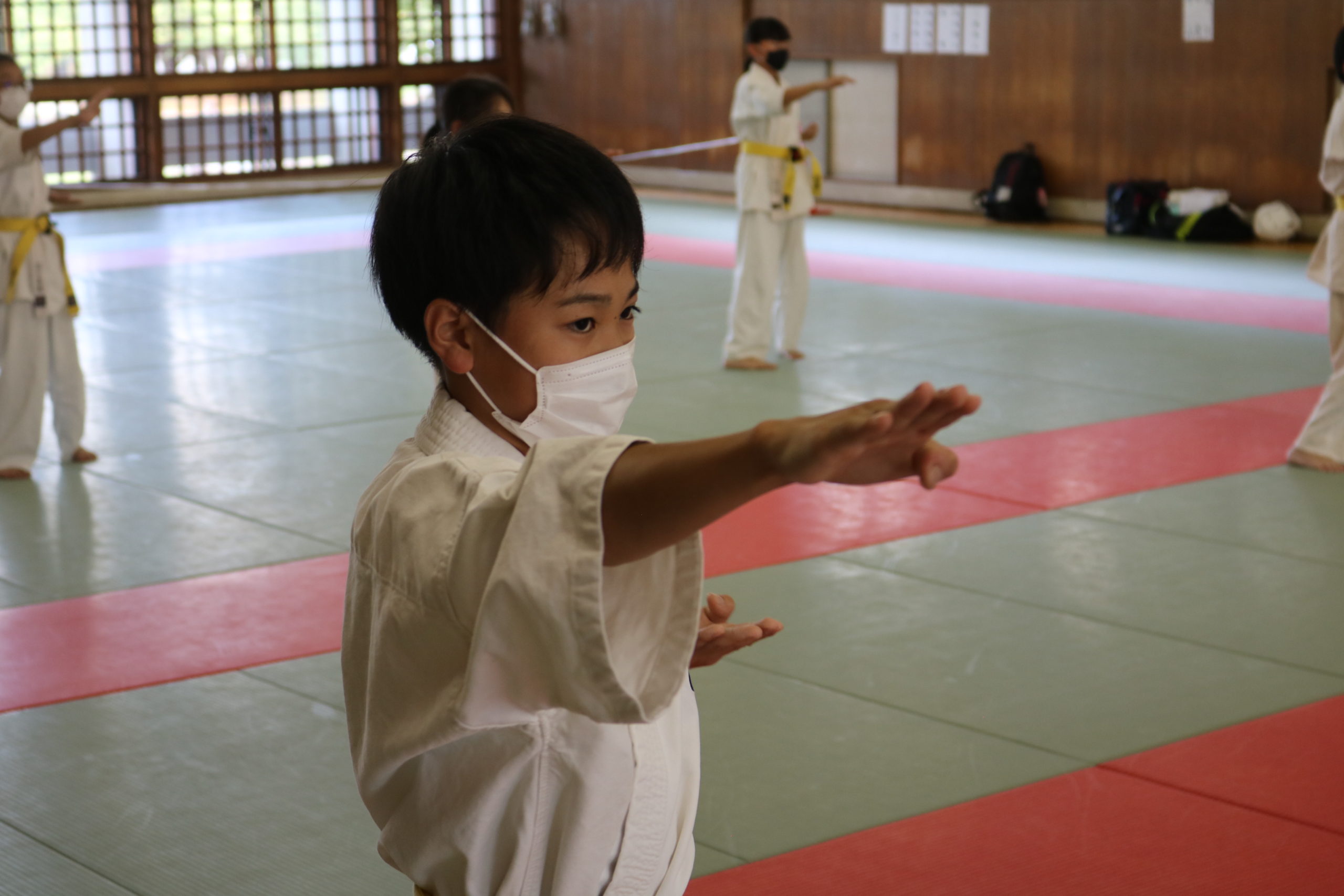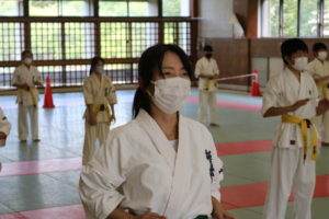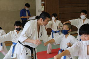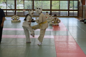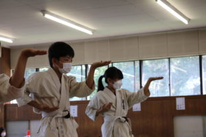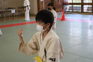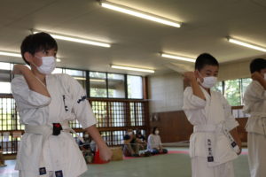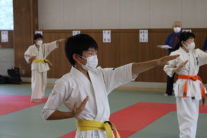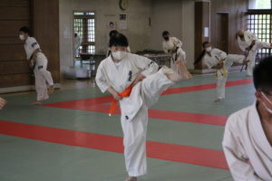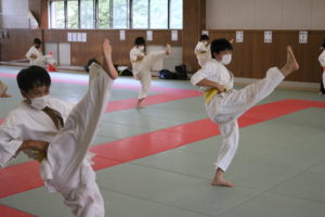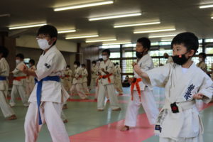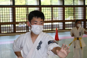 暑さに負けず、もてる力、気力を振り絞って、基本、移動、補強、型、組手と厳しい状況の中必死に頑張っていました。
