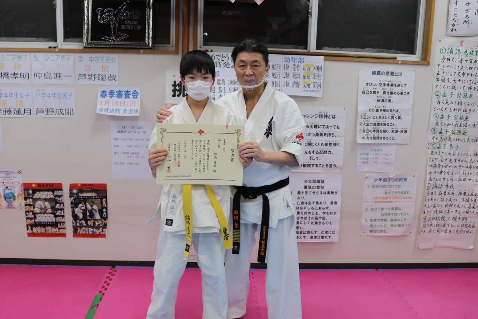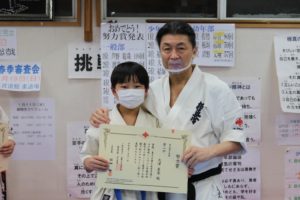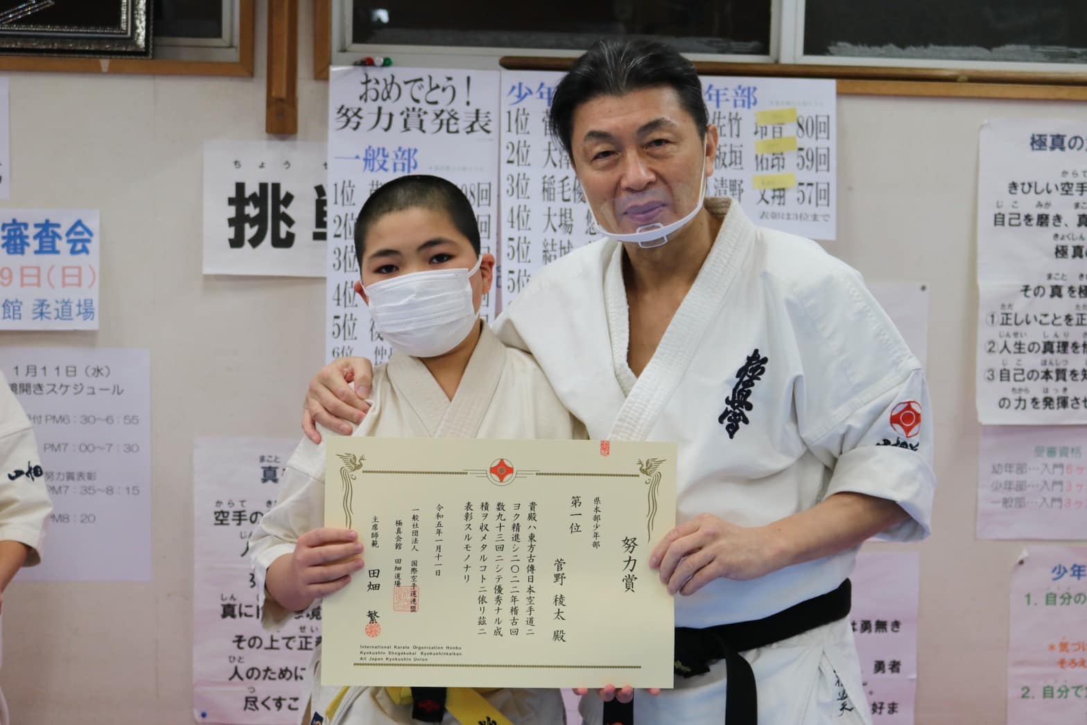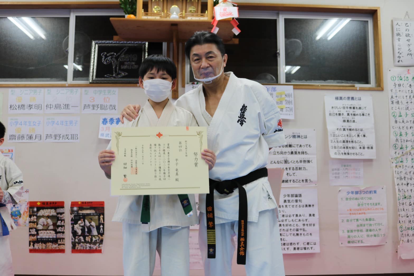 田畑師範より、年間努力賞おめでとうございます。継続はちから、一本一本の技の積み重ね、一回一回の稽古の積み重ねが、今の自分を作っています。三合法のチカラを信じて、今年も更なる努力に邁進して参りましょう。とおっしゃってました。